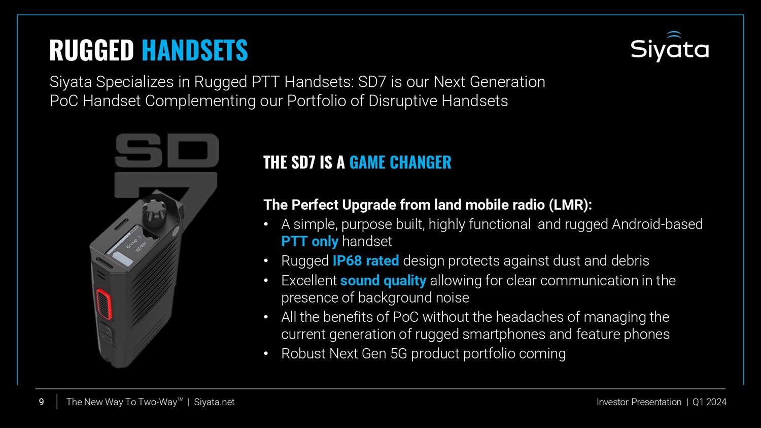 8 SIYATA’S PUSH - TO - TALK OVER CELLULAR ECOSYSTEM Siyata is the only vendor to wireless carriers who offers differentiated mobile and in - vehicle POC solutions. RUGGED HANDSETS IN - VEHICLE SOLUTIONS Siyata also sells Cellular Boosters to improve cellular signal in buildings or in vehicles for our customers, and Siyata Real Time View , a video streaming system for first responder or enterprise fleet vehicles. Investor Presentation | Q1 2024 The New Way To Two - Way TM | Siyata.net