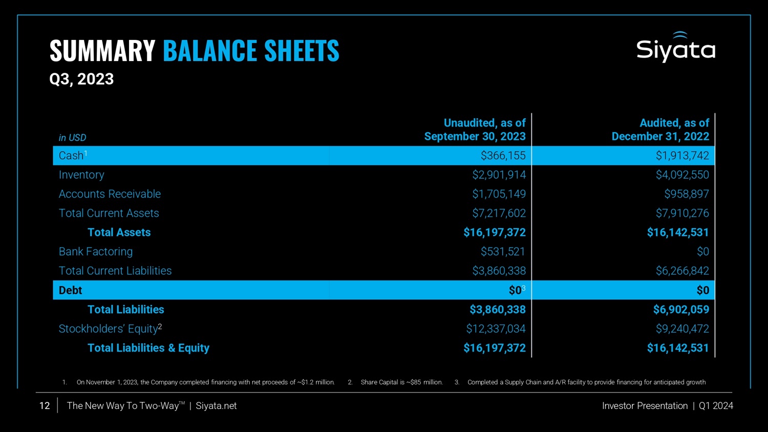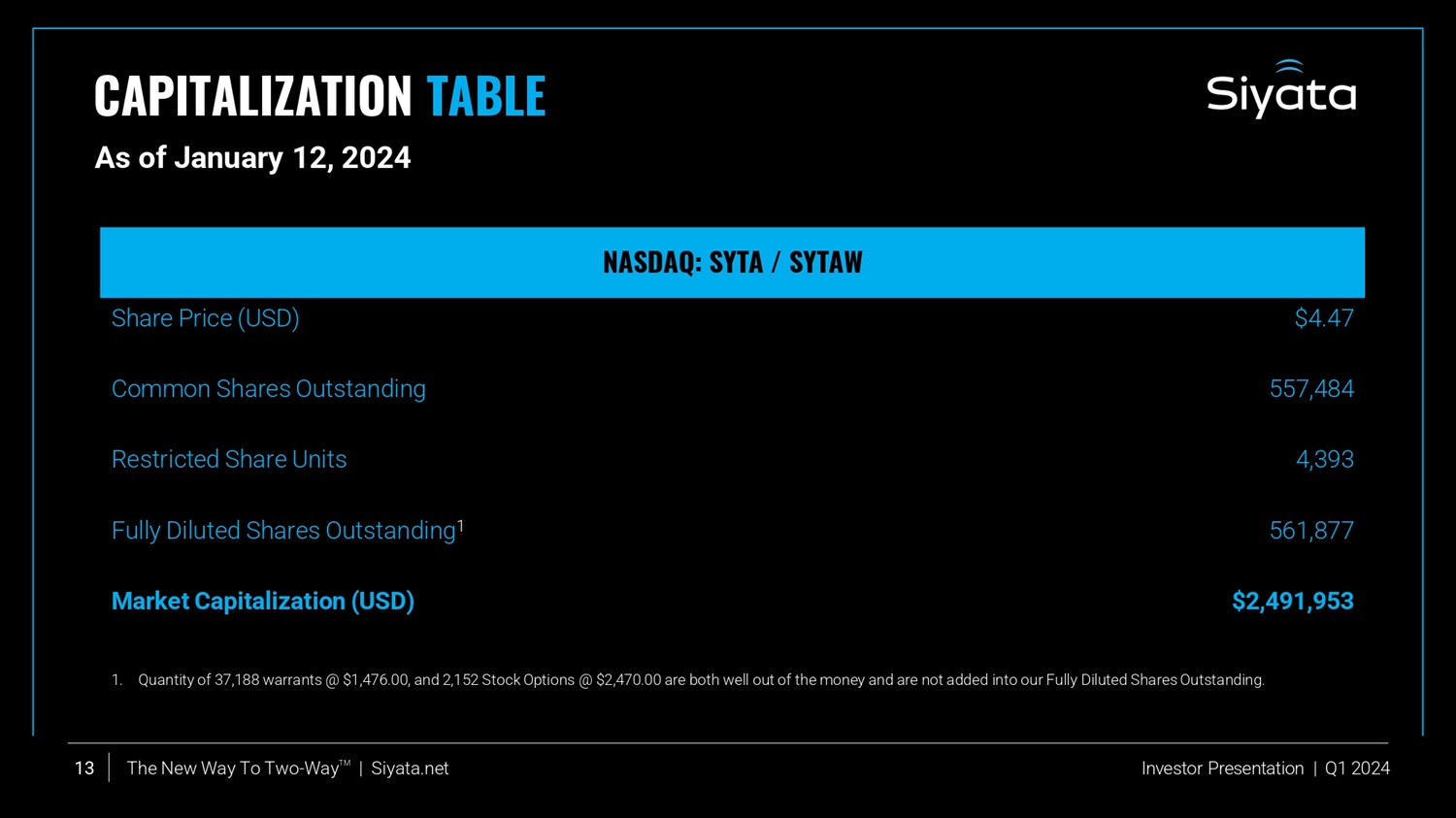 12 SUMMARY BALANCE SHEETS Audited, as of December 31, 2022 Unaudited, as of September 30, 2023 in USD $1,913,742 $366,155 Cash 1 $4,092,550 $2,901,914 Inventory $958,897 $1,705,149 Accounts Receivable $7,910,276 $7,217,602 Total Current Assets $16,142,531 $16,197,372 Total Assets $0 $531,521 Bank Factoring $6,266,842 $3,860,338 Total Current Liabilities $0 $0 3 Debt $6,902,059 $3,860,338 Total Liabilities $9,240,472 $12,337,034 Stockholders’ Equity 2 $16,142,531 $16,197,372 Total Liabilities & Equity 1. On November 1, 2023, the Company completed financing with net proceeds of ~$1.2 million. 2. Share Capital is ~$85 mil lion. 3. Completed a Supply Chain and A/R facility to provide financing for anticipated growth Q3, 2023 Investor Presentation | Q1 2024 The New Way To Two - Way TM | Siyata.net