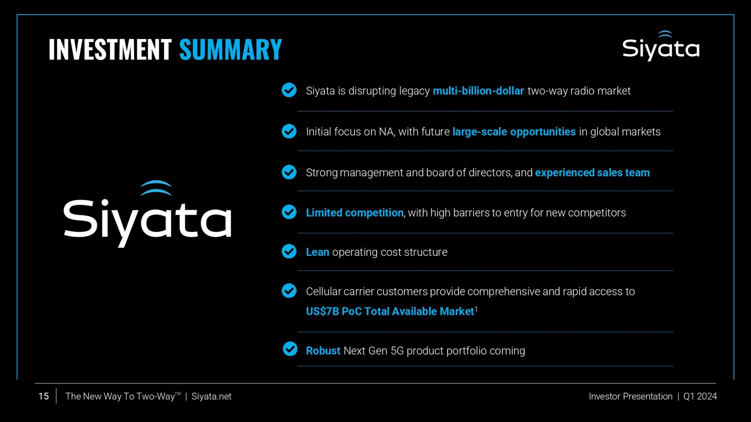 14 SENIOR MANAGEMENT & BOARD OF DIRECTORS Marc Seelenfreund – Founder and CEO • Over 20 years of experience in the telecom and cellular arena. Founder of leading telecom distribution company with multiple global telecom vendors. • Holds a Law degree and is Chairman of the Board at a leading private university. Gerald Bernstein – CFO • 20 years experience on private equity financing and tax efficient corporate structuring in multi - jurisdictional arenas. • BCom and Graduate Diploma in Public Accountancy from McGill University; and member of the Canadian Institute of Chartered Accountants since 1987 and a professional chartered accountant. Glenn Kennedy – VP International Sales & Marketing • Over 25 years of sales experience in the telecom industry. Managed sales nationally for Motorola Canada, HTC Canada, and Sonim Technologies. • Honors Bachelor of Arts in Business Administration from the Richard Ivey School of Business at the University of Western Ontario. Gidi Bracha – VP Technology • VP Technology since 2011; spearheads all aspects of development. Head of Car Mobility Products and Director of Type Approvals. • Holds a BA in Engineering and Business Management from the University of Derby, in England. Peter Goldstein – Chairman of the Board • Over 30 years of diverse and global entrepreneurial, client advisory and fund - raising experience; s erving as investment banker, director, CEO, founder and advisor to public, private and emerging growth companies • Experienced in strategic planning, M&A and transaction structuring, as well as his own entrepreneurial success. He has steered and completed IPOs, secured private placements and designed crowdfunding campaigns. Gary Herman – Board Member • Over 30 years in investment entities, with a focus on U.S. publicly - traded small and micro - cap companies. • Co - managed Strategic Turnaround Equity Partners, LP (Cayman) from 2006 to 2021. Lourdes Felix – Board Member • A seasoned company executive that has worked with private and public SEC reporting companies. • Ms. Felix’s experience includes a wide variety of industries, including multiple senior roles at BioCorRx as CEO, CFO and President. Stephen Ospalak – Board Member • Over 20 years in telecom, currently SVP Marketing & Operations at BMG Inc . • Served as VP of Products & Services at TELUS Communications Inc. responsible for an annual spend > US$1 billion and has held management positions at AT&T. Investor Presentation | Q1 2024 The New Way To Two - Way TM | Siyata.net