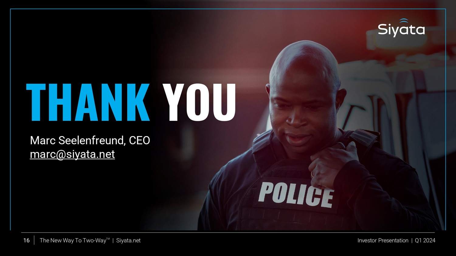 THANK YOU Marc Seelenfreund, CEO marc@siyata.net 16 Investor Presentation | Q1 2024 The New Way To Two - Way TM | Siyata.net