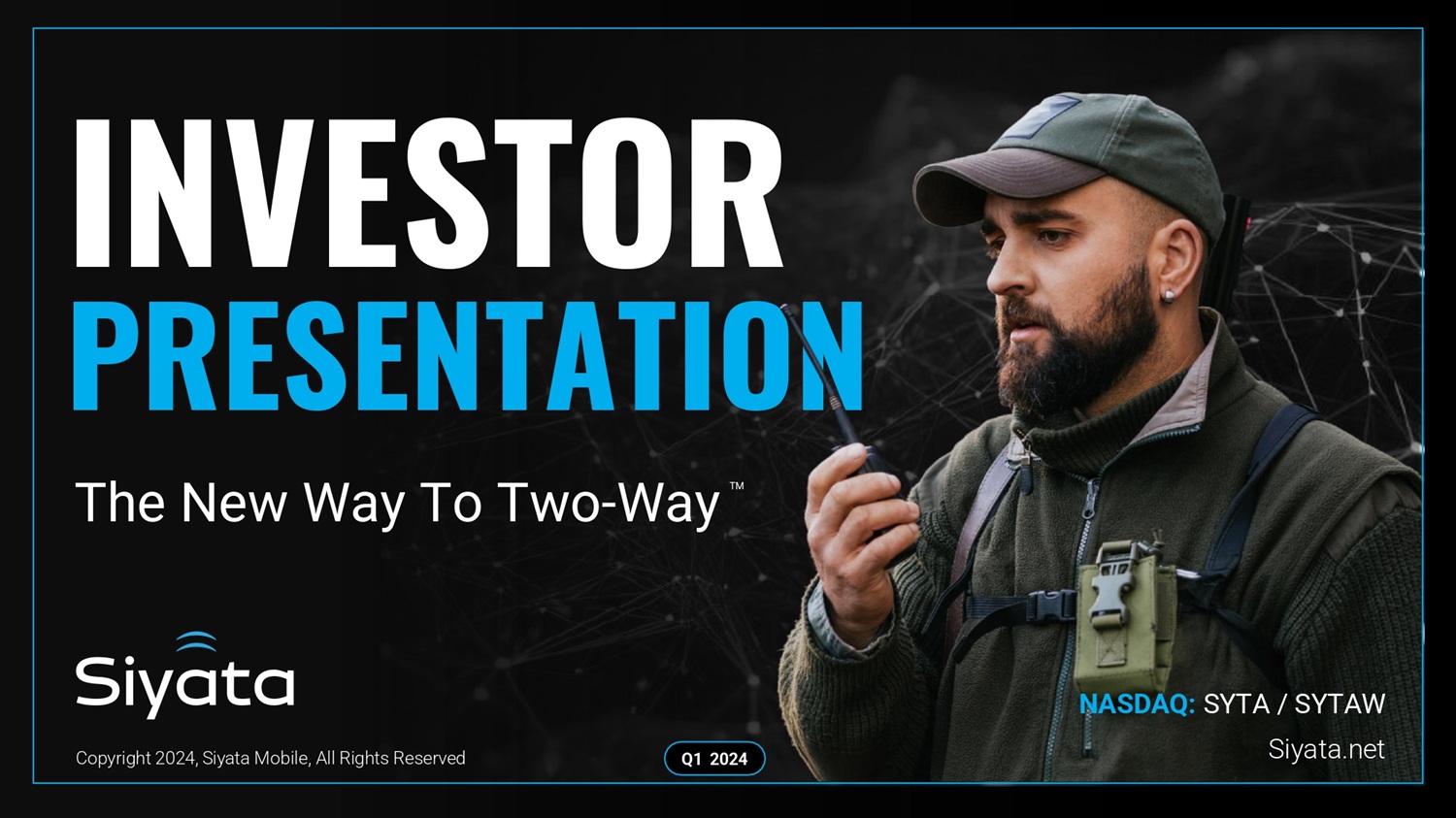 INVESTOR PRESENTATION Copyright 202 4 , Siyata Mobile, All Rights Reserved Q 1 202 4 NASDAQ: SYTA / SYTAW Siyata.net The New Way To Two - Way TM