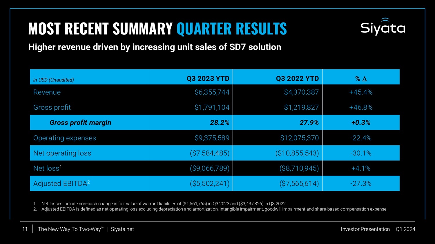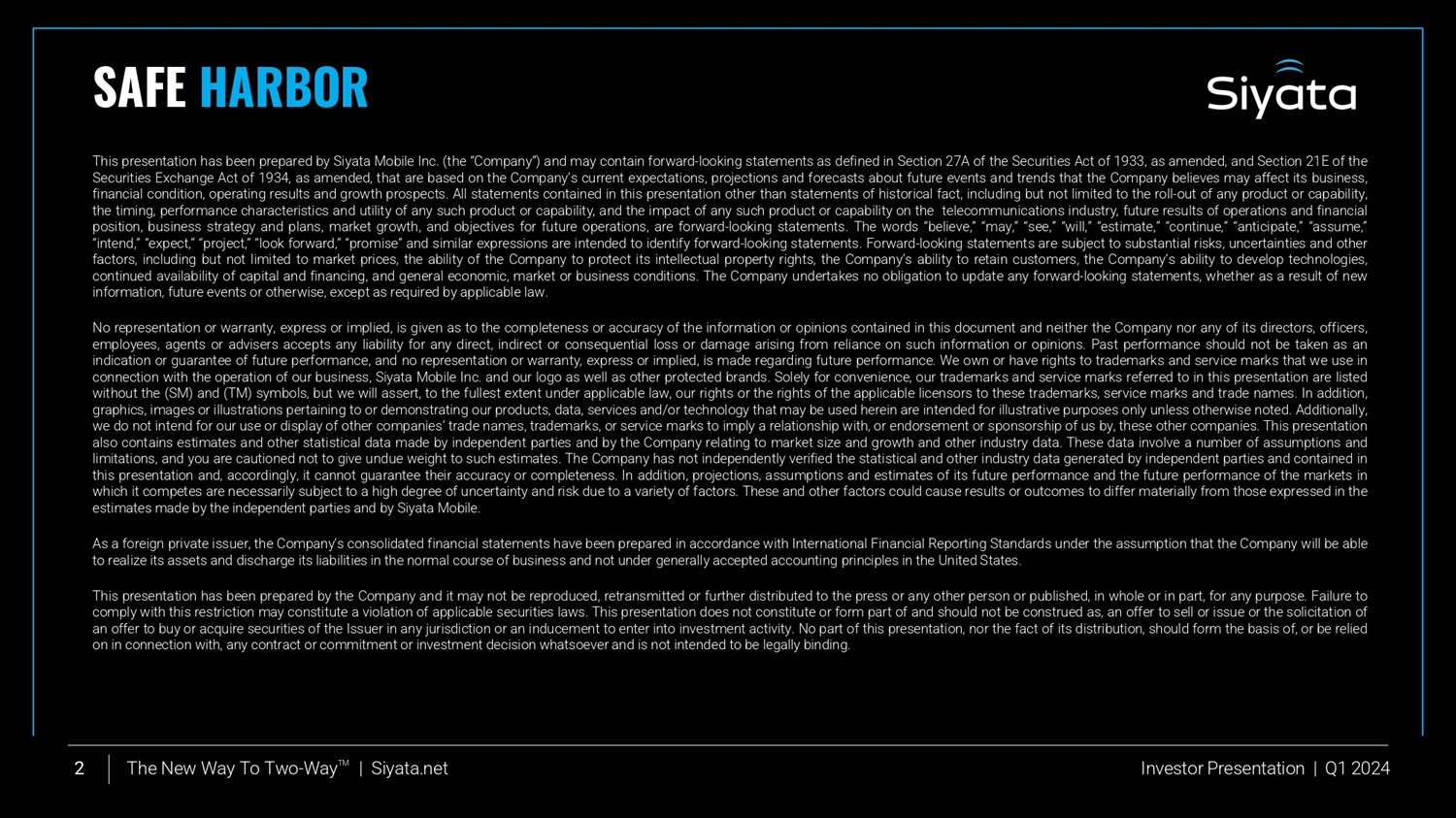 SAFE HARBOR This presentation has been prepared by Siyata Mobile Inc . (the “Company”) and may contain forward - looking statements as defined in Section 27 A of the Securities Act of 1933 , as amended, and Section 21 E of the Securities Exchange Act of 1934 , as amended, that are based on the Company’s current expectations, projections and forecasts about future events and trends that the Company believes may affect its business, financial condition, operating results and growth prospects . All statements contained in this presentation other than statements of historical fact, including but not limited to the roll - out of any product or capability, the timing, performance characteristics and utility of any such product or capability, and the impact of any such product or capability on the telecommunications industry, future results of operations and financial position, business strategy and plans, market growth, and objectives for future operations, are forward - looking statements . The words “believe,” “may,” “see,” “will,” “estimate,” “continue,” “anticipate,” “assume,” “intend,” “expect,” “project,” “look forward,” “promise” and similar expressions are intended to identify forward - looking statements . Forward - looking statements are subject to substantial risks, uncertainties and other factors, including but not limited to market prices, the ability of the Company to protect its intellectual property rights, the Company’s ability to retain customers, the Company’s ability to develop technologies, continued availability of capital and financing, and general economic, market or business conditions . The Company undertakes no obligation to update any forward - looking statements, whether as a result of new information, future events or otherwise, except as required by applicable law . No representation or warranty, express or implied, is given as to the completeness or accuracy of the information or opinions contained in this document and neither the Company nor any of its directors, officers, employees, agents or advisers accepts any liability for any direct, indirect or consequential loss or damage arising from reliance on such information or opinions . Past performance should not be taken as an indication or guarantee of future performance, and no representation or warranty, express or implied, is made regarding future performance . We own or have rights to trademarks and service marks that we use in connection with the operation of our business, Siyata Mobile Inc . and our logo as well as other protected brands . Solely for convenience, our trademarks and service marks referred to in this presentation are listed without the (SM) and (TM) symbols, but we will assert, to the fullest extent under applicable law, our rights or the rights of the applicable licensors to these trademarks, service marks and trade names . In addition, graphics, images or illustrations pertaining to or demonstrating our products, data, services and/or technology that may be used herein are intended for illustrative purposes only unless otherwise noted . Additionally, we do not intend for our use or display of other companies’ trade names, trademarks, or service marks to imply a relationship with, or endorsement or sponsorship of us by, these other companies . This presentation also contains estimates and other statistical data made by independent parties and by the Company relating to market size and growth and other industry data . These data involve a number of assumptions and limitations, and you are cautioned not to give undue weight to such estimates . The Company has not independently verified the statistical and other industry data generated by independent parties and contained in this presentation and, accordingly, it cannot guarantee their accuracy or completeness . In addition, projections, assumptions and estimates of its future performance and the future performance of the markets in which it competes are necessarily subject to a high degree of uncertainty and risk due to a variety of factors . These and other factors could cause results or outcomes to differ materially from those expressed in the estimates made by the independent parties and by Siyata Mobile . As a foreign private issuer, the Company’s consolidated financial statements have been prepared in accordance with International Financial Reporting Standards under the assumption that the Company will be able to realize its assets and discharge its liabilities in the normal course of business and not under generally accepted accounting principles in the United States . This presentation has been prepared by the Company and it may not be reproduced, retransmitted or further distributed to the press or any other person or published, in whole or in part, for any purpose . Failure to comply with this restriction may constitute a violation of applicable securities laws . This presentation does not constitute or form part of and should not be construed as, an offer to sell or issue or the solicitation of an offer to buy or acquire securities of the Issuer in any jurisdiction or an inducement to enter into investment activity . No part of this presentation, nor the fact of its distribution, should form the basis of, or be relied on in connection with, any contract or commitment or investment decision whatsoever and is not intended to be legally binding . 2 Investor Presentation | Q1 2024 The New Way To Two - Way TM | Siyata.net