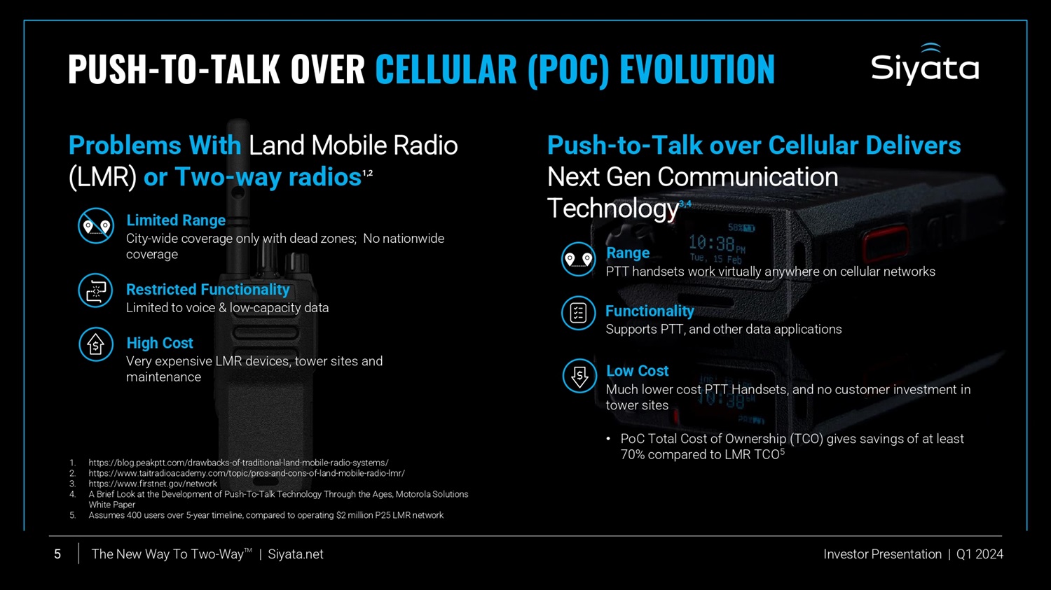 Siyata aims to be the global leader in the rapidly growing Push - to - Talk Over Cellular (PoC) industry by disrupting the legacy Land Mobile Radio (LMR) industry with Next Generation Communication Technology. 3 Investor Presentation | Q1 2024 The New Way To Two - Way TM | Siyata.net