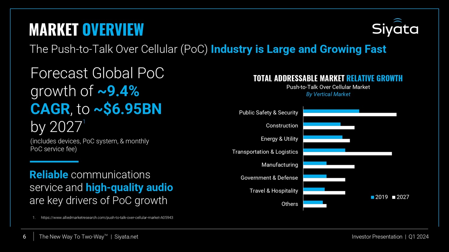 PUSH - TO - TALK OVER CELLULAR (POC) EVOLUTION 5 Limited Range City - wide coverage only with dead zones; No nationwide coverage Restricted Functionality Limited to voice & low - capacity data High Cost Very expensive LMR devices, tower sites and maintenance Problems With Land Mobile Radio (LMR) or Two - way radios 1,2 Range PTT handsets work virtually anywhere on cellular networks Functionality Supports PTT, and other data applications Low Cost Much lower cost PTT Handsets, and no customer investment in tower sites • PoC Total Cost of Ownership (TCO) gives savings of at least 70% compared to LMR TCO 5 Push - to - Talk over Cellular Delivers Next Gen Communication Technology 3,4 1. https://blog.peakptt.com/drawbacks - of - traditional - land - mobile - radio - systems/ 2. https://www.taitradioacademy.com/topic/pros - and - cons - of - land - mobile - radio - lmr/ 3. https://www.firstnet.gov/network 4. A Brief Look at the Development of Push - To - Talk Technology Through the Ages, Motorola Solutions White Paper 5. Assumes 400 users over 5 - year timeline, compared to operating $2 million P25 LMR network Investor Presentation | Q1 2024 The New Way To Two - Way TM | Siyata.net
