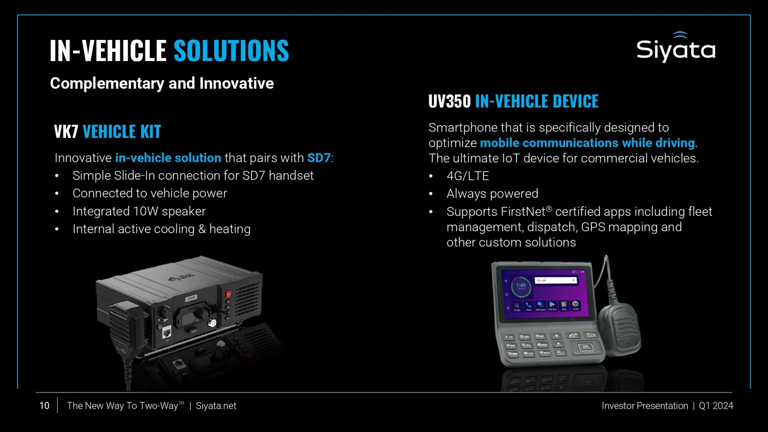 9 RUGGED HANDSETS Siyata Specializes in Rugged PTT Handsets: SD7 is our Next Generation PoC Handset Complementing our Portfolio of Disruptive Handsets THE SD7 IS A GAME CHANGER The Perfect Upgrade from land mobile radio (LMR): • A simple, purpose built, highly functional and rugged Android - based PTT only handset • Rugged IP68 rated design protects against dust and debris • Excellent sound quality allowing for clear communication in the presence of background noise • All the benefits of PoC without the headaches of managing the current generation of rugged smartphones and feature phones • Robust Next Gen 5G product portfolio coming Investor Presentation | Q1 2024 The New Way To Two - Way TM | Siyata.net