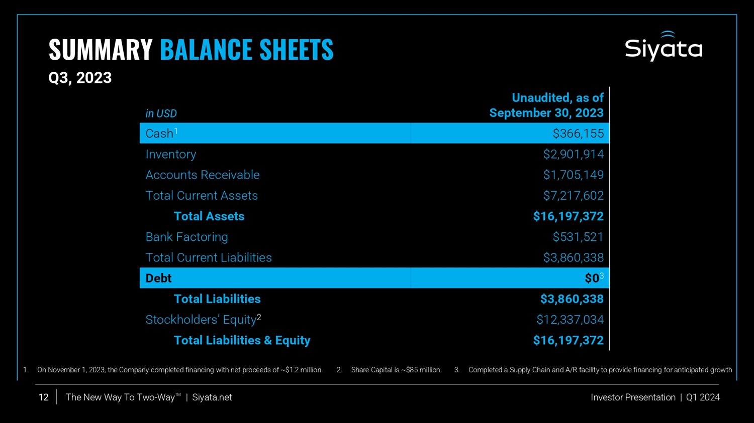 11 MOST RECENT SUMMARY QUARTER RESULTS Higher revenue driven by increasing unit sales of SD7 solution %  Q3 2022 YTD Q3 2023 YTD in USD (Unaudited) +45.4% $4,370,387 $6,355,744 Revenue +46.8% $1,219,827 $1,791,104 Gross profit +0.3% 27.9% 28.2% Gross profit margin - 22.4% $12,075,370 $9,375,589 Operating expenses - 30.1% ($10,855,543) ($7,584,485) Net operating loss +4.1% ($8,710,945) ($9,066,789) Net loss 1 - 27.3% ($7,565,614) ($5,502,241) Adjusted EBITDA 2 1. Net losses include non - cash change in fair value of warrant liabilities of ($1,561,765) in Q3 2023 and ($3,437,826) in Q3 2022. 2. Adjusted EBITDA is defined as net operating loss excluding depreciation and amortization, intangible impairment, goodwill imp air ment and share - based compensation expense Investor Presentation | Q1 2024 The New Way To Two - Way TM | Siyata.net
