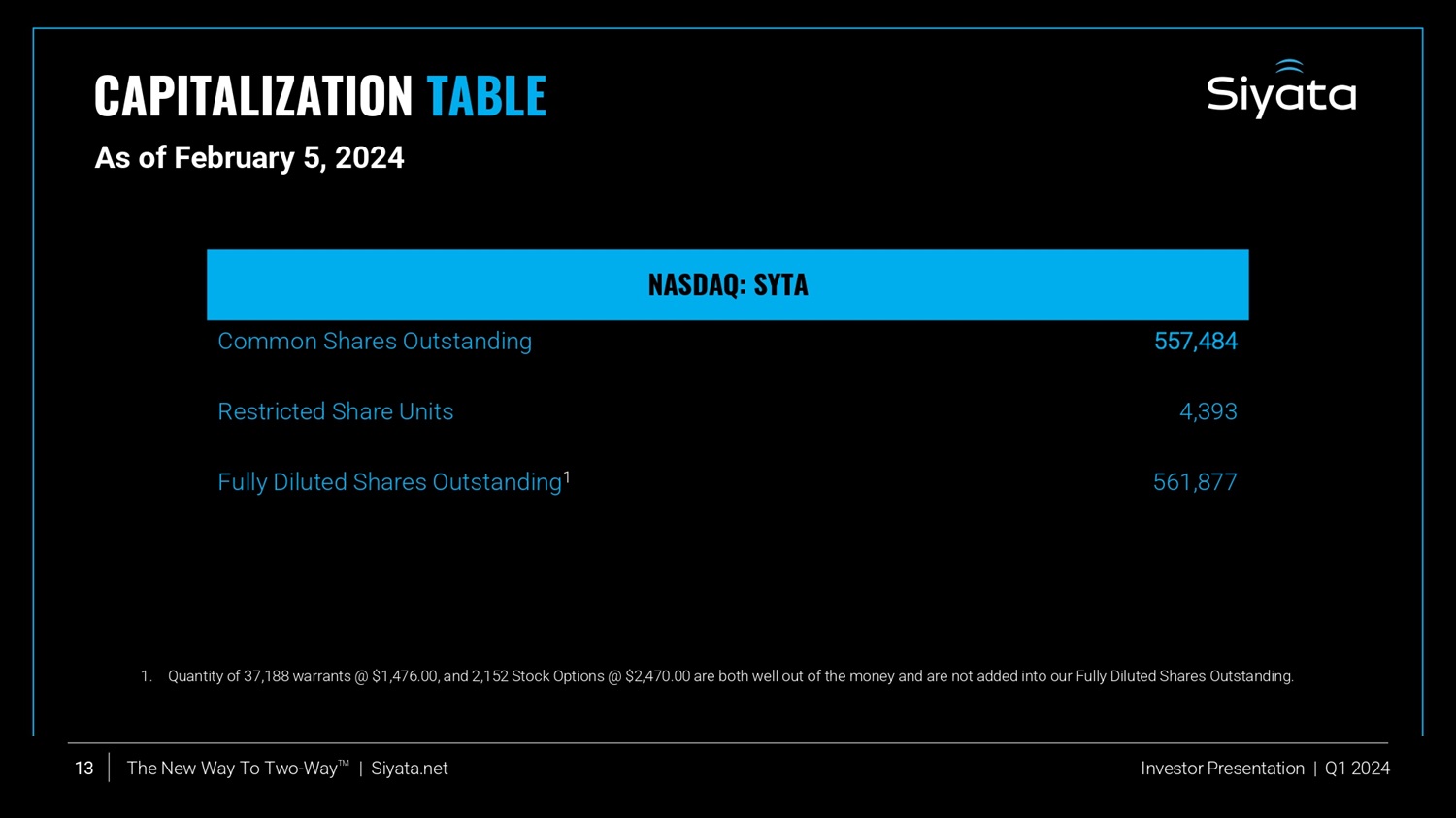 12 SUMMARY BALANCE SHEETS Unaudited, as of September 30, 2023 in USD $366,155 Cash 1 $2,901,914 Inventory $1,705,149 Accounts Receivable $7,217,602 Total Current Assets $16,197,372 Total Assets $531,521 Bank Factoring $3,860,338 Total Current Liabilities $0 3 Debt $3,860,338 Total Liabilities $12,337,034 Stockholders’ Equity 2 $16,197,372 Total Liabilities & Equity 1. On November 1, 2023, the Company completed financing with net proceeds of ~$1.2 million. 2. Share Capital is ~$85 mil lion. 3. Completed a Supply Chain and A/R facility to provide financing for anticipated growth Q3, 2023 Investor Presentation | Q1 2024 The New Way To Two - Way TM | Siyata.net