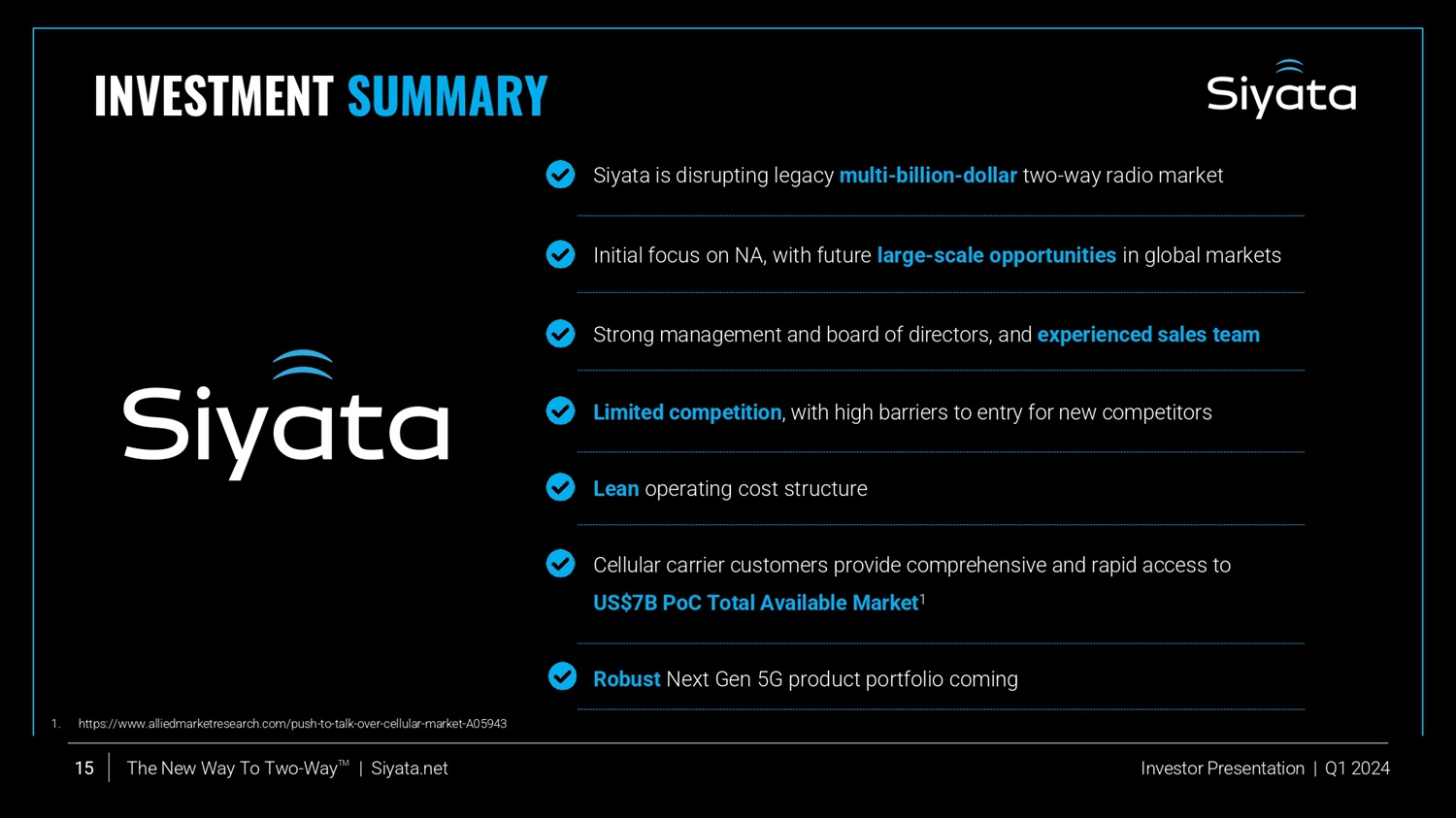 14 SENIOR MANAGEMENT & BOARD OF DIRECTORS Marc Seelenfreund – Founder and CEO • Over 20 years of experience in the telecom and cellular arena. Founder of leading telecom distribution company with multiple global telecom vendors. • Holds a Law degree and is Chairman of the Board at a leading private university. Gerald Bernstein – CFO • 20 years experience on private equity financing and tax efficient corporate structuring in multi - jurisdictional arenas. • BCom and Graduate Diploma in Public Accountancy from McGill University; and member of the Canadian Institute of Chartered Accountants since 1987 and a professional chartered accountant. Glenn Kennedy – VP International Sales & Marketing • Over 25 years of sales experience in the telecom industry. Managed sales nationally for Motorola Canada, HTC Canada, and Sonim Technologies. • Honors Bachelor of Arts in Business Administration from the Richard Ivey School of Business at the University of Western Ontario. Gidi Bracha – VP Technology • VP Technology since 2011; spearheads all aspects of development. Head of Car Mobility Products and Director of Type Approvals. • Holds a BA in Engineering and Business Management from the University of Derby, in England. Peter Goldstein – Chairman of the Board • Over 30 years of diverse and global entrepreneurial, client advisory and fund - raising experience; s erving as investment banker, director, CEO, founder and advisor to public, private and emerging growth companies • Experienced in strategic planning, M&A and transaction structuring, as well as his own entrepreneurial success. He has steered and completed IPOs, secured private placements and designed crowdfunding campaigns. Gary Herman – Board Member • Over 30 years in investment entities, with a focus on U.S. publicly - traded small and micro - cap companies. • Co - managed Strategic Turnaround Equity Partners, LP (Cayman) from 2006 to 2021. Lourdes Felix – Board Member • A seasoned company executive that has worked with private and public SEC reporting companies. • Ms. Felix’s experience includes a wide variety of industries, including multiple senior roles at BioCorRx as CEO, CFO and President. Stephen Ospalak – Board Member • Over 20 years in telecom, currently SVP Marketing & Operations at BMG Inc . • Served as VP of Products & Services at TELUS Communications Inc. responsible for an annual spend > US$1 billion and has held management positions at AT&T. Investor Presentation | Q1 2024 The New Way To Two - Way TM | Siyata.net