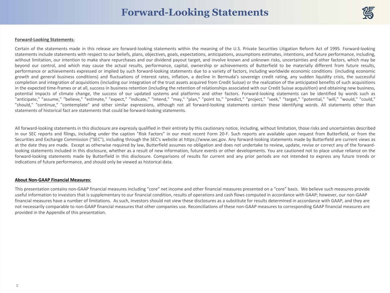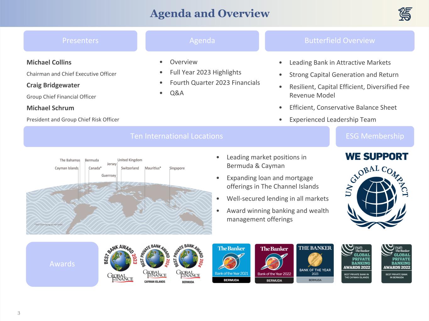 2 Forward-Looking Statements Forward-Looking Statements: Certain of the statements made in this release are forward-looking statements within the meaning of the U.S. Private Securities Litigation Reform Act of 1995. Forward-looking statements include statements with respect to our beliefs, plans, objectives, goals, expectations, anticipations, assumptions estimates, intentions, and future performance, including, without limitation, our intention to make share repurchases and our dividend payout target, and involve known and unknown risks, uncertainties and other factors, which may be beyond our control, and which may cause the actual results, performance, capital, ownership or achievements of Butterfield to be materially different from future results, performance or achievements expressed or implied by such forward-looking statements due to a variety of factors, including worldwide economic conditions (including economic growth and general business conditions) and fluctuations of interest rates, inflation, a decline in Bermuda’s sovereign credit rating, any sudden liquidity crisis, the successful completion and integration of acquisitions (including our integration of the trust assets acquired from Credit Suisse) or the realization of the anticipated benefits of such acquisitions in the expected time-frames or at all, success in business retention (including the retention of relationships associated with our Credit Suisse acquisition) and obtaining new business, potential impacts of climate change, the success of our updated systems and platforms and other factors. Forward-looking statements can be identified by words such as "anticipate," "assume," "believe," "estimate," "expect," "indicate," "intend," "may," "plan," "point to," "predict," "project," "seek," "target," "potential," "will," "would," "could," "should," "continue," "contemplate" and other similar expressions, although not all forward-looking statements contain these identifying words. All statements other than statements of historical fact are statements that could be forward-looking statements. All forward-looking statements in this disclosure are expressly qualified in their entirety by this cautionary notice, including, without limitation, those risks and uncertainties described in our SEC reports and filings, including under the caption "Risk Factors" in our most recent Form 20-F. Such reports are available upon request from Butterfield, or from the Securities and Exchange Commission ("SEC"), including through the SEC’s website at https://www.sec.gov. Any forward-looking statements made by Butterfield are current views as at the date they are made. Except as otherwise required by law, Butterfield assumes no obligation and does not undertake to review, update, revise or correct any of the forward- looking statements included in this disclosure, whether as a result of new information, future events or other developments. You are cautioned not to place undue reliance on the forward-looking statements made by Butterfield in this disclosure. Comparisons of results for current and any prior periods are not intended to express any future trends or indications of future performance, and should only be viewed as historical data. About Non-GAAP Financial Measures: This presentation contains non-GAAP financial measures including “core” net income and other financial measures presented on a “core” basis. We believe such measures provide useful information to investors that is supplementary to our financial condition, results of operations and cash flows computed in accordance with GAAP; however, our non-GAAP financial measures have a number of limitations. As such, investors should not view these disclosures as a substitute for results determined in accordance with GAAP, and they are not necessarily comparable to non-GAAP financial measures that other companies use. Reconciliations of these non-GAAP measures to corresponding GAAP financial measures are provided in the Appendix of this presentation.