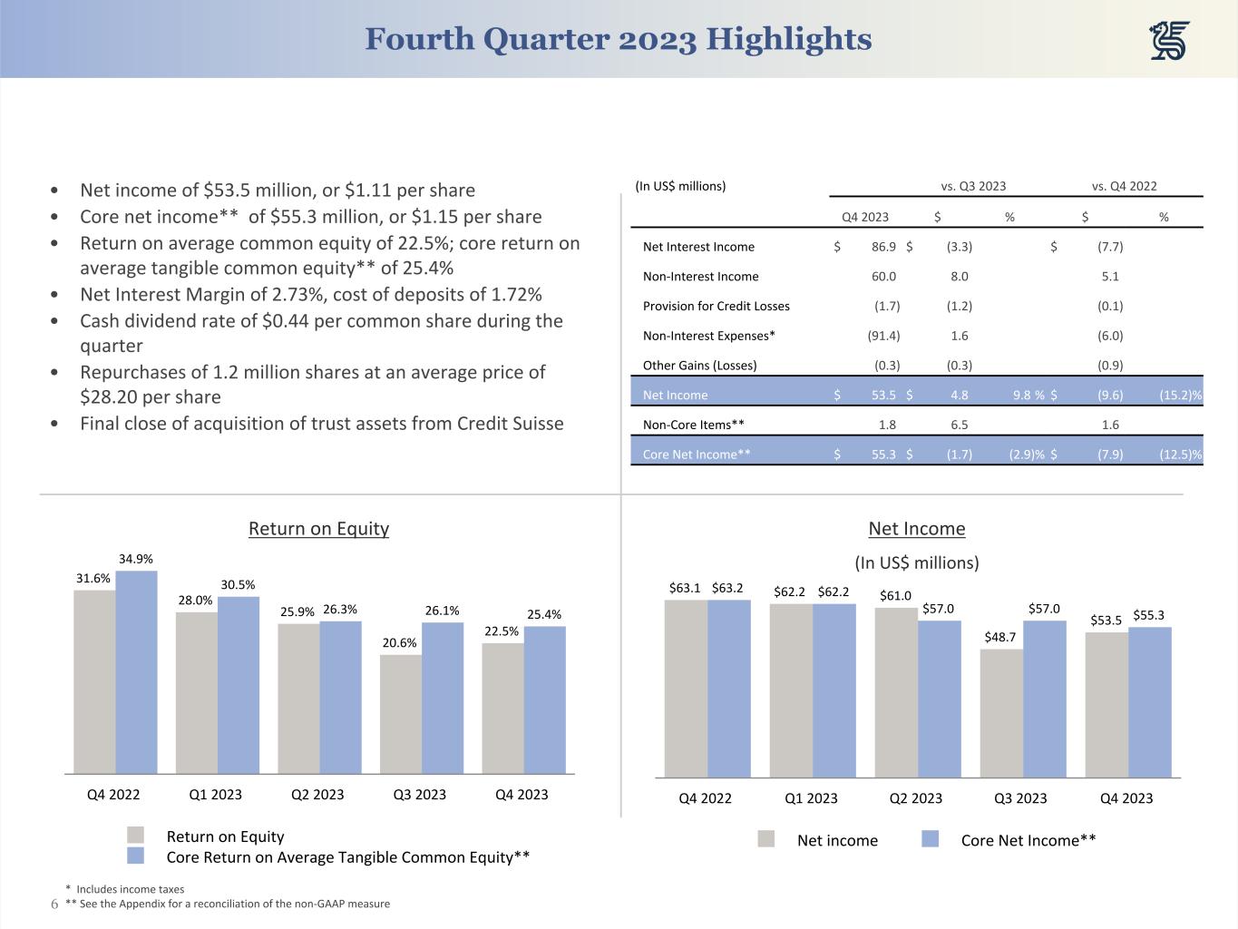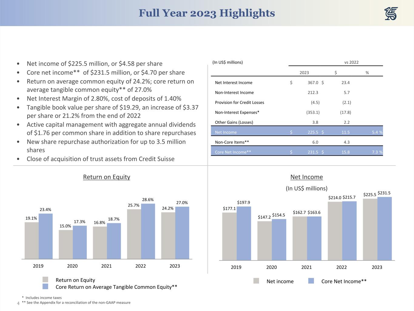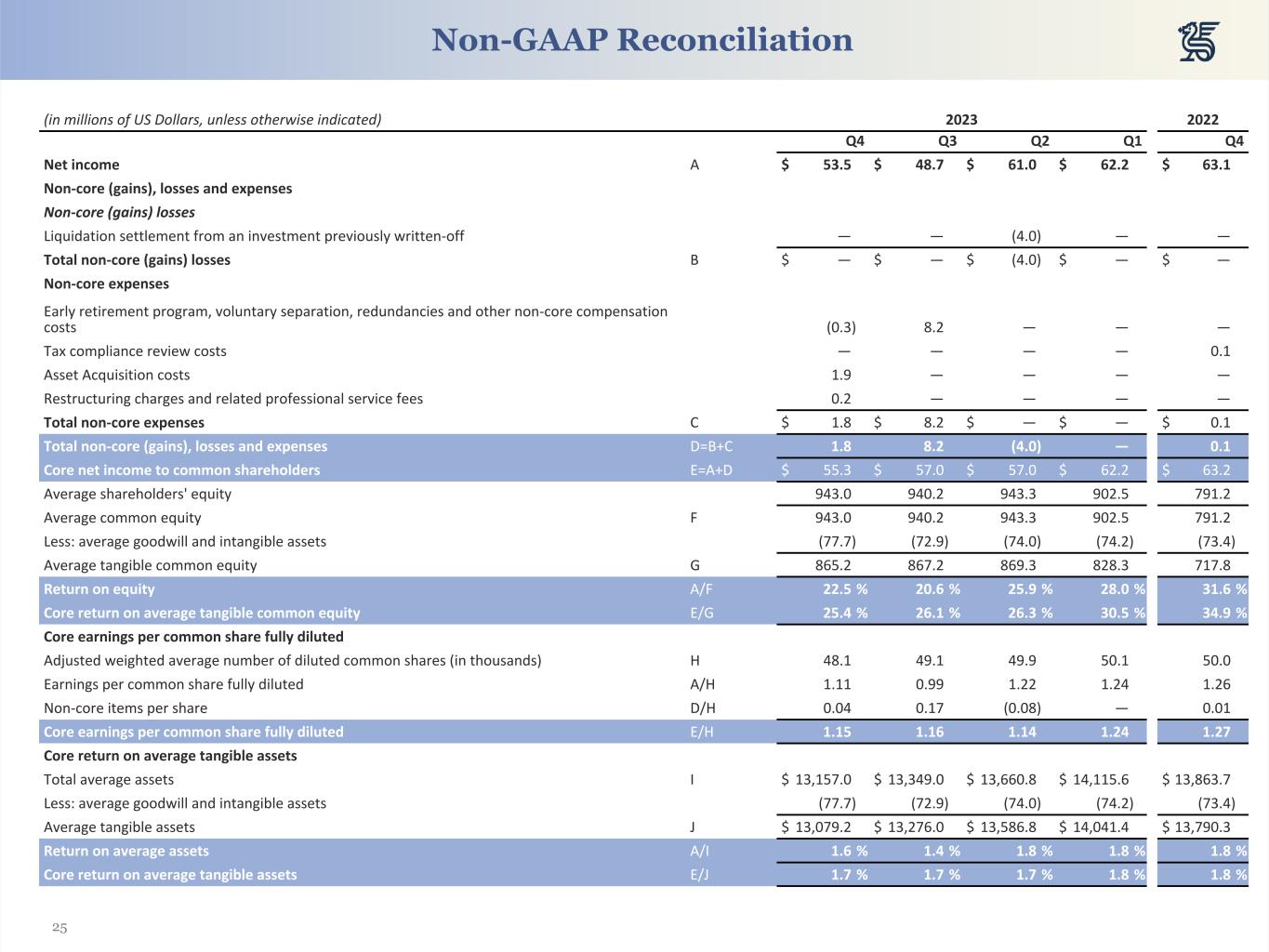 25 (in millions of US Dollars, unless otherwise indicated) 2023 2022 Q4 Q3 Q2 Q1 Q4 Net income A $ 53.5 $ 48.7 $ 61.0 $ 62.2 $ 63.1 Non-core (gains), losses and expenses Non-core (gains) losses Liquidation settlement from an investment previously written-off — — (4.0) — — Total non-core (gains) losses B $ — $ — $ (4.0) $ — $ — Non-core expenses Early retirement program, voluntary separation, redundancies and other non-core compensation costs (0.3) 8.2 — — — Tax compliance review costs — — — — 0.1 Asset Acquisition costs 1.9 — — — — Restructuring charges and related professional service fees 0.2 — — — — Total non-core expenses C $ 1.8 $ 8.2 $ — $ — $ 0.1 Total non-core (gains), losses and expenses D=B+C 1.8 8.2 (4.0) — 0.1 Core net income to common shareholders E=A+D $ 55.3 $ 57.0 $ 57.0 $ 62.2 $ 63.2 Average shareholders' equity 943.0 940.2 943.3 902.5 791.2 Average common equity F 943.0 940.2 943.3 902.5 791.2 Less: average goodwill and intangible assets (77.7) (72.9) (74.0) (74.2) (73.4) Average tangible common equity G 865.2 867.2 869.3 828.3 717.8 Return on equity A/F 22.5 % 20.6 % 25.9 % 28.0 % 31.6 % Core return on average tangible common equity E/G 25.4 % 26.1 % 26.3 % 30.5 % 34.9 % Core earnings per common share fully diluted Adjusted weighted average number of diluted common shares (in thousands) H 48.1 49.1 49.9 50.1 50.0 Earnings per common share fully diluted A/H 1.11 0.99 1.22 1.24 1.26 Non-core items per share D/H 0.04 0.17 (0.08) — 0.01 Core earnings per common share fully diluted E/H 1.15 1.16 1.14 1.24 1.27 Core return on average tangible assets Total average assets I $ 13,157.0 $ 13,349.0 $ 13,660.8 $ 14,115.6 $ 13,863.7 Less: average goodwill and intangible assets (77.7) (72.9) (74.0) (74.2) (73.4) Average tangible assets J $ 13,079.2 $ 13,276.0 $ 13,586.8 $ 14,041.4 $ 13,790.3 Return on average assets A/I 1.6 % 1.4 % 1.8 % 1.8 % 1.8 % Core return on average tangible assets E/J 1.7 % 1.7 % 1.7 % 1.8 % 1.8 % Non-GAAP Reconciliation