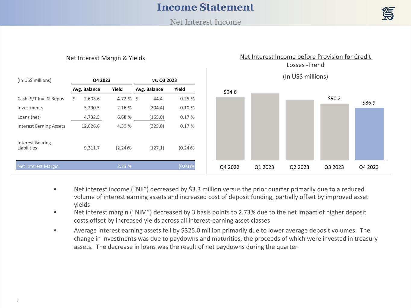 6 Fourth Quarter 2023 Highlights Net Income (In US$ millions) Return on Equity (In US$ millions) vs. Q3 2023 vs. Q4 2022 Q4 2023 $ % $ % Net Interest Income $ 86.9 $ (3.3) $ (7.7) Non-Interest Income 60.0 8.0 5.1 Provision for Credit Losses (1.7) (1.2) (0.1) Non-Interest Expenses* (91.4) 1.6 (6.0) Other Gains (Losses) (0.3) (0.3) (0.9) Net Income $ 53.5 $ 4.8 9.8 % $ (9.6) (15.2) % Non-Core Items** 1.8 6.5 1.6 Core Net Income** $ 55.3 $ (1.7) (2.9) % $ (7.9) (12.5) % • Net income of $53.5 million, or $1.11 per share • Core net income** of $55.3 million, or $1.15 per share • Return on average common equity of 22.5%; core return on average tangible common equity** of 25.4% • Net Interest Margin of 2.73%, cost of deposits of 1.72% • Cash dividend rate of $0.44 per common share during the quarter • Repurchases of 1.2 million shares at an average price of $28.20 per share • Final close of acquisition of trust assets from Credit Suisse * Includes income taxes ** See the Appendix for a reconciliation of the non-GAAP measure $63.1 $62.2 $61.0 $48.7 $53.5 $63.2 $62.2 $57.0 $57.0 $55.3 Net income Core Net Income** Q4 2022 Q1 2023 Q2 2023 Q3 2023 Q4 2023 31.6% 28.0% 25.9% 20.6% 22.5% 34.9% 30.5% 26.3% 26.1% 25.4% Return on Equity Core Return on Average Tangible Common Equity** Q4 2022 Q1 2023 Q2 2023 Q3 2023 Q4 2023