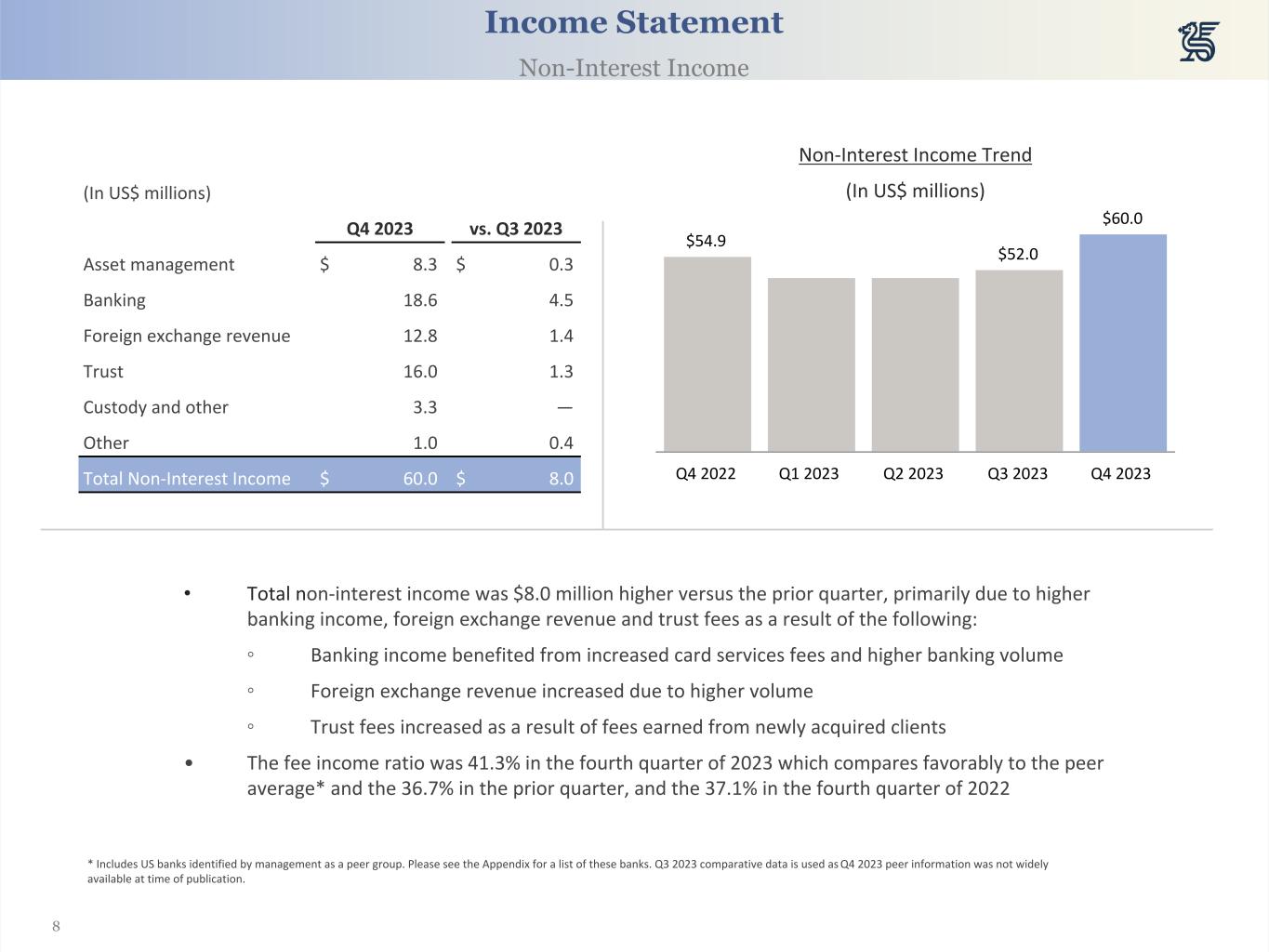 7 Net Interest Income before Provision for Credit Losses -Trend (In US$ millions) $94.6 $90.2 $86.9 Q4 2022 Q1 2023 Q2 2023 Q3 2023 Q4 2023 Net Interest Margin & Yields Income Statement Net Interest Income • Net interest income (“NII”) decreased by $3.3 million versus the prior quarter primarily due to a reduced volume of interest earning assets and increased cost of deposit funding, partially offset by improved asset yields • Net interest margin (“NIM”) decreased by 3 basis points to 2.73% due to the net impact of higher deposit costs offset by increased yields across all interest-earning asset classes • Average interest earning assets fell by $325.0 million primarily due to lower average deposit volumes. The change in investments was due to paydowns and maturities, the proceeds of which were invested in treasury assets. The decrease in loans was the result of net paydowns during the quarter (In US$ millions) Q4 2023 vs. Q3 2023 Avg. Balance Yield Avg. Balance Yield Cash, S/T Inv. & Repos $ 2,603.6 4.72 % $ 44.4 0.25 % Investments 5,290.5 2.16 % (204.4) 0.10 % Loans (net) 4,732.5 6.68 % (165.0) 0.17 % Interest Earning Assets 12,626.6 4.39 % (325.0) 0.17 % Interest Bearing Liabilities 9,311.7 (2.24) % (127.1) (0.24) % Net Interest Margin 2.73 % (0.03) %
