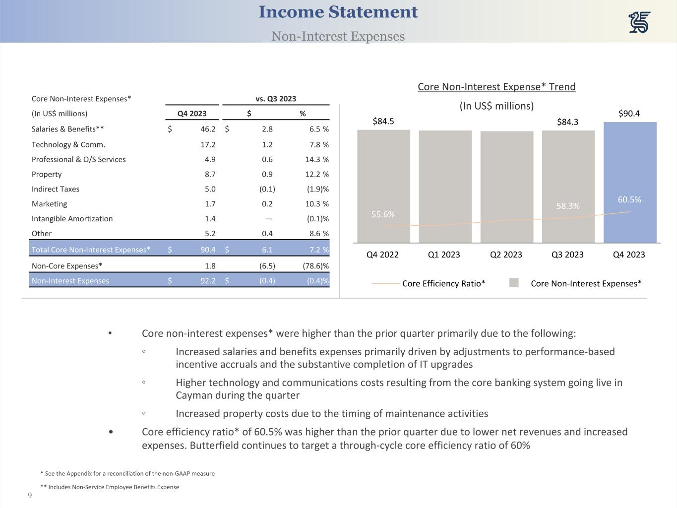 8 Non-Interest Income Trend (In US$ millions)(In US$ millions) Q4 2023 vs. Q3 2023 Asset management $ 8.3 $ 0.3 Banking 18.6 4.5 Foreign exchange revenue 12.8 1.4 Trust 16.0 1.3 Custody and other 3.3 — Other 1.0 0.4 Total Non-Interest Income $ 60.0 $ 8.0 $54.9 $52.0 $60.0 Q4 2022 Q1 2023 Q2 2023 Q3 2023 Q4 2023 • Total non-interest income was $8.0 million higher versus the prior quarter, primarily due to higher banking income, foreign exchange revenue and trust fees as a result of the following: ◦ Banking income benefited from increased card services fees and higher banking volume ◦ Foreign exchange revenue increased due to higher volume ◦ Trust fees increased as a result of fees earned from newly acquired clients • The fee income ratio was 41.3% in the fourth quarter of 2023 which compares favorably to the peer average* and the 36.7% in the prior quarter, and the 37.1% in the fourth quarter of 2022 Income Statement Non-Interest Income * Includes US banks identified by management as a peer group. Please see the Appendix for a list of these banks. Q3 2023 comparative data is used as Q4 2023 peer information was not widely available at time of publication.
