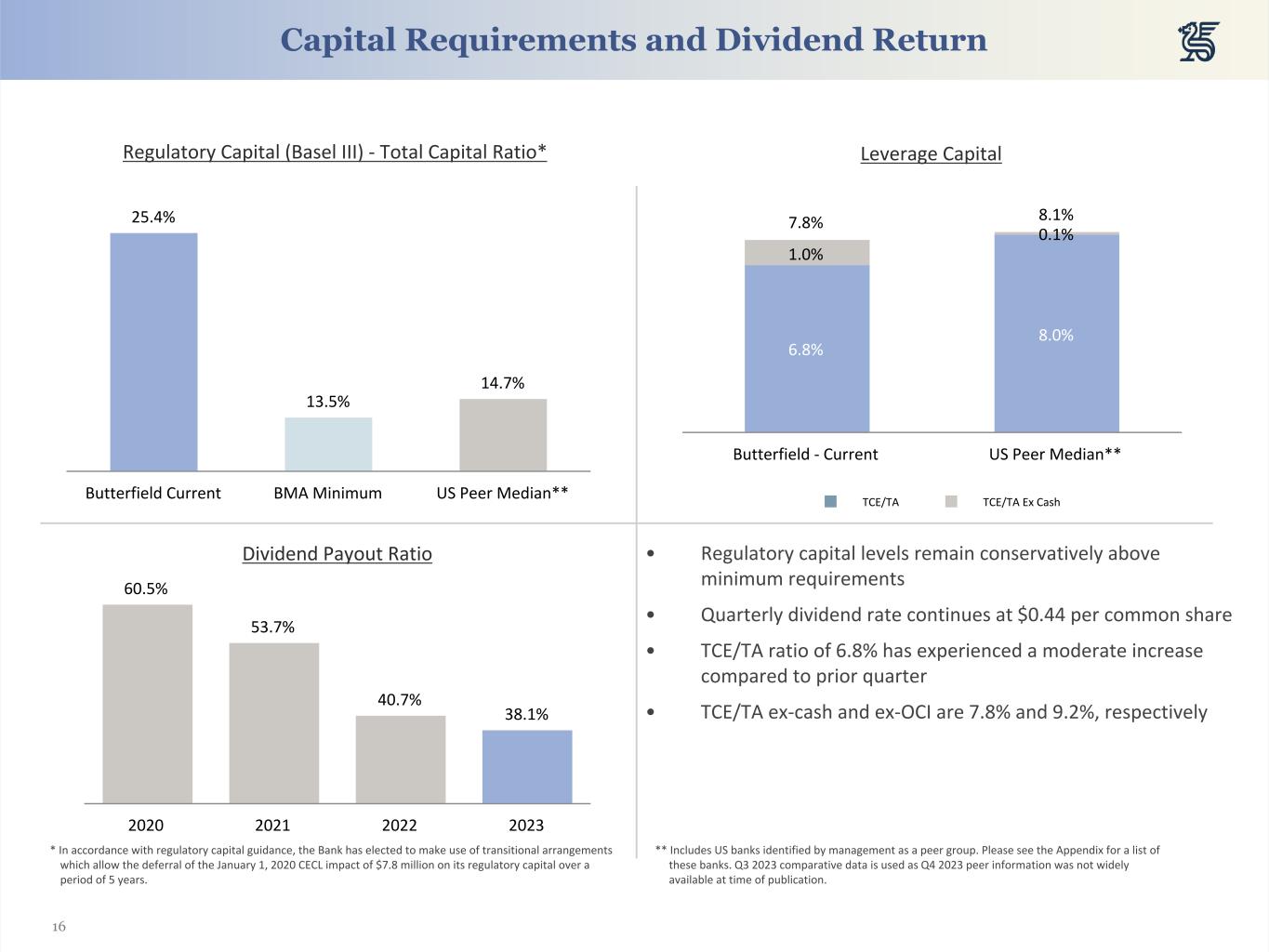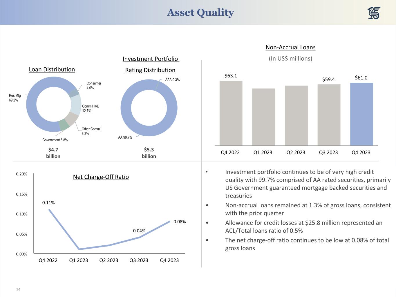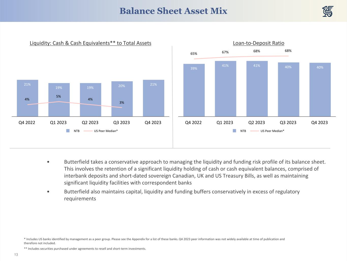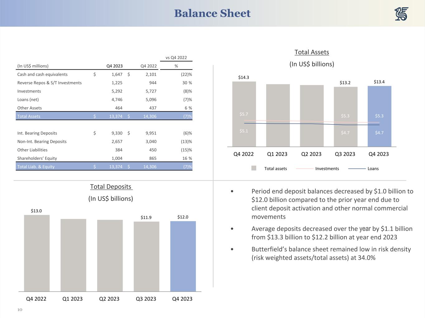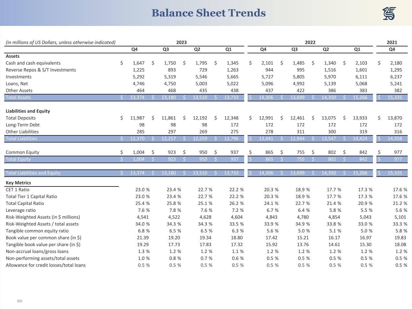 20 (in millions of US Dollars, unless otherwise indicated) 2023 2022 2021 Q4 Q3 Q2 Q1 Q4 Q3 Q2 Q1 Q4 Assets Cash and cash equivalents $ 1,647 $ 1,750 $ 1,795 $ 1,345 $ 2,101 $ 1,485 $ 1,340 $ 2,103 $ 2,180 Reverse Repos & S/T Investments 1,225 893 729 1,263 944 995 1,516 1,601 1,295 Investments 5,292 5,319 5,546 5,665 5,727 5,805 5,970 6,111 6,237 Loans, Net 4,746 4,750 5,003 5,022 5,096 4,992 5,139 5,068 5,241 Other Assets 464 468 435 438 437 422 386 383 382 Total Assets $ 13,374 $ 13,180 $ 13,510 $ 13,733 $ 14,306 $ 13,699 $ 14,350 $ 15,266 $ 15,335 Liabilities and Equity Total Deposits $ 11,987 $ 11,861 $ 12,192 $ 12,348 $ 12,991 $ 12,461 $ 13,075 $ 13,933 $ 13,870 Long-Term Debt 98 98 98 172 172 172 172 172 172 Other Liabilities 285 297 269 275 278 311 300 319 316 Total Liabilities $ 12,370 $ 12,257 $ 12,559 $ 12,796 $ 13,441 $ 12,944 $ 13,547 $ 14,424 $ 14,358 Common Equity $ 1,004 $ 923 $ 950 $ 937 $ 865 $ 755 $ 802 $ 842 $ 977 Total Equity $ 1,004 $ 923 $ 950 $ 937 $ 865 $ 755 $ 802 $ 842 $ 977 Total Liabilities and Equity $ 13,374 $ 13,180 $ 13,510 $ 13,733 $ 14,306 $ 13,699 $ 14,350 $ 15,266 $ 15,335 Key Metrics CET 1 Ratio 23.0 % 23.4 % 22.7 % 22.2 % 20.3 % 18.9 % 17.7 % 17.3 % 17.6 % Total Tier 1 Capital Ratio 23.0 % 23.4 % 22.7 % 22.2 % 20.3 % 18.9 % 17.7 % 17.3 % 17.6 % Total Capital Ratio 25.4 % 25.8 % 25.1 % 26.2 % 24.1 % 22.7 % 21.4 % 20.9 % 21.2 % Leverage ratio 7.6 % 7.8 % 7.6 % 7.2 % 6.7 % 6.4 % 5.8 % 5.5 % 5.6 % Risk-Weighted Assets (in $ millions) 4,541 4,522 4,628 4,604 4,843 4,780 4,854 5,043 5,101 Risk-Weighted Assets / total assets 34.0 % 34.3 % 34.3 % 33.5 % 33.9 % 34.9 % 33.8 % 33.0 % 33.3 % Tangible common equity ratio 6.8 % 6.5 % 6.5 % 6.3 % 5.6 % 5.0 % 5.1 % 5.0 % 5.8 % Book value per common share (in $) 21.39 19.20 19.34 18.80 17.42 15.21 16.17 16.97 19.83 Tangible book value per share (in $) 19.29 17.73 17.83 17.32 15.92 13.76 14.61 15.30 18.08 Non-accrual loans/gross loans 1.3 % 1.2 % 1.2 % 1.1 % 1.2 % 1.2 % 1.2 % 1.2 % 1.2 % Non-performing assets/total assets 1.0 % 0.8 % 0.7 % 0.6 % 0.5 % 0.5 % 0.5 % 0.5 % 0.5 % Allowance for credit losses/total loans 0.5 % 0.5 % 0.5 % 0.5 % 0.5 % 0.5 % 0.5 % 0.5 % 0.5 % Balance Sheet Trends