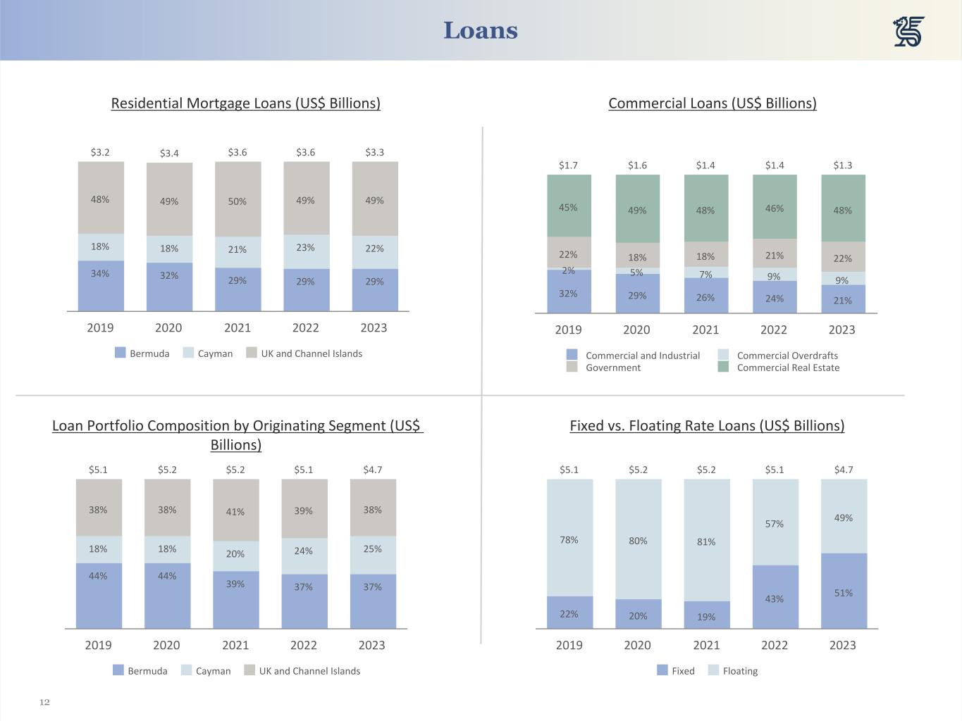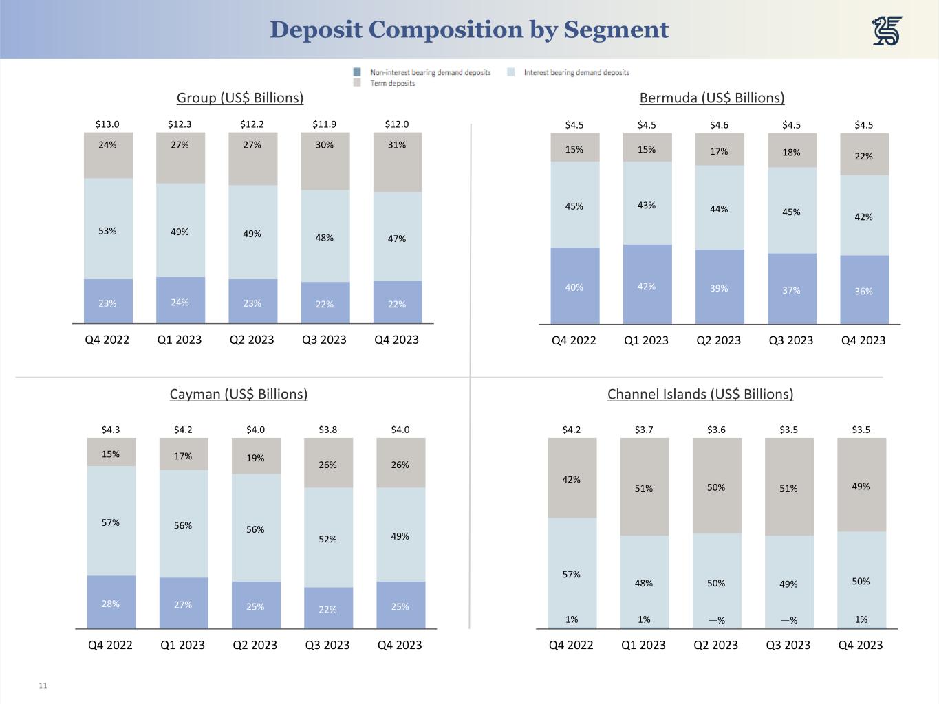 11 Group (US$ Billions) Bermuda (US$ Billions) Deposit Composition by Segment Cayman (US$ Billions) Channel Islands (US$ Billions) 23% 24% 23% 22% 22% 53% 49% 49% 48% 47% 24% 27% 27% 30% 31% $13.0 $12.3 $12.2 $11.9 $12.0 Q4 2022 Q1 2023 Q2 2023 Q3 2023 Q4 2023 28% 27% 25% 22% 25% 57% 56% 56% 52% 49% 15% 17% 19% 26% 26% $4.3 $4.2 $4.0 $3.8 $4.0 Q4 2022 Q1 2023 Q2 2023 Q3 2023 Q4 2023 40% 42% 39% 37% 36% 45% 43% 44% 45% 42% 15% 15% 17% 18% 22% $4.5 $4.5 $4.6 $4.5 $4.5 Q4 2022 Q1 2023 Q2 2023 Q3 2023 Q4 2023 1% 1% —% —% 1% 57% 48% 50% 49% 50% 42% 51% 50% 51% 49% $4.2 $3.7 $3.6 $3.5 $3.5 Q4 2022 Q1 2023 Q2 2023 Q3 2023 Q4 2023