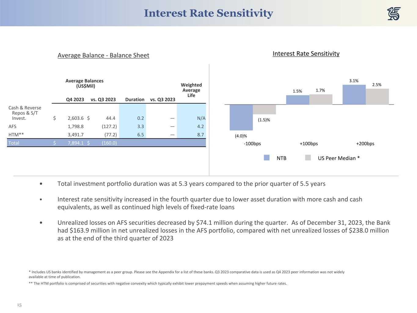 15 Interest Rate Sensitivity Interest Rate SensitivityAverage Balance - Balance Sheet Average Balances (US$Mil) Weighted Average Life Q4 2023 vs. Q3 2023 Duration vs. Q3 2023 Cash & Reverse Repos & S/T Invest. $ 2,603.6 $ 44.4 0.2 — N/A AFS 1,798.8 (127.2) 3.3 — 4.2 HTM** 3,491.7 (77.2) 6.5 — 8.7 Total $ 7,894.1 $ (160.0) (4.0)% 1.5% 3.1% (1.5)% 1.7% 2.5% NTB US Peer Median * -100bps +100bps +200bps • Total investment portfolio duration was at 5.3 years compared to the prior quarter of 5.5 years • Interest rate sensitivity increased in the fourth quarter due to lower asset duration with more cash and cash equivalents, as well as continued high levels of fixed-rate loans • Unrealized losses on AFS securities decreased by $74.1 million during the quarter. As of December 31, 2023, the Bank had $163.9 million in net unrealized losses in the AFS portfolio, compared with net unrealized losses of $238.0 million as at the end of the third quarter of 2023 * Includes US banks identified by management as a peer group. Please see the Appendix for a list of these banks. Q3 2023 comparative data is used as Q4 2023 peer information was not widely available at time of publication. ** The HTM portfolio is comprised of securities with negative convexity which typically exhibit lower prepayment speeds when assuming higher future rates.