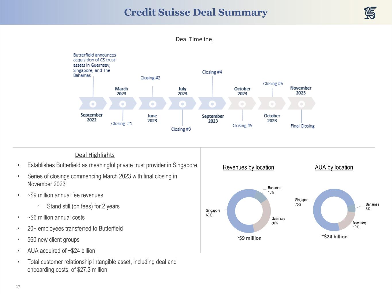 17 Credit Suisse Deal Summary • Establishes Butterfield as meaningful private trust provider in Singapore • Series of closings commencing March 2023 with final closing in November 2023 • ~$9 million annual fee revenues ◦ Stand still (on fees) for 2 years • ~$6 million annual costs • 20+ employees transferred to Butterfield • 560 new client groups • AUA acquired of ~$24 billion • Total customer relationship intangible asset, including deal and onboarding costs, of $27.3 million Deal Highlights Revenues by location Singapore 60% Bahamas 10% Guernsey 30% ~$9 million AUA by location Singapore 75% Bahamas 6% Guernsey 19% ~$24 billion Deal Timeline