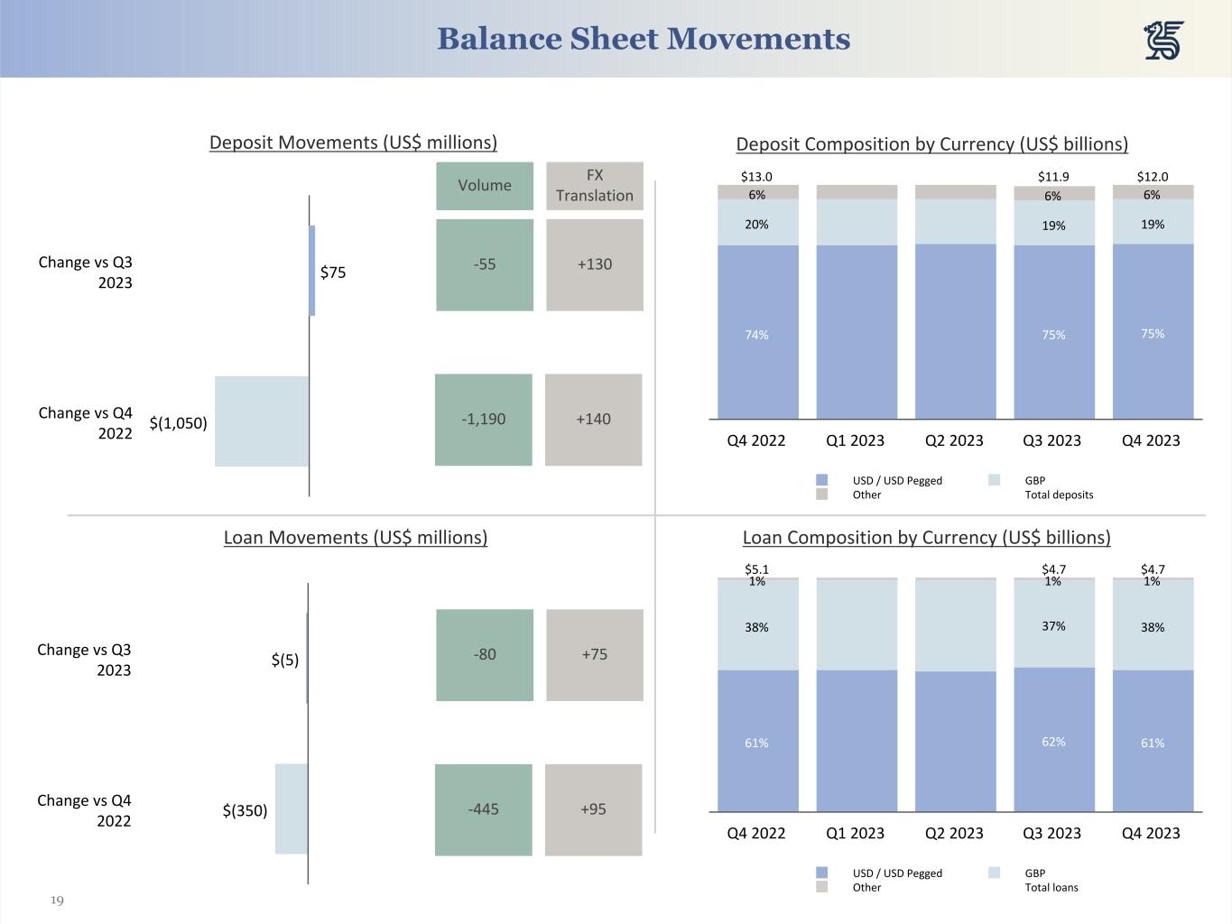 19 Balance Sheet Movements Deposit Composition by Currency (US$ billions)Deposit Movements (US$ millions) $75 $(1,050) Change vs Q3 2023 Change vs Q4 2022 Loan Movements (US$ millions) Loan Composition by Currency (US$ billions) -55 +130 $(5) $(350) Change vs Q3 2023 Change vs Q4 2022 Volume FX Translation 74% 75% 75% 20% 19% 19% 6% 6% 6% $13.0 $11.9 $12.0 USD / USD Pegged GBP Other Total deposits Q4 2022 Q1 2023 Q2 2023 Q3 2023 Q4 2023 61% 62% 61% 38% 37% 38% 1% 1% 1% $5.1 $4.7 $4.7 USD / USD Pegged GBP Other Total loans Q4 2022 Q1 2023 Q2 2023 Q3 2023 Q4 2023 -1,190 +140 -80 +75 -445 +95