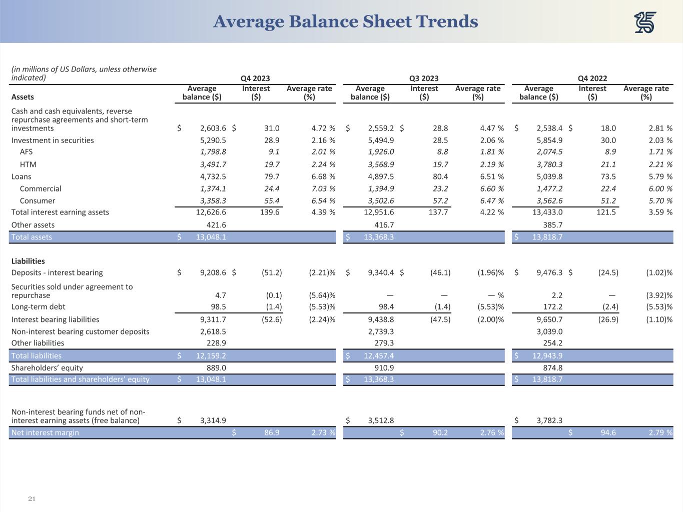 21 (in millions of US Dollars, unless otherwise indicated) Q4 2023 Q3 2023 Q4 2022 Assets Average balance ($) Interest ($) Average rate (%) Average balance ($) Interest ($) Average rate (%) Average balance ($) Interest ($) Average rate (%) Cash and cash equivalents, reverse repurchase agreements and short-term investments $ 2,603.6 $ 31.0 4.72 % $ 2,559.2 $ 28.8 4.47 % $ 2,538.4 $ 18.0 2.81 % Investment in securities 5,290.5 28.9 2.16 % 5,494.9 28.5 2.06 % 5,854.9 30.0 2.03 % AFS 1,798.8 9.1 2.01 % 1,926.0 8.8 1.81 % 2,074.5 8.9 1.71 % HTM 3,491.7 19.7 2.24 % 3,568.9 19.7 2.19 % 3,780.3 21.1 2.21 % Loans 4,732.5 79.7 6.68 % 4,897.5 80.4 6.51 % 5,039.8 73.5 5.79 % Commercial 1,374.1 24.4 7.03 % 1,394.9 23.2 6.60 % 1,477.2 22.4 6.00 % Consumer 3,358.3 55.4 6.54 % 3,502.6 57.2 6.47 % 3,562.6 51.2 5.70 % Total interest earning assets 12,626.6 139.6 4.39 % 12,951.6 137.7 4.22 % 13,433.0 121.5 3.59 % Other assets 421.6 416.7 385.7 Total assets $ 13,048.1 $ 13,368.3 $ 13,818.7 Liabilities Deposits - interest bearing $ 9,208.6 $ (51.2) (2.21) % $ 9,340.4 $ (46.1) (1.96) % $ 9,476.3 $ (24.5) (1.02) % Securities sold under agreement to repurchase 4.7 (0.1) (5.64) % — — — % 2.2 — (3.92) % Long-term debt 98.5 (1.4) (5.53) % 98.4 (1.4) (5.53) % 172.2 (2.4) (5.53) % Interest bearing liabilities 9,311.7 (52.6) (2.24) % 9,438.8 (47.5) (2.00) % 9,650.7 (26.9) (1.10) % Non-interest bearing customer deposits 2,618.5 2,739.3 3,039.0 Other liabilities 228.9 279.3 254.2 Total liabilities $ 12,159.2 $ 12,457.4 $ 12,943.9 Shareholders’ equity 889.0 910.9 874.8 Total liabilities and shareholders’ equity $ 13,048.1 $ 13,368.3 $ 13,818.7 Non-interest bearing funds net of non- interest earning assets (free balance) $ 3,314.9 $ 3,512.8 $ 3,782.3 Net interest margin $ 86.9 2.73 % $ 90.2 2.76 % $ 94.6 2.79 % Average Balance Sheet Trends