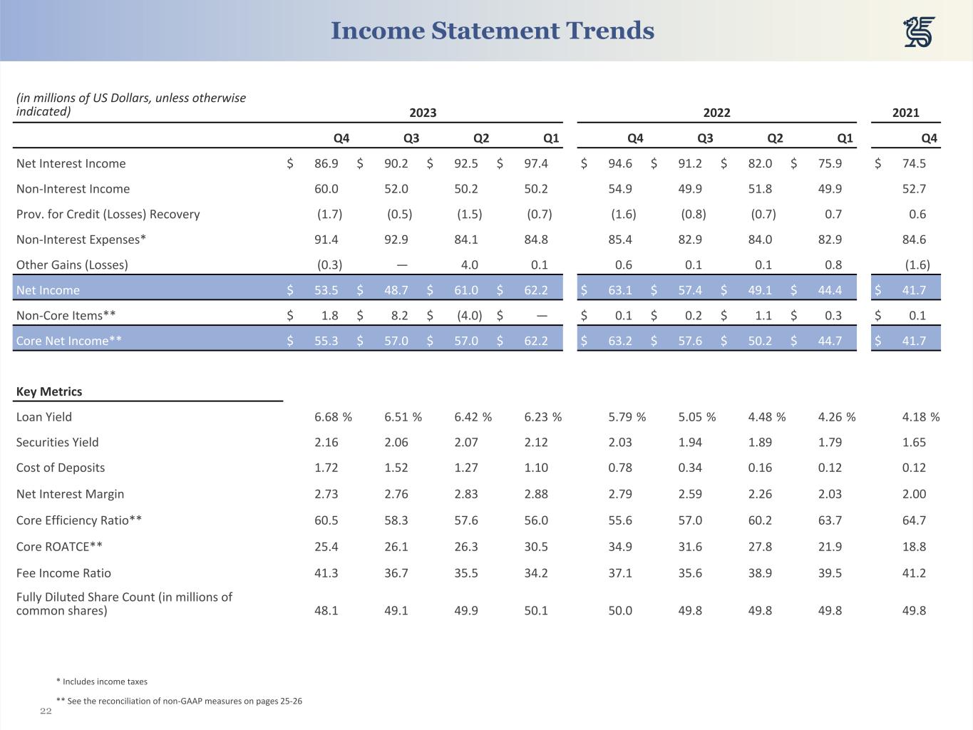 22 (in millions of US Dollars, unless otherwise indicated) 2023 2022 2021 Q4 Q3 Q2 Q1 Q4 Q3 Q2 Q1 Q4 Net Interest Income $ 86.9 $ 90.2 $ 92.5 $ 97.4 $ 94.6 $ 91.2 $ 82.0 $ 75.9 $ 74.5 Non-Interest Income 60.0 52.0 50.2 50.2 54.9 49.9 51.8 49.9 52.7 Prov. for Credit (Losses) Recovery (1.7) (0.5) (1.5) (0.7) (1.6) (0.8) (0.7) 0.7 0.6 Non-Interest Expenses* 91.4 92.9 84.1 84.8 85.4 82.9 84.0 82.9 84.6 Other Gains (Losses) (0.3) — 4.0 0.1 0.6 0.1 0.1 0.8 (1.6) Net Income $ 53.5 $ 48.7 $ 61.0 $ 62.2 $ 63.1 $ 57.4 $ 49.1 $ 44.4 $ 41.7 Non-Core Items** $ 1.8 $ 8.2 $ (4.0) $ — $ 0.1 $ 0.2 $ 1.1 $ 0.3 $ 0.1 Core Net Income** $ 55.3 $ 57.0 $ 57.0 $ 62.2 $ 63.2 $ 57.6 $ 50.2 $ 44.7 $ 41.7 Key Metrics Loan Yield 6.68 % 6.51 % 6.42 % 6.23 % 5.79 % 5.05 % 4.48 % 4.26 % 4.18 % Securities Yield 2.16 2.06 2.07 2.12 2.03 1.94 1.89 1.79 1.65 Cost of Deposits 1.72 1.52 1.27 1.10 0.78 0.34 0.16 0.12 0.12 Net Interest Margin 2.73 2.76 2.83 2.88 2.79 2.59 2.26 2.03 2.00 Core Efficiency Ratio** 60.5 58.3 57.6 56.0 55.6 57.0 60.2 63.7 64.7 Core ROATCE** 25.4 26.1 26.3 30.5 34.9 31.6 27.8 21.9 18.8 Fee Income Ratio 41.3 36.7 35.5 34.2 37.1 35.6 38.9 39.5 41.2 Fully Diluted Share Count (in millions of common shares) 48.1 49.1 49.9 50.1 50.0 49.8 49.8 49.8 49.8 * Includes income taxes ** See the reconciliation of non-GAAP measures on pages 25-26 Income Statement Trends