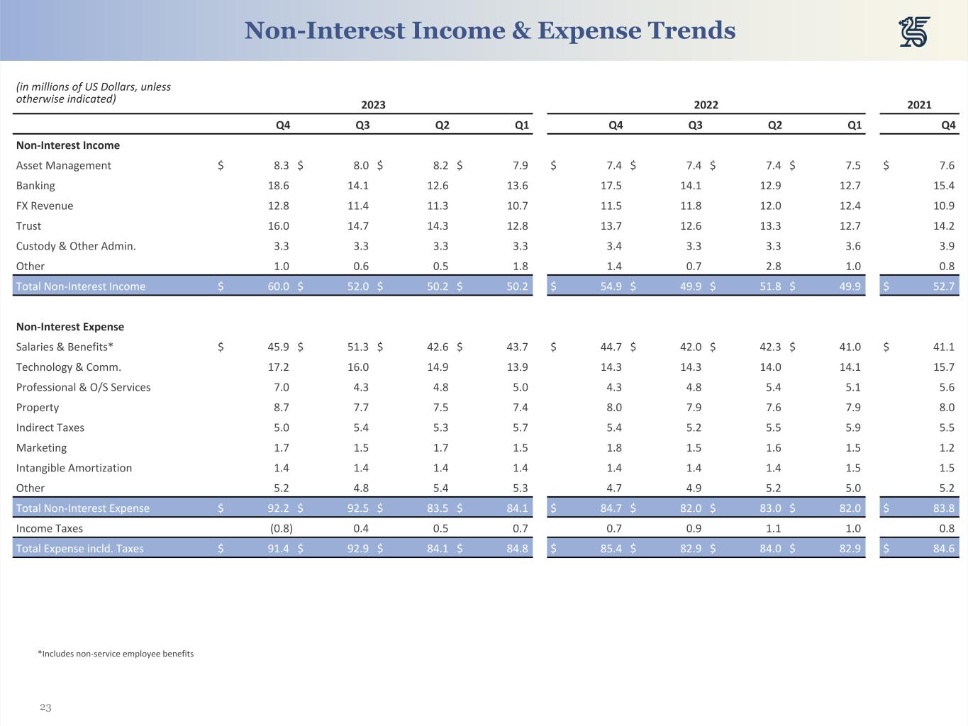 23 (in millions of US Dollars, unless otherwise indicated) 2023 2022 2021 Q4 Q3 Q2 Q1 Q4 Q3 Q2 Q1 Q4 Non-Interest Income Asset Management $ 8.3 $ 8.0 $ 8.2 $ 7.9 $ 7.4 $ 7.4 $ 7.4 $ 7.5 $ 7.6 Banking 18.6 14.1 12.6 13.6 17.5 14.1 12.9 12.7 15.4 FX Revenue 12.8 11.4 11.3 10.7 11.5 11.8 12.0 12.4 10.9 Trust 16.0 14.7 14.3 12.8 13.7 12.6 13.3 12.7 14.2 Custody & Other Admin. 3.3 3.3 3.3 3.3 3.4 3.3 3.3 3.6 3.9 Other 1.0 0.6 0.5 1.8 1.4 0.7 2.8 1.0 0.8 Total Non-Interest Income $ 60.0 $ 52.0 $ 50.2 $ 50.2 $ 54.9 $ 49.9 $ 51.8 $ 49.9 $ 52.7 Non-Interest Expense Salaries & Benefits* $ 45.9 $ 51.3 $ 42.6 $ 43.7 $ 44.7 $ 42.0 $ 42.3 $ 41.0 $ 41.1 Technology & Comm. 17.2 16.0 14.9 13.9 14.3 14.3 14.0 14.1 15.7 Professional & O/S Services 7.0 4.3 4.8 5.0 4.3 4.8 5.4 5.1 5.6 Property 8.7 7.7 7.5 7.4 8.0 7.9 7.6 7.9 8.0 Indirect Taxes 5.0 5.4 5.3 5.7 5.4 5.2 5.5 5.9 5.5 Marketing 1.7 1.5 1.7 1.5 1.8 1.5 1.6 1.5 1.2 Intangible Amortization 1.4 1.4 1.4 1.4 1.4 1.4 1.4 1.5 1.5 Other 5.2 4.8 5.4 5.3 4.7 4.9 5.2 5.0 5.2 Total Non-Interest Expense $ 92.2 $ 92.5 $ 83.5 $ 84.1 $ 84.7 $ 82.0 $ 83.0 $ 82.0 $ 83.8 Income Taxes (0.8) 0.4 0.5 0.7 0.7 0.9 1.1 1.0 0.8 Total Expense incld. Taxes $ 91.4 $ 92.9 $ 84.1 $ 84.8 $ 85.4 $ 82.9 $ 84.0 $ 82.9 $ 84.6 *Includes non-service employee benefits Non-Interest Income & Expense Trends