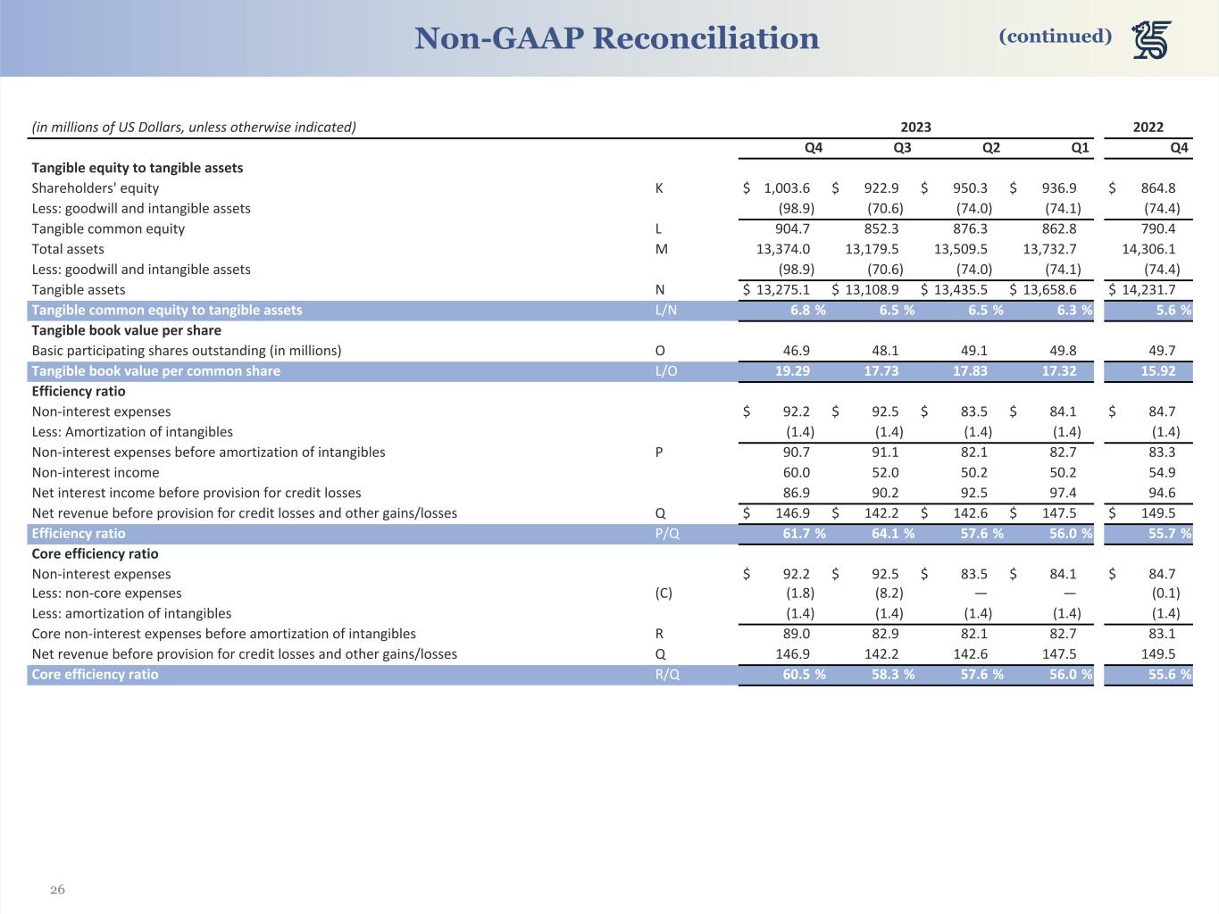 26 (in millions of US Dollars, unless otherwise indicated) 2023 2022 Q4 Q3 Q2 Q1 Q4 Tangible equity to tangible assets Shareholders' equity K $ 1,003.6 $ 922.9 $ 950.3 $ 936.9 $ 864.8 Less: goodwill and intangible assets (98.9) (70.6) (74.0) (74.1) (74.4) Tangible common equity L 904.7 852.3 876.3 862.8 790.4 Total assets M 13,374.0 13,179.5 13,509.5 13,732.7 14,306.1 Less: goodwill and intangible assets (98.9) (70.6) (74.0) (74.1) (74.4) Tangible assets N $ 13,275.1 $ 13,108.9 $ 13,435.5 $ 13,658.6 $ 14,231.7 Tangible common equity to tangible assets L/N 6.8 % 6.5 % 6.5 % 6.3 % 5.6 % Tangible book value per share Basic participating shares outstanding (in millions) O 46.9 48.1 49.1 49.8 49.7 Tangible book value per common share L/O 19.29 17.73 17.83 17.32 15.92 Efficiency ratio Non-interest expenses $ 92.2 $ 92.5 $ 83.5 $ 84.1 $ 84.7 Less: Amortization of intangibles (1.4) (1.4) (1.4) (1.4) (1.4) Non-interest expenses before amortization of intangibles P 90.7 91.1 82.1 82.7 83.3 Non-interest income 60.0 52.0 50.2 50.2 54.9 Net interest income before provision for credit losses 86.9 90.2 92.5 97.4 94.6 Net revenue before provision for credit losses and other gains/losses Q $ 146.9 $ 142.2 $ 142.6 $ 147.5 $ 149.5 Efficiency ratio P/Q 61.7 % 64.1 % 57.6 % 56.0 % 55.7 % Core efficiency ratio Non-interest expenses $ 92.2 $ 92.5 $ 83.5 $ 84.1 $ 84.7 Less: non-core expenses (C) (1.8) (8.2) — — (0.1) Less: amortization of intangibles (1.4) (1.4) (1.4) (1.4) (1.4) Core non-interest expenses before amortization of intangibles R 89.0 82.9 82.1 82.7 83.1 Net revenue before provision for credit losses and other gains/losses Q 146.9 142.2 142.6 147.5 149.5 Core efficiency ratio R/Q 60.5 % 58.3 % 57.6 % 56.0 % 55.6 % Non-GAAP Reconciliation (continued)
