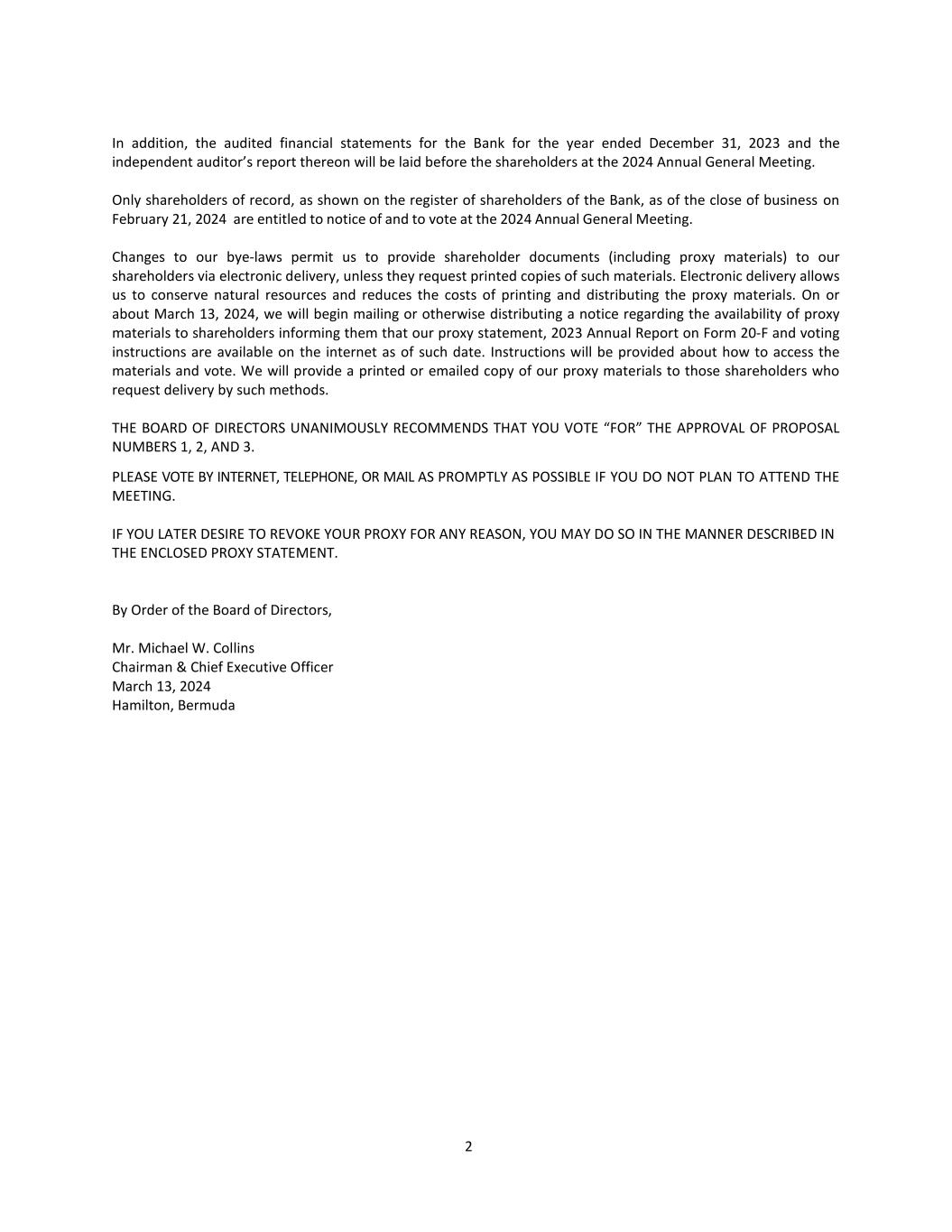2 In addition, the audited financial statements for the Bank for the year ended December 31, 2023 and the independent auditor’s report thereon will be laid before the shareholders at the 2024 Annual General Meeting. Only shareholders of record, as shown on the register of shareholders of the Bank, as of the close of business on February 21, 2024 are entitled to notice of and to vote at the 2024 Annual General Meeting. Changes to our bye-laws permit us to provide shareholder documents (including proxy materials) to our shareholders via electronic delivery, unless they request printed copies of such materials. Electronic delivery allows us to conserve natural resources and reduces the costs of printing and distributing the proxy materials. On or about March 13, 2024, we will begin mailing or otherwise distributing a notice regarding the availability of proxy materials to shareholders informing them that our proxy statement, 2023 Annual Report on Form 20-F and voting instructions are available on the internet as of such date. Instructions will be provided about how to access the materials and vote. We will provide a printed or emailed copy of our proxy materials to those shareholders who request delivery by such methods. THE BOARD OF DIRECTORS UNANIMOUSLY RECOMMENDS THAT YOU VOTE “FOR” THE APPROVAL OF PROPOSAL NUMBERS 1, 2, AND 3. PLEASE VOTE BY INTERNET, TELEPHONE, OR MAIL AS PROMPTLY AS POSSIBLE IF YOU DO NOT PLAN TO ATTEND THE MEETING. IF YOU LATER DESIRE TO REVOKE YOUR PROXY FOR ANY REASON, YOU MAY DO SO IN THE MANNER DESCRIBED IN THE ENCLOSED PROXY STATEMENT. By Order of the Board of Directors, Mr. Michael W. Collins Chairman & Chief Executive Officer March 13, 2024 Hamilton, Bermuda