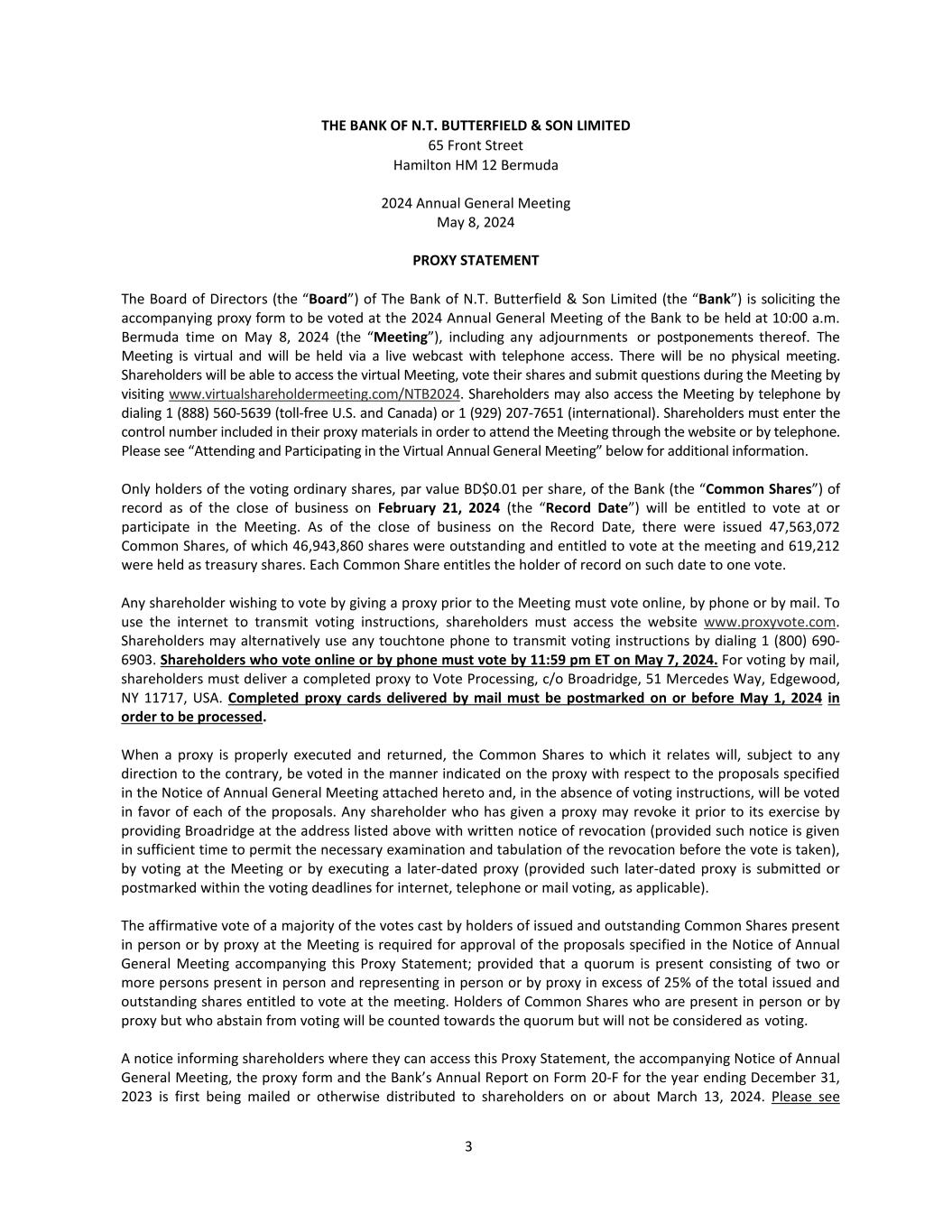 3 THE BANK OF N.T. BUTTERFIELD & SON LIMITED 65 Front Street Hamilton HM 12 Bermuda 2024 Annual General Meeting May 8, 2024 PROXY STATEMENT The Board of Directors (the “Board”) of The Bank of N.T. Butterfield & Son Limited (the “Bank”) is soliciting the accompanying proxy form to be voted at the 2024 Annual General Meeting of the Bank to be held at 10:00 a.m. Bermuda time on May 8, 2024 (the “Meeting”), including any adjournments or postponements thereof. The Meeting is virtual and will be held via a live webcast with telephone access. There will be no physical meeting. Shareholders will be able to access the virtual Meeting, vote their shares and submit questions during the Meeting by visiting www.virtualshareholdermeeting.com/NTB2024. Shareholders may also access the Meeting by telephone by dialing 1 (888) 560-5639 (toll-free U.S. and Canada) or 1 (929) 207-7651 (international). Shareholders must enter the control number included in their proxy materials in order to attend the Meeting through the website or by telephone. Please see “Attending and Participating in the Virtual Annual General Meeting” below for additional information. Only holders of the voting ordinary shares, par value BD$0.01 per share, of the Bank (the “Common Shares”) of record as of the close of business on February 21, 2024 (the “Record Date”) will be entitled to vote at or participate in the Meeting. As of the close of business on the Record Date, there were issued 47,563,072 Common Shares, of which 46,943,860 shares were outstanding and entitled to vote at the meeting and 619,212 were held as treasury shares. Each Common Share entitles the holder of record on such date to one vote. Any shareholder wishing to vote by giving a proxy prior to the Meeting must vote online, by phone or by mail. To use the internet to transmit voting instructions, shareholders must access the website www.proxyvote.com. Shareholders may alternatively use any touchtone phone to transmit voting instructions by dialing 1 (800) 690- 6903. Shareholders who vote online or by phone must vote by 11:59 pm ET on May 7, 2024. For voting by mail, shareholders must deliver a completed proxy to Vote Processing, c/o Broadridge, 51 Mercedes Way, Edgewood, NY 11717, USA. Completed proxy cards delivered by mail must be postmarked on or before May 1, 2024 in order to be processed. When a proxy is properly executed and returned, the Common Shares to which it relates will, subject to any direction to the contrary, be voted in the manner indicated on the proxy with respect to the proposals specified in the Notice of Annual General Meeting attached hereto and, in the absence of voting instructions, will be voted in favor of each of the proposals. Any shareholder who has given a proxy may revoke it prior to its exercise by providing Broadridge at the address listed above with written notice of revocation (provided such notice is given in sufficient time to permit the necessary examination and tabulation of the revocation before the vote is taken), by voting at the Meeting or by executing a later-dated proxy (provided such later-dated proxy is submitted or postmarked within the voting deadlines for internet, telephone or mail voting, as applicable). The affirmative vote of a majority of the votes cast by holders of issued and outstanding Common Shares present in person or by proxy at the Meeting is required for approval of the proposals specified in the Notice of Annual General Meeting accompanying this Proxy Statement; provided that a quorum is present consisting of two or more persons present in person and representing in person or by proxy in excess of 25% of the total issued and outstanding shares entitled to vote at the meeting. Holders of Common Shares who are present in person or by proxy but who abstain from voting will be counted towards the quorum but will not be considered as voting. A notice informing shareholders where they can access this Proxy Statement, the accompanying Notice of Annual General Meeting, the proxy form and the Bank’s Annual Report on Form 20-F for the year ending December 31, 2023 is first being mailed or otherwise distributed to shareholders on or about March 13, 2024. Please see