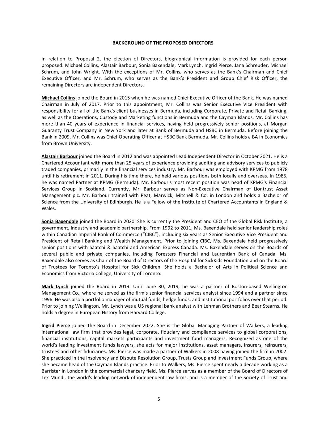 5 BACKGROUND OF THE PROPOSED DIRECTORS In relation to Proposal 2, the election of Directors, biographical information is provided for each person proposed: Michael Collins, Alastair Barbour, Sonia Baxendale, Mark Lynch, Ingrid Pierce, Jana Schreuder, Michael Schrum, and John Wright. With the exceptions of Mr. Collins, who serves as the Bank’s Chairman and Chief Executive Officer, and Mr. Schrum, who serves as the Bank’s President and Group Chief Risk Officer, the remaining Directors are independent Directors. Michael Collins joined the Board in 2015 when he was named Chief Executive Officer of the Bank. He was named Chairman in July of 2017. Prior to this appointment, Mr. Collins was Senior Executive Vice President with responsibility for all of the Bank's client businesses in Bermuda, including Corporate, Private and Retail Banking, as well as the Operations, Custody and Marketing functions in Bermuda and the Cayman Islands. Mr. Collins has more than 40 years of experience in financial services, having held progressively senior positions, at Morgan Guaranty Trust Company in New York and later at Bank of Bermuda and HSBC in Bermuda. Before joining the Bank in 2009, Mr. Collins was Chief Operating Officer at HSBC Bank Bermuda. Mr. Collins holds a BA in Economics from Brown University. Alastair Barbour joined the Board in 2012 and was appointed Lead Independent Director in October 2021. He is a Chartered Accountant with more than 25 years of experience providing auditing and advisory services to publicly traded companies, primarily in the financial services industry. Mr. Barbour was employed with KPMG from 1978 until his retirement in 2011. During his time there, he held various positions both locally and overseas. In 1985, he was named Partner at KPMG (Bermuda). Mr. Barbour's most recent position was head of KPMG's Financial Services Group in Scotland. Currently, Mr. Barbour serves as Non-Executive Chairman of Liontrust Asset Management plc. Mr. Barbour trained with Peat, Marwick, Mitchell & Co. in London and holds a Bachelor of Science from the University of Edinburgh. He is a Fellow of the Institute of Chartered Accountants in England & Wales. Sonia Baxendale joined the Board in 2020. She is currently the President and CEO of the Global Risk Institute, a government, industry and academic partnership. From 1992 to 2011, Ms. Baxendale held senior leadership roles within Canadian Imperial Bank of Commerce (“CIBC”), including six years as Senior Executive Vice President and President of Retail Banking and Wealth Management. Prior to joining CIBC, Ms. Baxendale held progressively senior positions with Saatchi & Saatchi and American Express Canada. Ms. Baxendale serves on the Boards of several public and private companies, including Foresters Financial and Laurentian Bank of Canada. Ms. Baxendale also serves as Chair of the Board of Directors of the Hospital for SickKids Foundation and on the Board of Trustees for Toronto’s Hospital for Sick Children. She holds a Bachelor of Arts in Political Science and Economics from Victoria College, University of Toronto. Mark Lynch joined the Board in 2019. Until June 30, 2019, he was a partner of Boston-based Wellington Management Co., where he served as the firm’s senior financial services analyst since 1994 and a partner since 1996. He was also a portfolio manager of mutual funds, hedge funds, and institutional portfolios over that period. Prior to joining Wellington, Mr. Lynch was a US regional bank analyst with Lehman Brothers and Bear Stearns. He holds a degree in European History from Harvard College. Ingrid Pierce joined the Board in December 2022. She is the Global Managing Partner of Walkers, a leading international law firm that provides legal, corporate, fiduciary and compliance services to global corporations, financial institutions, capital markets participants and investment fund managers. Recognized as one of the world's leading investment funds lawyers, she acts for major institutions, asset managers, insurers, reinsurers, trustees and other fiduciaries. Ms. Pierce was made a partner of Walkers in 2008 having joined the firm in 2002. She practiced in the Insolvency and Dispute Resolution Group, Trusts Group and Investment Funds Group, where she became head of the Cayman Islands practice. Prior to Walkers, Ms. Pierce spent nearly a decade working as a Barrister in London in the commercial chancery field. Ms. Pierce serves as a member of the Board of Directors of Lex Mundi, the world's leading network of independent law firms, and is a member of the Society of Trust and