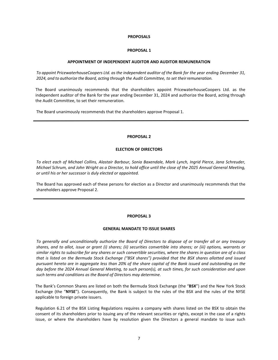 7 PROPOSALS PROPOSAL 1 APPOINTMENT OF INDEPENDENT AUDITOR AND AUDITOR REMUNERATION To appoint PricewaterhouseCoopers Ltd. as the independent auditor of the Bank for the year ending December 31, 2024, and to authorize the Board, acting through the Audit Committee, to set their remuneration. The Board unanimously recommends that the shareholders appoint PricewaterhouseCoopers Ltd. as the independent auditor of the Bank for the year ending December 31, 2024 and authorize the Board, acting through the Audit Committee, to set their remuneration. The Board unanimously recommends that the shareholders approve Proposal 1. PROPOSAL 2 ELECTION OF DIRECTORS To elect each of Michael Collins, Alastair Barbour, Sonia Baxendale, Mark Lynch, Ingrid Pierce, Jana Schreuder, Michael Schrum, and John Wright as a Director, to hold office until the close of the 2025 Annual General Meeting, or until his or her successor is duly elected or appointed. The Board has approved each of these persons for election as a Director and unanimously recommends that the shareholders approve Proposal 2. PROPOSAL 3 GENERAL MANDATE TO ISSUE SHARES To generally and unconditionally authorize the Board of Directors to dispose of or transfer all or any treasury shares, and to allot, issue or grant (i) shares; (ii) securities convertible into shares; or (iii) options, warrants or similar rights to subscribe for any shares or such convertible securities, where the shares in question are of a class that is listed on the Bermuda Stock Exchange (“BSX shares”) provided that the BSX shares allotted and issued pursuant hereto are in aggregate less than 20% of the share capital of the Bank issued and outstanding on the day before the 2024 Annual General Meeting, to such person(s), at such times, for such consideration and upon such terms and conditions as the Board of Directors may determine. The Bank’s Common Shares are listed on both the Bermuda Stock Exchange (the “BSX”) and the New York Stock Exchange (the “NYSE”). Consequently, the Bank is subject to the rules of the BSX and the rules of the NYSE applicable to foreign private issuers. Regulation 6.21 of the BSX Listing Regulations requires a company with shares listed on the BSX to obtain the consent of its shareholders prior to issuing any of the relevant securities or rights, except in the case of a rights issue, or where the shareholders have by resolution given the Directors a general mandate to issue such