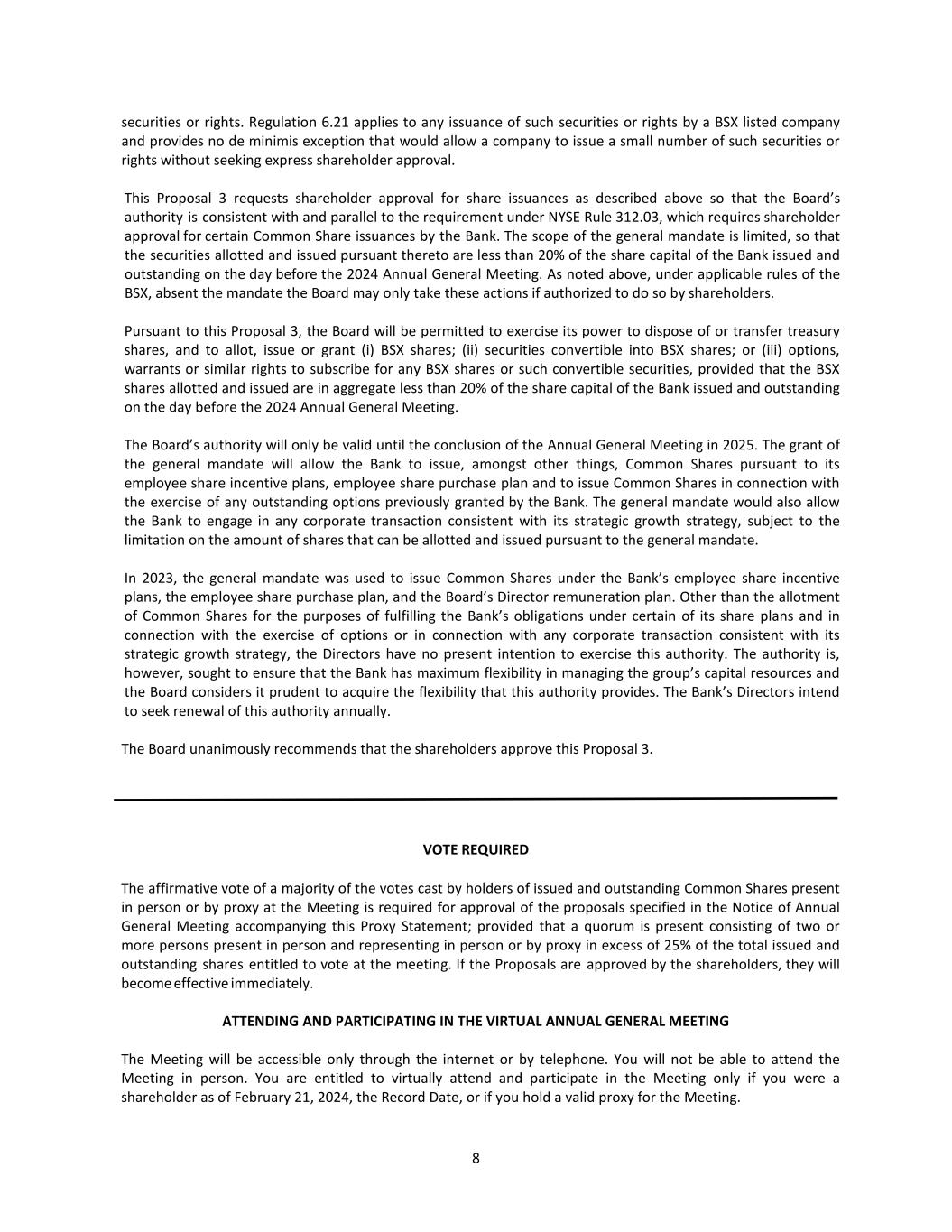 8 securities or rights. Regulation 6.21 applies to any issuance of such securities or rights by a BSX listed company and provides no de minimis exception that would allow a company to issue a small number of such securities or rights without seeking express shareholder approval. This Proposal 3 requests shareholder approval for share issuances as described above so that the Board’s authority is consistent with and parallel to the requirement under NYSE Rule 312.03, which requires shareholder approval for certain Common Share issuances by the Bank. The scope of the general mandate is limited, so that the securities allotted and issued pursuant thereto are less than 20% of the share capital of the Bank issued and outstanding on the day before the 2024 Annual General Meeting. As noted above, under applicable rules of the BSX, absent the mandate the Board may only take these actions if authorized to do so by shareholders. Pursuant to this Proposal 3, the Board will be permitted to exercise its power to dispose of or transfer treasury shares, and to allot, issue or grant (i) BSX shares; (ii) securities convertible into BSX shares; or (iii) options, warrants or similar rights to subscribe for any BSX shares or such convertible securities, provided that the BSX shares allotted and issued are in aggregate less than 20% of the share capital of the Bank issued and outstanding on the day before the 2024 Annual General Meeting. The Board’s authority will only be valid until the conclusion of the Annual General Meeting in 2025. The grant of the general mandate will allow the Bank to issue, amongst other things, Common Shares pursuant to its employee share incentive plans, employee share purchase plan and to issue Common Shares in connection with the exercise of any outstanding options previously granted by the Bank. The general mandate would also allow the Bank to engage in any corporate transaction consistent with its strategic growth strategy, subject to the limitation on the amount of shares that can be allotted and issued pursuant to the general mandate. In 2023, the general mandate was used to issue Common Shares under the Bank’s employee share incentive plans, the employee share purchase plan, and the Board’s Director remuneration plan. Other than the allotment of Common Shares for the purposes of fulfilling the Bank’s obligations under certain of its share plans and in connection with the exercise of options or in connection with any corporate transaction consistent with its strategic growth strategy, the Directors have no present intention to exercise this authority. The authority is, however, sought to ensure that the Bank has maximum flexibility in managing the group’s capital resources and the Board considers it prudent to acquire the flexibility that this authority provides. The Bank’s Directors intend to seek renewal of this authority annually. The Board unanimously recommends that the shareholders approve this Proposal 3. VOTE REQUIRED The affirmative vote of a majority of the votes cast by holders of issued and outstanding Common Shares present in person or by proxy at the Meeting is required for approval of the proposals specified in the Notice of Annual General Meeting accompanying this Proxy Statement; provided that a quorum is present consisting of two or more persons present in person and representing in person or by proxy in excess of 25% of the total issued and outstanding shares entitled to vote at the meeting. If the Proposals are approved by the shareholders, they will become effective immediately. ATTENDING AND PARTICIPATING IN THE VIRTUAL ANNUAL GENERAL MEETING The Meeting will be accessible only through the internet or by telephone. You will not be able to attend the Meeting in person. You are entitled to virtually attend and participate in the Meeting only if you were a shareholder as of February 21, 2024, the Record Date, or if you hold a valid proxy for the Meeting.