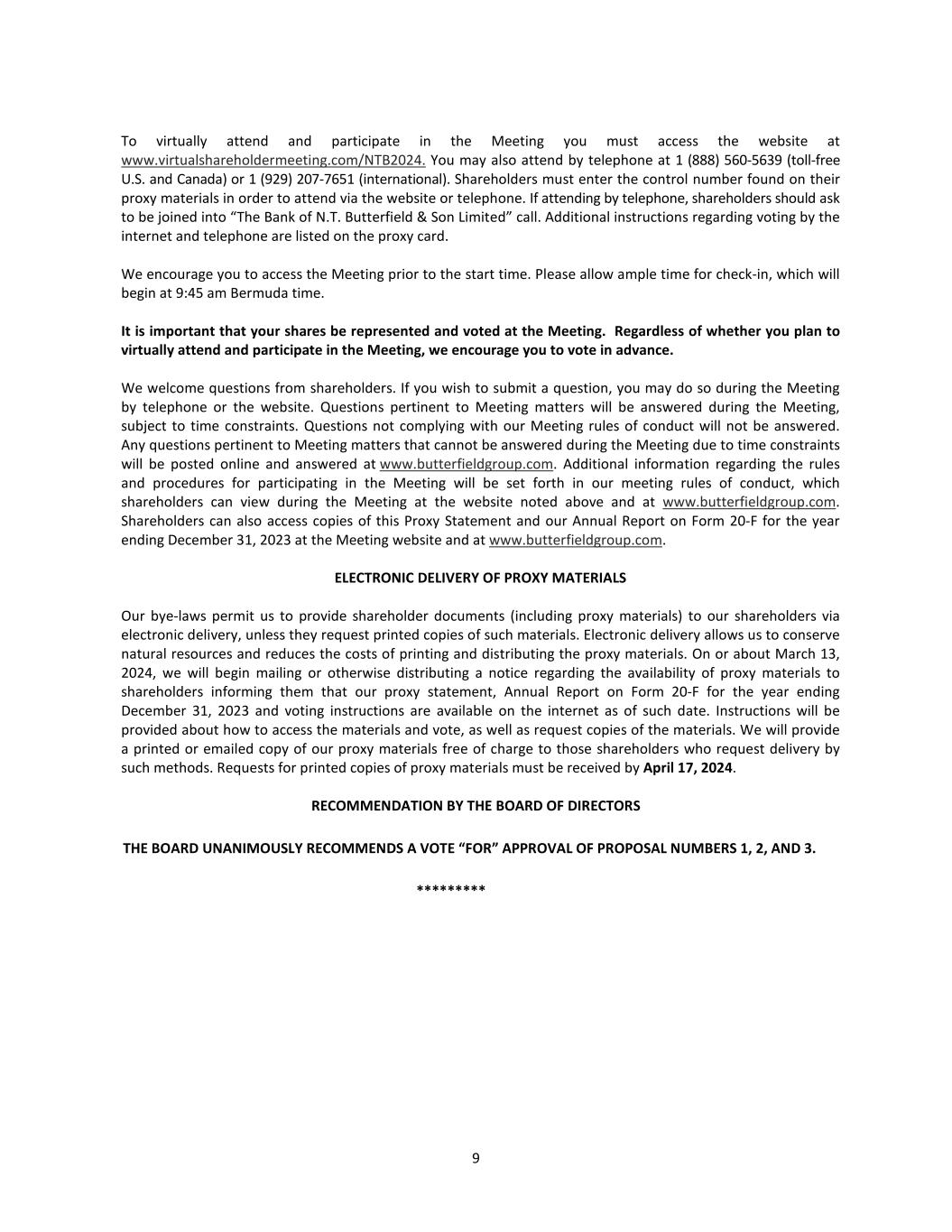 9 To virtually attend and participate in the Meeting you must access the website at www.virtualshareholdermeeting.com/NTB2024. You may also attend by telephone at 1 (888) 560-5639 (toll-free U.S. and Canada) or 1 (929) 207-7651 (international). Shareholders must enter the control number found on their proxy materials in order to attend via the website or telephone. If attending by telephone, shareholders should ask to be joined into “The Bank of N.T. Butterfield & Son Limited” call. Additional instructions regarding voting by the internet and telephone are listed on the proxy card. We encourage you to access the Meeting prior to the start time. Please allow ample time for check-in, which will begin at 9:45 am Bermuda time. It is important that your shares be represented and voted at the Meeting. Regardless of whether you plan to virtually attend and participate in the Meeting, we encourage you to vote in advance. We welcome questions from shareholders. If you wish to submit a question, you may do so during the Meeting by telephone or the website. Questions pertinent to Meeting matters will be answered during the Meeting, subject to time constraints. Questions not complying with our Meeting rules of conduct will not be answered. Any questions pertinent to Meeting matters that cannot be answered during the Meeting due to time constraints will be posted online and answered at www.butterfieldgroup.com. Additional information regarding the rules and procedures for participating in the Meeting will be set forth in our meeting rules of conduct, which shareholders can view during the Meeting at the website noted above and at www.butterfieldgroup.com. Shareholders can also access copies of this Proxy Statement and our Annual Report on Form 20-F for the year ending December 31, 2023 at the Meeting website and at www.butterfieldgroup.com. ELECTRONIC DELIVERY OF PROXY MATERIALS Our bye-laws permit us to provide shareholder documents (including proxy materials) to our shareholders via electronic delivery, unless they request printed copies of such materials. Electronic delivery allows us to conserve natural resources and reduces the costs of printing and distributing the proxy materials. On or about March 13, 2024, we will begin mailing or otherwise distributing a notice regarding the availability of proxy materials to shareholders informing them that our proxy statement, Annual Report on Form 20-F for the year ending December 31, 2023 and voting instructions are available on the internet as of such date. Instructions will be provided about how to access the materials and vote, as well as request copies of the materials. We will provide a printed or emailed copy of our proxy materials free of charge to those shareholders who request delivery by such methods. Requests for printed copies of proxy materials must be received by April 17, 2024. RECOMMENDATION BY THE BOARD OF DIRECTORS THE BOARD UNANIMOUSLY RECOMMENDS A VOTE “FOR” APPROVAL OF PROPOSAL NUMBERS 1, 2, AND 3. *********