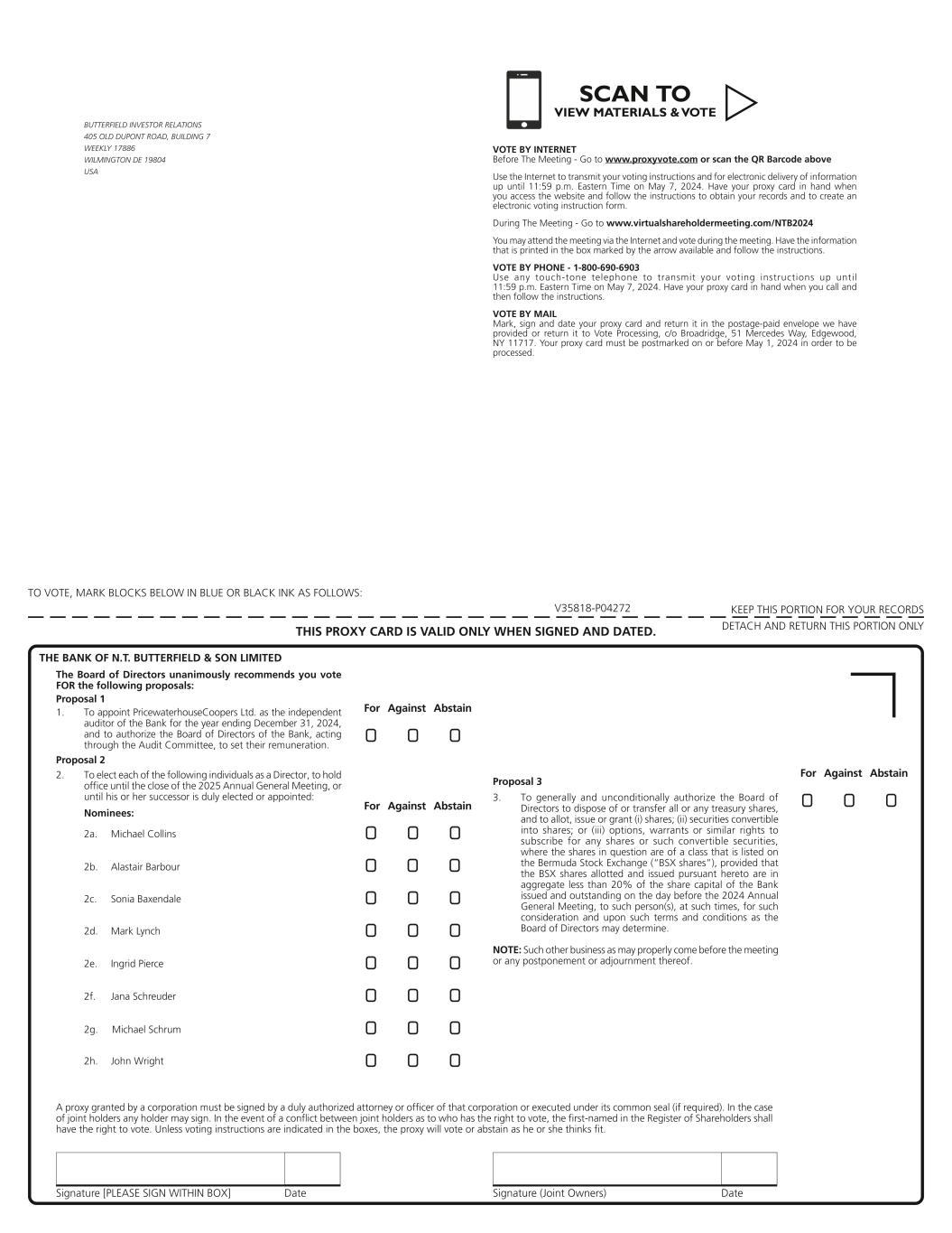 Signature [PLEASE SIGN WITHIN BOX] Date Signature (Joint Owners) Date TO VOTE, MARK BLOCKS BELOW IN BLUE OR BLACK INK AS FOLLOWS: KEEP THIS PORTION FOR YOUR RECORDS DETACH AND RETURN THIS PORTION ONLYTHIS PROXY CARD IS VALID ONLY WHEN SIGNED AND DATED. V35818-P04272 For Against Abstain ! !! ! !! ! !! ! !! ! !! ! !! ! !! ! !! ! !! BUTTERFIELD INVESTOR RELATIONS 405 OLD DUPONT ROAD, BUILDING 7 WEEKLY 17886 WILMINGTON DE 19804 USA THE BANK OF N.T. BUTTERFIELD & SON LIMITED 2g. Michael Schrum 1. To appoint PricewaterhouseCoopers Ltd. as the independent auditor of the Bank for the year ending December 31, 2024, and to authorize the Board of Directors of the Bank, acting through the Audit Committee, to set their remuneration. 2a. Michael Collins 2b. Alastair Barbour 2e. Ingrid Pierce 2c. Sonia Baxendale 2d. Mark Lynch 2f. Jana Schreuder 2. To elect each of the following individuals as a Director, to hold office until the close of the 2025 Annual General Meeting, or until his or her successor is duly elected or appointed: Nominees: The Board of Directors unanimously recommends you vote FOR the following proposals: 3. To generally and unconditionally authorize the Board of Directors to dispose of or transfer all or any treasury shares, and to allot, issue or grant (i) shares; (ii) securities convertible into shares; or (iii) options, warrants or similar rights to subscribe for any shares or such convertible securities, where the shares in question are of a class that is listed on the Bermuda Stock Exchange (“BSX shares”), provided that the BSX shares allotted and issued pursuant hereto are in aggregate less than 20% of the share capital of the Bank issued and outstanding on the day before the 2024 Annual General Meeting, to such person(s), at such times, for such consideration and upon such terms and conditions as the Board of Directors may determine. 2h. John Wright Proposal 3 NOTE: Such other business as may properly come before the meeting or any postponement or adjournment thereof. A proxy granted by a corporation must be signed by a duly authorized attorney or officer of that corporation or executed under its common seal (if required). In the case of joint holders any holder may sign. In the event of a conflict between joint holders as to who has the right to vote, the first-named in the Register of Shareholders shall have the right to vote. Unless voting instructions are indicated in the boxes, the proxy will vote or abstain as he or she thinks fit. Proposal 1 Proposal 2 For Against Abstain For Against Abstain ! !! SCAN TO VIEW MATERIALS & VOTEw VOTE BY INTERNET Before The Meeting - Go to www.proxyvote.com or scan the QR Barcode above Use the Internet to transmit your voting instructions and for electronic delivery of information up until 11:59 p.m. Eastern Time on May 7, 2024. Have your proxy card in hand when you access the website and follow the instructions to obtain your records and to create an electronic voting instruction form. During The Meeting - Go to www.virtualshareholdermeeting.com/NTB2024 You may attend the meeting via the Internet and vote during the meeting. Have the information that is printed in the box marked by the arrow available and follow the instructions. VOTE BY PHONE - 1-800-690-6903 Use any touch-tone telephone to transmit your voting instructions up until 11:59 p.m. Eastern Time on May 7, 2024. Have your proxy card in hand when you call and then follow the instructions. VOTE BY MAIL Mark, sign and date your proxy card and return it in the postage-paid envelope we have provided or return it to Vote Processing, c/o Broadridge, 51 Mercedes Way, Edgewood, NY 11717. Your proxy card must be postmarked on or before May 1, 2024 in order to be processed.