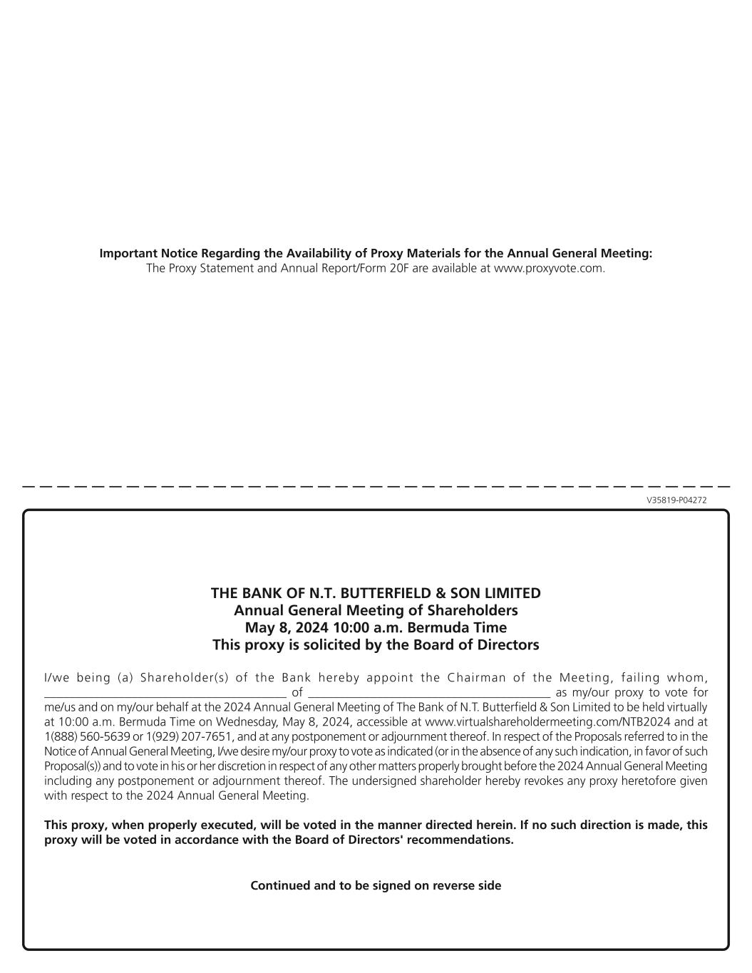 V35819-P04272 Important Notice Regarding the Availability of Proxy Materials for the Annual General Meeting: The Proxy Statement and Annual Report/Form 20F are available at www.proxyvote.com. THE BANK OF N.T. BUTTERFIELD & SON LIMITED Annual General Meeting of Shareholders May 8, 2024 10:00 a.m. Bermuda Time This proxy is solicited by the Board of Directors I /we being (a) Shareholder(s) of the Bank hereby appoint the Chairman of the Meeting, fai l ing whom, _______________________________________ of _______________________________________ as my/our proxy to vote for me/us and on my/our behalf at the 2024 Annual General Meeting of The Bank of N.T. Butterfield & Son Limited to be held virtually at 10:00 a.m. Bermuda Time on Wednesday, May 8, 2024, accessible at www.virtualshareholdermeeting.com/NTB2024 and at 1(888) 560-5639 or 1(929) 207-7651, and at any postponement or adjournment thereof. In respect of the Proposals referred to in the Notice of Annual General Meeting, I/we desire my/our proxy to vote as indicated (or in the absence of any such indication, in favor of such Proposal(s)) and to vote in his or her discretion in respect of any other matters properly brought before the 2024 Annual General Meeting including any postponement or adjournment thereof. The undersigned shareholder hereby revokes any proxy heretofore given with respect to the 2024 Annual General Meeting. This proxy, when properly executed, will be voted in the manner directed herein. If no such direction is made, this proxy will be voted in accordance with the Board of Directors' recommendations. Continued and to be signed on reverse side