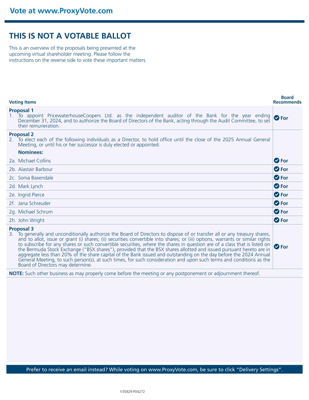 THIS IS NOT A VOTABLE BALLOT This is an overview of the proposals being presented at the upcoming virtual shareholder meeting. Please follow the instructions on the reverse side to vote these important matters. Vote at www.ProxyVote.com Prefer to receive an email instead? While voting on www.ProxyVote.com, be sure to click “Delivery Settings”. Voting Items Board Recommends V35829-P04272 Proposal 1 1. To appoint PricewaterhouseCoopers Ltd. as the independent auditor of the Bank for the year ending December 31, 2024, and to authorize the Board of Directors of the Bank, acting through the Audit Committee, to set their remuneration. For Proposal 2 2. To elect each of the following individuals as a Director, to hold office until the close of the 2025 Annual General Meeting, or until his or her successor is duly elected or appointed: Nominees: 2a. Michael Collins For 2b. Alastair Barbour For 2c. Sonia Baxendale For 2d. Mark Lynch For 2e. Ingrid Pierce For 2f. Jana Schreuder For 2g. Michael Schrum For 2h. John Wright For Proposal 3 3. To generally and unconditionally authorize the Board of Directors to dispose of or transfer all or any treasury shares, and to allot, issue or grant (i) shares; (ii) securities convertible into shares; or (iii) options, warrants or similar rights to subscribe for any shares or such convertible securities, where the shares in question are of a class that is listed on the Bermuda Stock Exchange (“BSX shares”), provided that the BSX shares allotted and issued pursuant hereto are in aggregate less than 20% of the share capital of the Bank issued and outstanding on the day before the 2024 Annual General Meeting, to such person(s), at such times, for such consideration and upon such terms and conditions as the Board of Directors may determine. For NOTE: Such other business as may properly come before the meeting or any postponement or adjournment thereof.