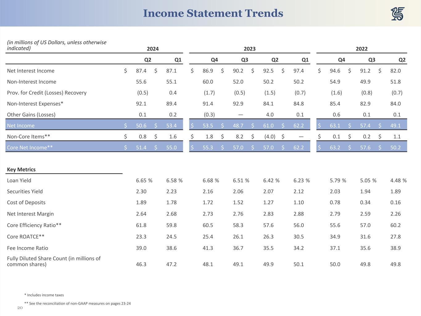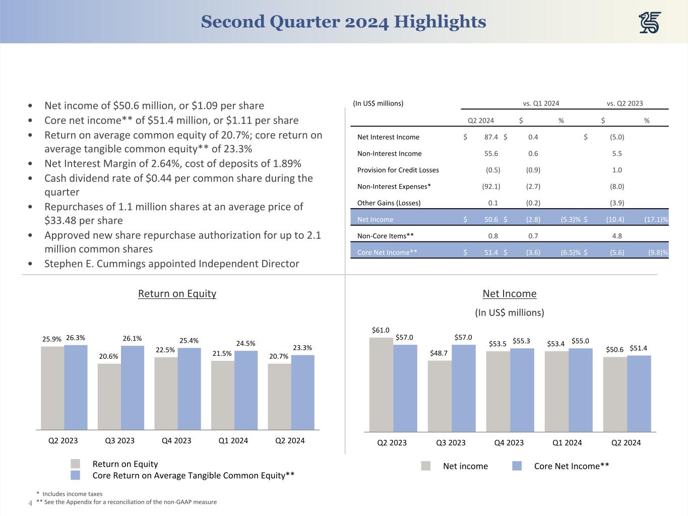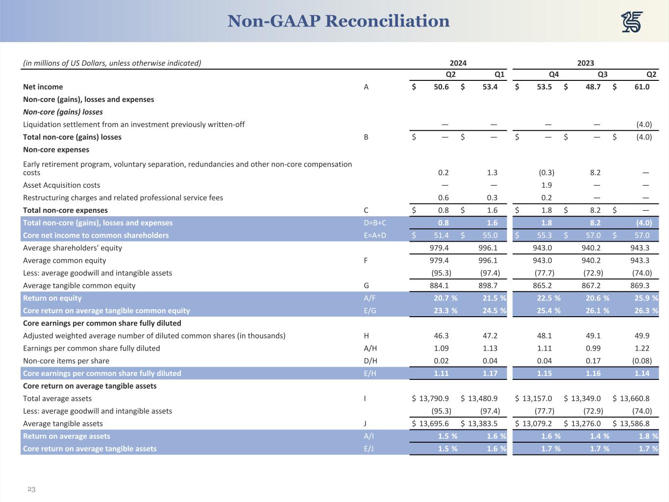 23 (in millions of US Dollars, unless otherwise indicated) 2024 2023 Q2 Q1 Q4 Q3 Q2 Net income A $ 50.6 $ 53.4 $ 53.5 $ 48.7 $ 61.0 Non-core (gains), losses and expenses Non-core (gains) losses Liquidation settlement from an investment previously written-off — — — — (4.0) Total non-core (gains) losses B $ — $ — $ — $ — $ (4.0) Non-core expenses Early retirement program, voluntary separation, redundancies and other non-core compensation costs 0.2 1.3 (0.3) 8.2 — Asset Acquisition costs — — 1.9 — — Restructuring charges and related professional service fees 0.6 0.3 0.2 — — Total non-core expenses C $ 0.8 $ 1.6 $ 1.8 $ 8.2 $ — Total non-core (gains), losses and expenses D=B+C 0.8 1.6 1.8 8.2 (4.0) Core net income to common shareholders E=A+D $ 51.4 $ 55.0 $ 55.3 $ 57.0 $ 57.0 Average shareholders' equity 979.4 996.1 943.0 940.2 943.3 Average common equity F 979.4 996.1 943.0 940.2 943.3 Less: average goodwill and intangible assets (95.3) (97.4) (77.7) (72.9) (74.0) Average tangible common equity G 884.1 898.7 865.2 867.2 869.3 Return on equity A/F 20.7 % 21.5 % 22.5 % 20.6 % 25.9 % Core return on average tangible common equity E/G 23.3 % 24.5 % 25.4 % 26.1 % 26.3 % Core earnings per common share fully diluted Adjusted weighted average number of diluted common shares (in thousands) H 46.3 47.2 48.1 49.1 49.9 Earnings per common share fully diluted A/H 1.09 1.13 1.11 0.99 1.22 Non-core items per share D/H 0.02 0.04 0.04 0.17 (0.08) Core earnings per common share fully diluted E/H 1.11 1.17 1.15 1.16 1.14 Core return on average tangible assets Total average assets I $ 13,790.9 $ 13,480.9 $ 13,157.0 $ 13,349.0 $ 13,660.8 Less: average goodwill and intangible assets (95.3) (97.4) (77.7) (72.9) (74.0) Average tangible assets J $ 13,695.6 $ 13,383.5 $ 13,079.2 $ 13,276.0 $ 13,586.8 Return on average assets A/I 1.5 % 1.6 % 1.6 % 1.4 % 1.8 % Core return on average tangible assets E/J 1.5 % 1.6 % 1.7 % 1.7 % 1.7 % Non-GAAP Reconciliation