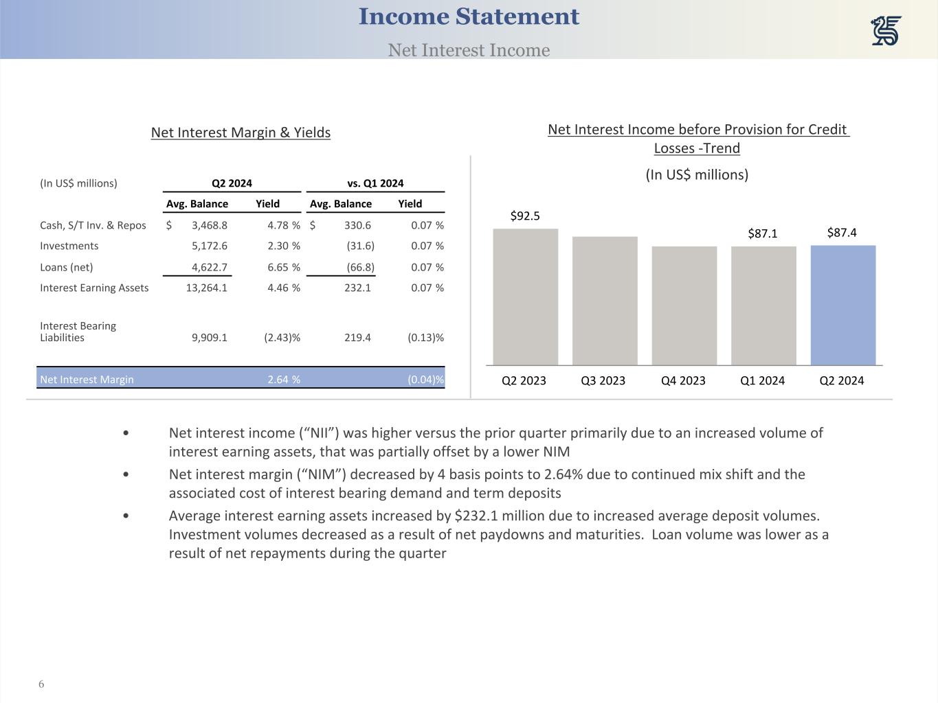 6 Net Interest Income before Provision for Credit Losses -Trend (In US$ millions) $92.5 $87.1 $87.4 Q2 2023 Q3 2023 Q4 2023 Q1 2024 Q2 2024 Net Interest Margin & Yields Income Statement Net Interest Income • Net interest income (“NII”) was higher versus the prior quarter primarily due to an increased volume of interest earning assets, that was partially offset by a lower NIM • Net interest margin (“NIM”) decreased by 4 basis points to 2.64% due to continued mix shift and the associated cost of interest bearing demand and term deposits • Average interest earning assets increased by $232.1 million due to increased average deposit volumes. Investment volumes decreased as a result of net paydowns and maturities. Loan volume was lower as a result of net repayments during the quarter (In US$ millions) Q2 2024 vs. Q1 2024 Avg. Balance Yield Avg. Balance Yield Cash, S/T Inv. & Repos $ 3,468.8 4.78 % $ 330.6 0.07 % Investments 5,172.6 2.30 % (31.6) 0.07 % Loans (net) 4,622.7 6.65 % (66.8) 0.07 % Interest Earning Assets 13,264.1 4.46 % 232.1 0.07 % Interest Bearing Liabilities 9,909.1 (2.43) % 219.4 (0.13) % Net Interest Margin 2.64 % (0.04) %