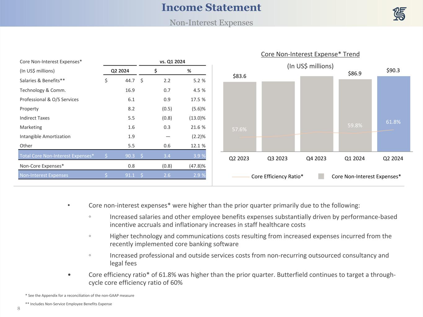 7 Non-Interest Income Trend (In US$ millions)(In US$ millions) Q2 2024 vs. Q1 2024 Asset management $ 8.9 $ — Banking 13.8 (0.5) Foreign exchange revenue 12.6 (0.6) Trust 15.4 0.4 Custody and other 3.4 0.1 Other 1.6 1.1 Total Non-Interest Income $ 55.6 $ 0.6 $50.2 $55.1 $55.6 Q2 2023 Q3 2023 Q4 2023 Q1 2024 Q2 2024 • Total non-interest income was up $0.6 million versus the prior quarter, primarily due to an increase in special trust fees, an increase in the equity pickup from a portfolio investment and higher unclaimed balances recognized into income. These increases were offset by decreases in banking and foreign exchange revenue due to lower volumes • The fee income ratio was 39.0% in the second quarter of 2024 which compares favorably to the peer average* and the 38.6% in the prior quarter Income Statement Non-Interest Income * Includes US banks identified by management as a peer group. Please see the Appendix for a list of these banks. Q1 2024 comparative data is used as Q2 2024 peer information was not widely available at time of publication.