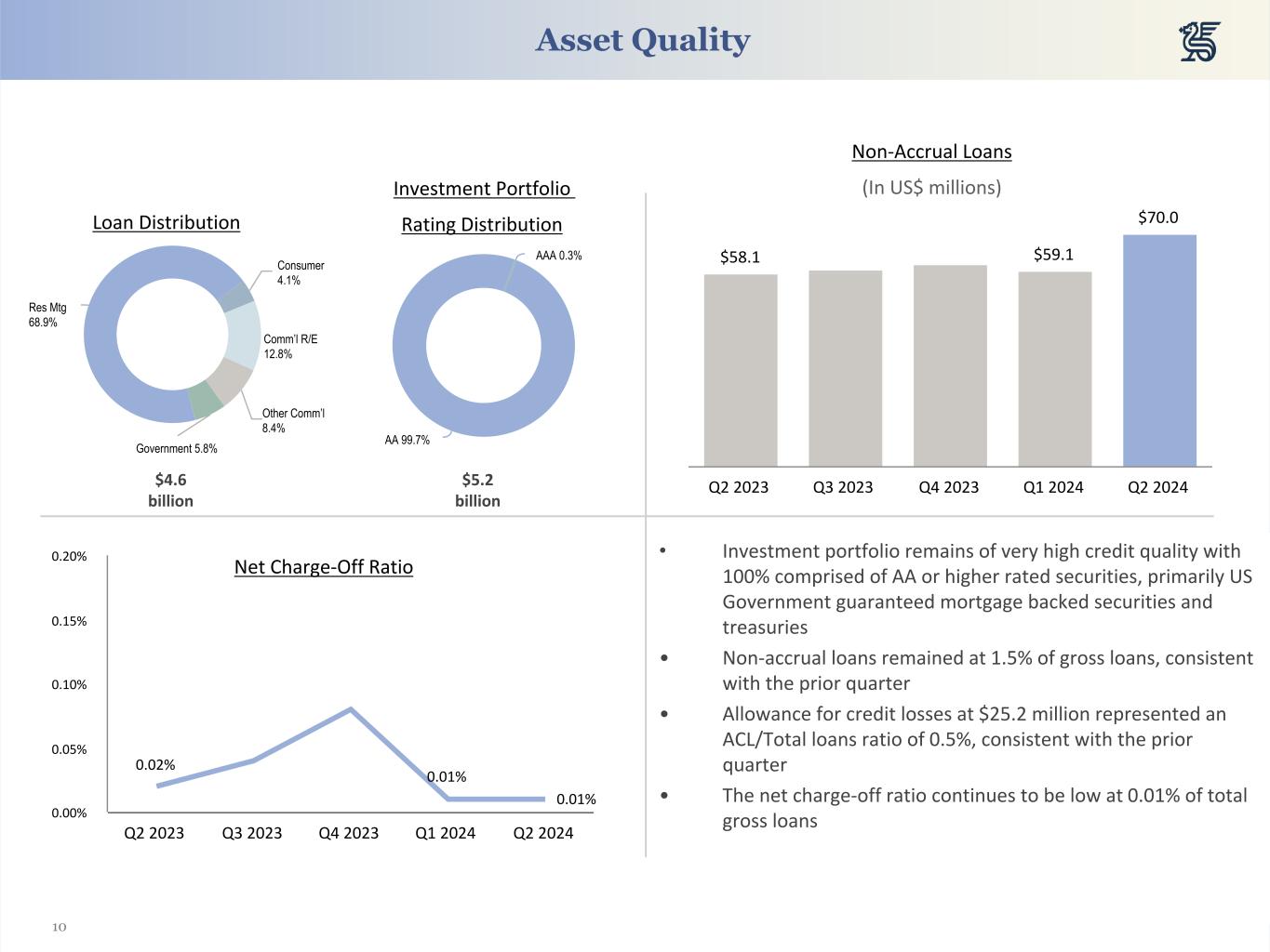 18 (in millions of US Dollars, unless otherwise indicated) 2024 2023 2022 Q2 Q1 Q4 Q3 Q2 Q1 Q4 Q3 Q2 Assets Cash and cash equivalents $ 2,390 $ 1,746 $ 1,647 $ 1,750 $ 1,795 $ 1,345 $ 2,101 $ 1,485 $ 1,340 Reverse Repos & S/T Investments 1,289 1,480 1,225 893 729 1,263 944 995 1,516 Investments 5,168 5,168 5,292 5,319 5,546 5,665 5,727 5,805 5,970 Loans, Net 4,585 4,644 4,746 4,750 5,003 5,022 5,096 4,992 5,139 Other Assets 506 490 464 468 435 438 437 422 386 Total Assets $ 13,939 $ 13,528 $ 13,374 $ 13,180 $ 13,510 $ 13,733 $ 14,306 $ 13,699 $ 14,350 Liabilities and Equity Total Deposits $ 12,548 $ 12,131 $ 11,987 $ 11,861 $ 12,192 $ 12,348 $ 12,991 $ 12,461 $ 13,075 Long-Term Debt 99 99 98 98 98 172 172 172 172 Other Liabilities 293 304 285 297 269 275 278 311 300 Total Liabilities $ 12,940 $ 12,533 $ 12,370 $ 12,257 $ 12,559 $ 12,796 $ 13,441 $ 12,944 $ 13,547 Common Equity $ 999 $ 995 $ 1,004 $ 923 $ 950 $ 937 $ 865 $ 755 $ 802 Total Equity $ 999 $ 995 $ 1,004 $ 923 $ 950 $ 937 $ 865 $ 755 $ 802 Total Liabilities and Equity $ 13,939 $ 13,528 $ 13,374 $ 13,180 $ 13,510 $ 13,733 $ 14,306 $ 13,699 $ 14,350 Key Metrics CET 1 Ratio 22.5 % 22.6 % 23.0 % 23.4 % 22.7 % 22.2 % 20.3 % 18.9 % 17.7 % Total Tier 1 Capital Ratio 22.5 % 22.6 % 23.0 % 23.4 % 22.7 % 22.2 % 20.3 % 18.9 % 17.7 % Total Capital Ratio 24.8 % 24.9 % 25.4 % 25.8 % 25.1 % 26.2 % 24.1 % 22.7 % 21.4 % Leverage ratio 7.3 % 7.5 % 7.6 % 7.8 % 7.6 % 7.2 % 6.7 % 6.4 % 5.8 % Risk-Weighted Assets (in $ millions) 4,668 4,648 4,541 4,522 4,628 4,604 4,843 4,780 4,854 Risk-Weighted Assets / total assets 33.5 % 34.4 % 34.0 % 34.3 % 34.3 % 33.5 % 33.9 % 34.9 % 33.8 % Tangible common equity ratio 6.5 % 6.7 % 6.8 % 6.5 % 6.5 % 6.3 % 5.6 % 5.0 % 5.1 % Book value per common share (in $) 22.12 21.53 21.39 19.20 19.34 18.80 17.42 15.21 16.17 Tangible book value per share (in $) 20.03 19.45 19.29 17.73 17.83 17.32 15.92 13.76 14.61 Non-accrual loans/gross loans 1.5 % 1.3 % 1.3 % 1.2 % 1.2 % 1.1 % 1.2 % 1.2 % 1.2 % Non-performing assets/total assets 1.1 % 1.2 % 1.0 % 0.8 % 0.7 % 0.6 % 0.5 % 0.5 % 0.5 % Allowance for credit losses/total loans 0.5 % 0.5 % 0.5 % 0.5 % 0.5 % 0.5 % 0.5 % 0.5 % 0.5 % Balance Sheet Trends