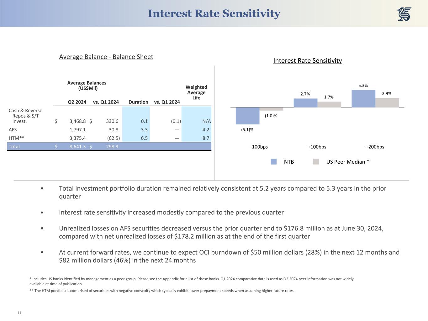 11 Interest Rate Sensitivity Interest Rate SensitivityAverage Balance - Balance Sheet Average Balances (US$Mil) Weighted Average Life Q2 2024 vs. Q1 2024 Duration vs. Q1 2024 Cash & Reverse Repos & S/T Invest. $ 3,468.8 $ 330.6 0.1 (0.1) N/A AFS 1,797.1 30.8 3.3 — 4.2 HTM** 3,375.4 (62.5) 6.5 — 8.7 Total $ 8,641.3 $ 298.9 (5.1)% 2.7% 5.3% (1.0)% 1.7% 2.9% NTB US Peer Median * -100bps +100bps +200bps • Total investment portfolio duration remained relatively consistent at 5.2 years compared to 5.3 years in the prior quarter • Interest rate sensitivity increased modestly compared to the previous quarter • Unrealized losses on AFS securities decreased versus the prior quarter end to $176.8 million as at June 30, 2024, compared with net unrealized losses of $178.2 million as at the end of the first quarter • At current forward rates, we continue to expect OCI burndown of $50 million dollars (28%) in the next 12 months and $82 million dollars (46%) in the next 24 months * Includes US banks identified by management as a peer group. Please see the Appendix for a list of these banks. Q1 2024 comparative data is used as Q2 2024 peer information was not widely available at time of publication. ** The HTM portfolio is comprised of securities with negative convexity which typically exhibit lower prepayment speeds when assuming higher future rates.