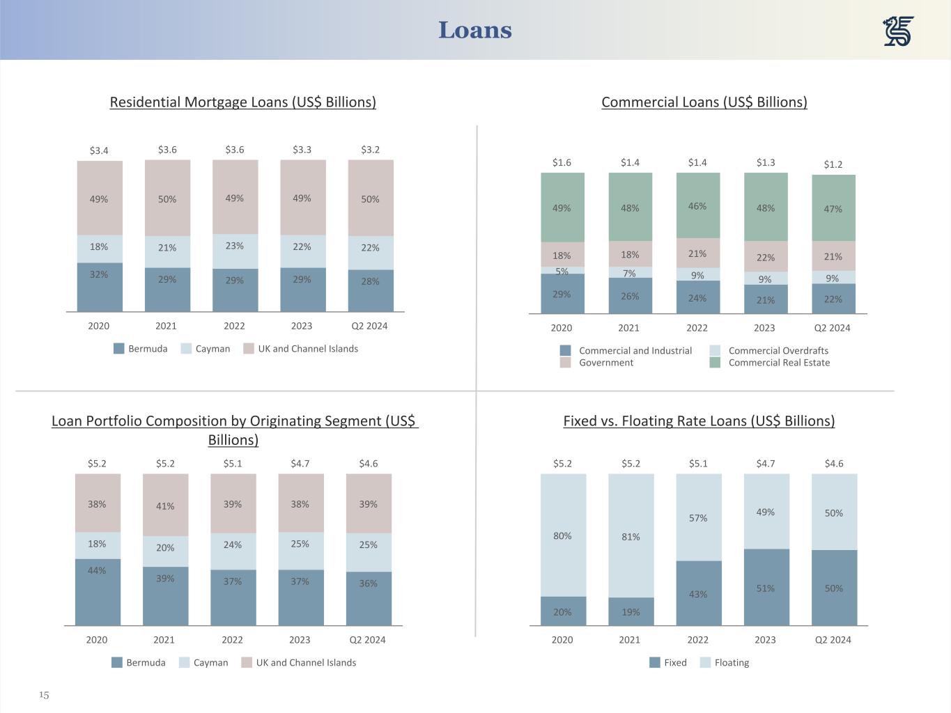 14 Group (US$ Billions) Bermuda (US$ Billions) Deposit Composition by Segment Cayman (US$ Billions) Channel Islands (US$ Billions) 23% 22% 22% 21% 20% 49% 48% 47% 46% 47% 27% 30% 31% 33% 33% $12.2 $11.9 $12.0 $12.1 $12.5 Q2 2023 Q3 2023 Q4 2023 Q1 2024 Q2 2024 25% 22% 25% 24% 23% 56% 52% 49% 50% 51% 19% 26% 26% 26% 27% $4.0 $3.8 $4.0 $3.9 $3.9 Q2 2023 Q3 2023 Q4 2023 Q1 2024 Q2 2024 39% 37% 36% 35% 34% 44% 45% 42% 43% 45% 17% 18% 22% 22% 21% $4.6 $4.5 $4.5 $4.5 $4.6 Q2 2023 Q3 2023 Q4 2023 Q1 2024 Q2 2024 —% —% 1% —% 1% 50% 49% 50% 46% 46% 50% 51% 49% 54% 53% $3.6 $3.5 $3.5 $3.7 $4.0 Q2 2023 Q3 2023 Q4 2023 Q1 2024 Q2 2024