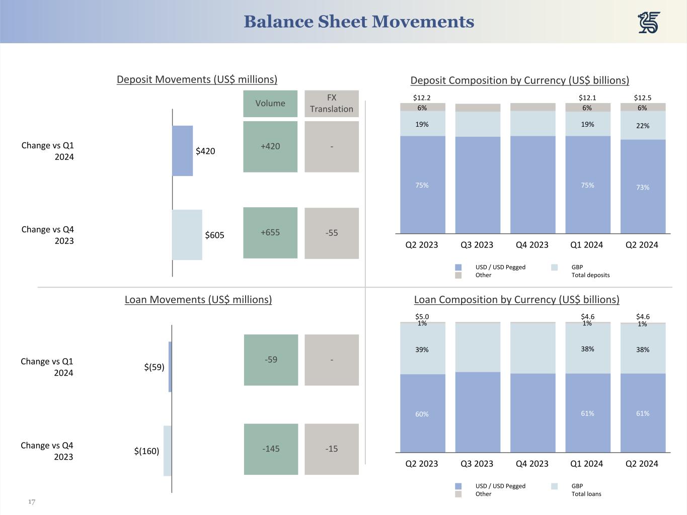 17 Balance Sheet Movements Deposit Composition by Currency (US$ billions)Deposit Movements (US$ millions) $420 $605 Change vs Q1 2024 Change vs Q4 2023 Loan Movements (US$ millions) Loan Composition by Currency (US$ billions) +420 - $(59) $(160) Change vs Q1 2024 Change vs Q4 2023 Volume FX Translation 75% 75% 73% 19% 19% 22% 6% 6% 6% $12.2 $12.1 $12.5 USD / USD Pegged GBP Other Total deposits Q2 2023 Q3 2023 Q4 2023 Q1 2024 Q2 2024 60% 61% 61% 39% 38% 38% 1% 1% 1% $5.0 $4.6 $4.6 USD / USD Pegged GBP Other Total loans Q2 2023 Q3 2023 Q4 2023 Q1 2024 Q2 2024 -145 -15 +655 -55 -59 -