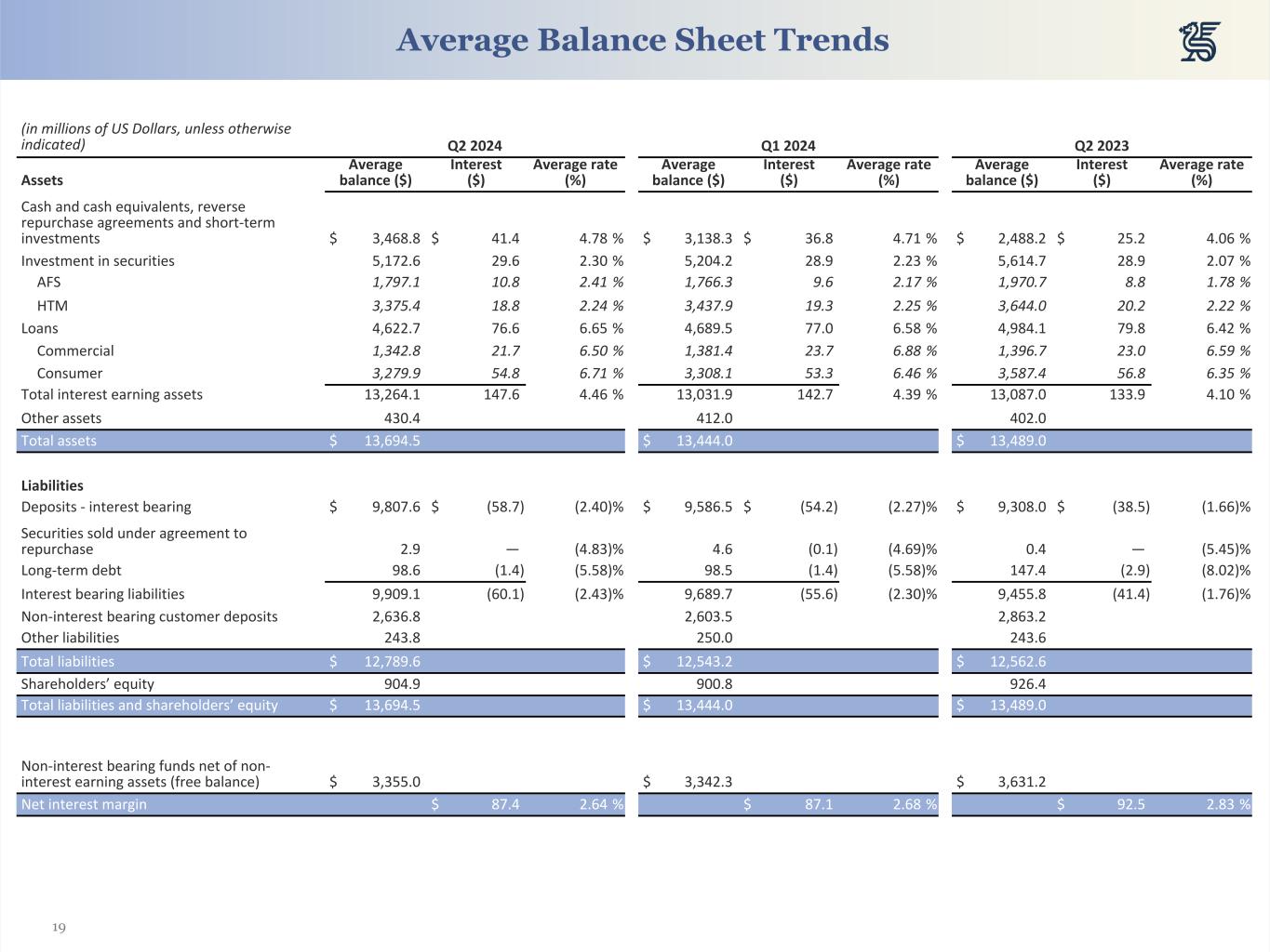 19 (in millions of US Dollars, unless otherwise indicated) Q2 2024 Q1 2024 Q2 2023 Assets Average balance ($) Interest ($) Average rate (%) Average balance ($) Interest ($) Average rate (%) Average balance ($) Interest ($) Average rate (%) Cash and cash equivalents, reverse repurchase agreements and short-term investments $ 3,468.8 $ 41.4 4.78 % $ 3,138.3 $ 36.8 4.71 % $ 2,488.2 $ 25.2 4.06 % Investment in securities 5,172.6 29.6 2.30 % 5,204.2 28.9 2.23 % 5,614.7 28.9 2.07 % AFS 1,797.1 10.8 2.41 % 1,766.3 9.6 2.17 % 1,970.7 8.8 1.78 % HTM 3,375.4 18.8 2.24 % 3,437.9 19.3 2.25 % 3,644.0 20.2 2.22 % Loans 4,622.7 76.6 6.65 % 4,689.5 77.0 6.58 % 4,984.1 79.8 6.42 % Commercial 1,342.8 21.7 6.50 % 1,381.4 23.7 6.88 % 1,396.7 23.0 6.59 % Consumer 3,279.9 54.8 6.71 % 3,308.1 53.3 6.46 % 3,587.4 56.8 6.35 % Total interest earning assets 13,264.1 147.6 4.46 % 13,031.9 142.7 4.39 % 13,087.0 133.9 4.10 % Other assets 430.4 412.0 402.0 Total assets $ 13,694.5 $ 13,444.0 $ 13,489.0 Liabilities Deposits - interest bearing $ 9,807.6 $ (58.7) (2.40) % $ 9,586.5 $ (54.2) (2.27) % $ 9,308.0 $ (38.5) (1.66) % Securities sold under agreement to repurchase 2.9 — (4.83) % 4.6 (0.1) (4.69) % 0.4 — (5.45) % Long-term debt 98.6 (1.4) (5.58) % 98.5 (1.4) (5.58) % 147.4 (2.9) (8.02) % Interest bearing liabilities 9,909.1 (60.1) (2.43) % 9,689.7 (55.6) (2.30) % 9,455.8 (41.4) (1.76) % Non-interest bearing customer deposits 2,636.8 2,603.5 2,863.2 Other liabilities 243.8 250.0 243.6 Total liabilities $ 12,789.6 $ 12,543.2 $ 12,562.6 Shareholders’ equity 904.9 900.8 926.4 Total liabilities and shareholders’ equity $ 13,694.5 $ 13,444.0 $ 13,489.0 Non-interest bearing funds net of non- interest earning assets (free balance) $ 3,355.0 $ 3,342.3 $ 3,631.2 Net interest margin $ 87.4 2.64 % $ 87.1 2.68 % $ 92.5 2.83 % Average Balance Sheet Trends
