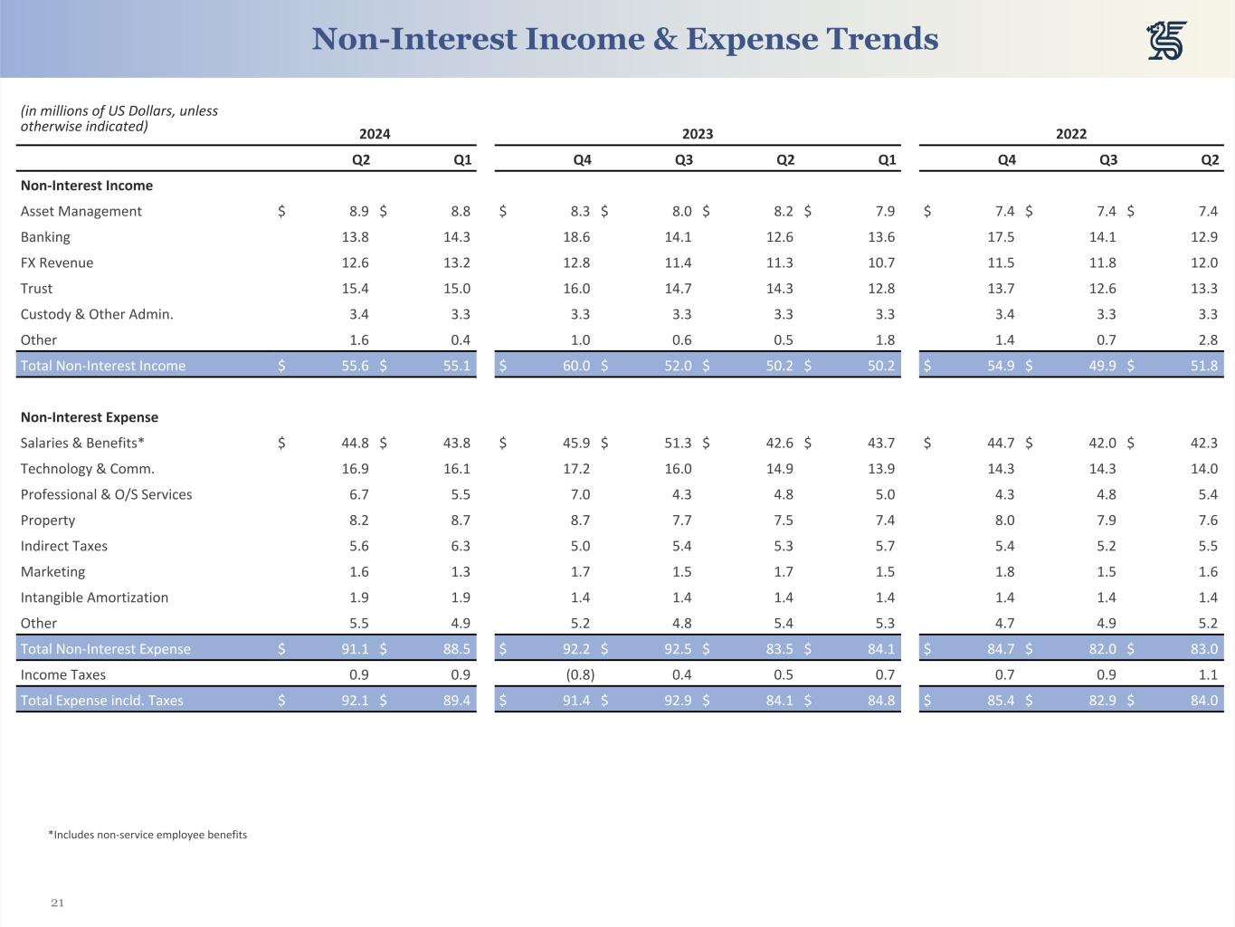 21 (in millions of US Dollars, unless otherwise indicated) 2024 2023 2022 Q2 Q1 Q4 Q3 Q2 Q1 Q4 Q3 Q2 Non-Interest Income Asset Management $ 8.9 $ 8.8 $ 8.3 $ 8.0 $ 8.2 $ 7.9 $ 7.4 $ 7.4 $ 7.4 Banking 13.8 14.3 18.6 14.1 12.6 13.6 17.5 14.1 12.9 FX Revenue 12.6 13.2 12.8 11.4 11.3 10.7 11.5 11.8 12.0 Trust 15.4 15.0 16.0 14.7 14.3 12.8 13.7 12.6 13.3 Custody & Other Admin. 3.4 3.3 3.3 3.3 3.3 3.3 3.4 3.3 3.3 Other 1.6 0.4 1.0 0.6 0.5 1.8 1.4 0.7 2.8 Total Non-Interest Income $ 55.6 $ 55.1 $ 60.0 $ 52.0 $ 50.2 $ 50.2 $ 54.9 $ 49.9 $ 51.8 Non-Interest Expense Salaries & Benefits* $ 44.8 $ 43.8 $ 45.9 $ 51.3 $ 42.6 $ 43.7 $ 44.7 $ 42.0 $ 42.3 Technology & Comm. 16.9 16.1 17.2 16.0 14.9 13.9 14.3 14.3 14.0 Professional & O/S Services 6.7 5.5 7.0 4.3 4.8 5.0 4.3 4.8 5.4 Property 8.2 8.7 8.7 7.7 7.5 7.4 8.0 7.9 7.6 Indirect Taxes 5.6 6.3 5.0 5.4 5.3 5.7 5.4 5.2 5.5 Marketing 1.6 1.3 1.7 1.5 1.7 1.5 1.8 1.5 1.6 Intangible Amortization 1.9 1.9 1.4 1.4 1.4 1.4 1.4 1.4 1.4 Other 5.5 4.9 5.2 4.8 5.4 5.3 4.7 4.9 5.2 Total Non-Interest Expense $ 91.1 $ 88.5 $ 92.2 $ 92.5 $ 83.5 $ 84.1 $ 84.7 $ 82.0 $ 83.0 Income Taxes 0.9 0.9 (0.8) 0.4 0.5 0.7 0.7 0.9 1.1 Total Expense incld. Taxes $ 92.1 $ 89.4 $ 91.4 $ 92.9 $ 84.1 $ 84.8 $ 85.4 $ 82.9 $ 84.0 *Includes non-service employee benefits Non-Interest Income & Expense Trends