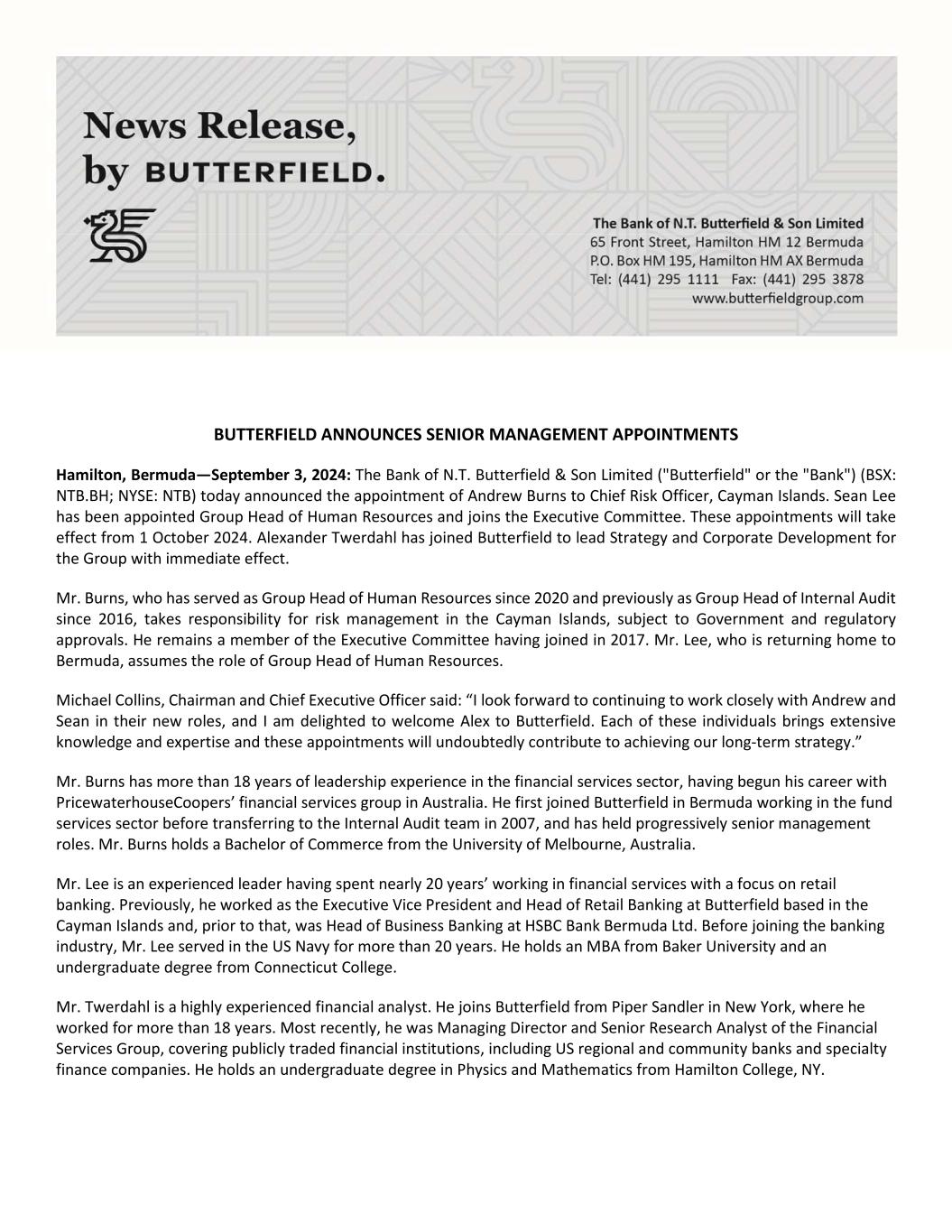 BUTTERFIELD ANNOUNCES SENIOR MANAGEMENT APPOINTMENTS Hamilton, Bermuda—September 3, 2024: The Bank of N.T. Butterfield & Son Limited ("Butterfield" or the "Bank") (BSX: NTB.BH; NYSE: NTB) today announced the appointment of Andrew Burns to Chief Risk Officer, Cayman Islands. Sean Lee has been appointed Group Head of Human Resources and joins the Executive Committee. These appointments will take effect from 1 October 2024. Alexander Twerdahl has joined Butterfield to lead Strategy and Corporate Development for the Group with immediate effect. Mr. Burns, who has served as Group Head of Human Resources since 2020 and previously as Group Head of Internal Audit since 2016, takes responsibility for risk management in the Cayman Islands, subject to Government and regulatory approvals. He remains a member of the Executive Committee having joined in 2017. Mr. Lee, who is returning home to Bermuda, assumes the role of Group Head of Human Resources. Michael Collins, Chairman and Chief Executive Officer said: “I look forward to continuing to work closely with Andrew and Sean in their new roles, and I am delighted to welcome Alex to Butterfield. Each of these individuals brings extensive knowledge and expertise and these appointments will undoubtedly contribute to achieving our long-term strategy.” Mr. Burns has more than 18 years of leadership experience in the financial services sector, having begun his career with PricewaterhouseCoopers’ financial services group in Australia. He first joined Butterfield in Bermuda working in the fund services sector before transferring to the Internal Audit team in 2007, and has held progressively senior management roles. Mr. Burns holds a Bachelor of Commerce from the University of Melbourne, Australia. Mr. Lee is an experienced leader having spent nearly 20 years’ working in financial services with a focus on retail banking. Previously, he worked as the Executive Vice President and Head of Retail Banking at Butterfield based in the Cayman Islands and, prior to that, was Head of Business Banking at HSBC Bank Bermuda Ltd. Before joining the banking industry, Mr. Lee served in the US Navy for more than 20 years. He holds an MBA from Baker University and an undergraduate degree from Connecticut College. Mr. Twerdahl is a highly experienced financial analyst. He joins Butterfield from Piper Sandler in New York, where he worked for more than 18 years. Most recently, he was Managing Director and Senior Research Analyst of the Financial Services Group, covering publicly traded financial institutions, including US regional and community banks and specialty finance companies. He holds an undergraduate degree in Physics and Mathematics from Hamilton College, NY.
