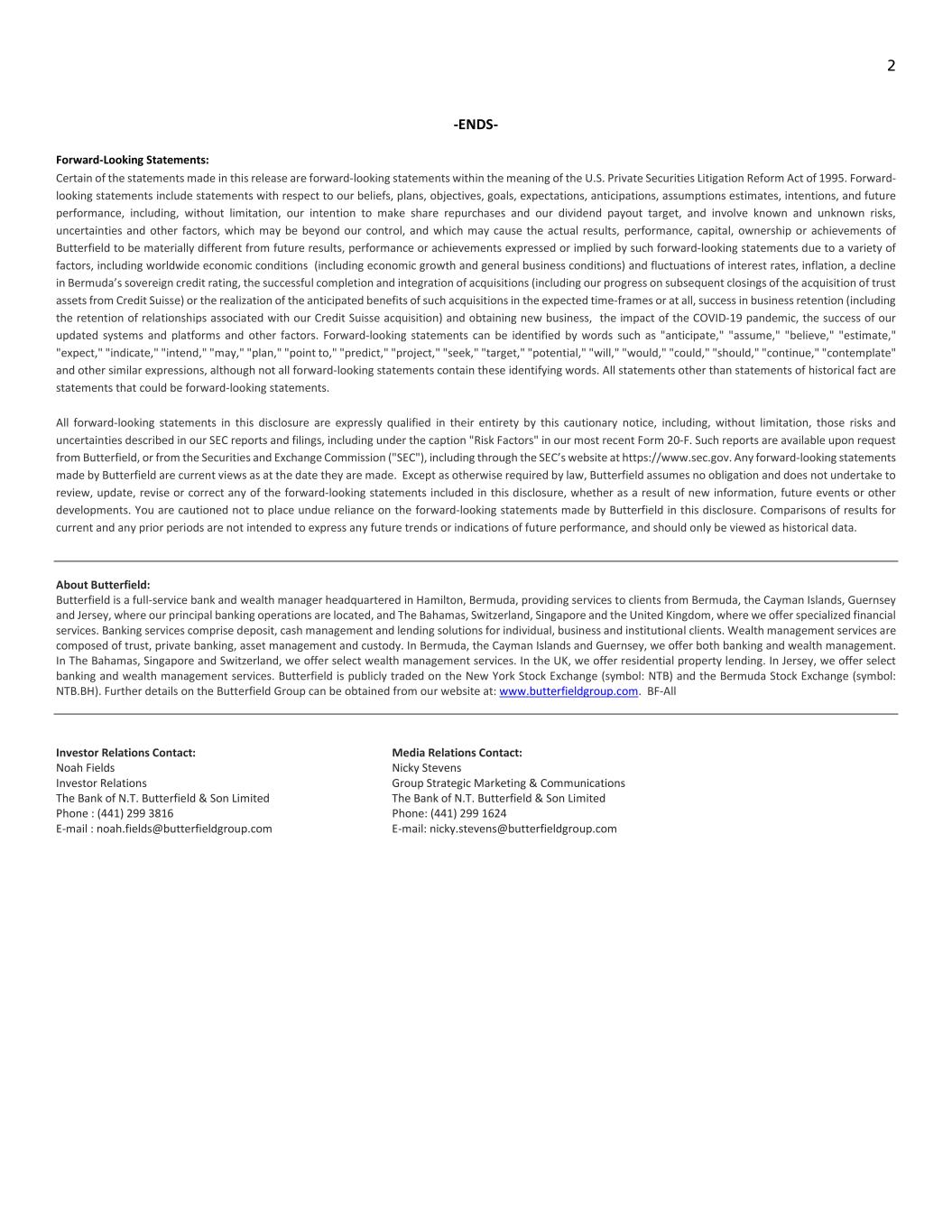 2 -ENDS- Forward-Looking Statements: Certain of the statements made in this release are forward-looking statements within the meaning of the U.S. Private Securities Litigation Reform Act of 1995. Forward- looking statements include statements with respect to our beliefs, plans, objectives, goals, expectations, anticipations, assumptions estimates, intentions, and future performance, including, without limitation, our intention to make share repurchases and our dividend payout target, and involve known and unknown risks, uncertainties and other factors, which may be beyond our control, and which may cause the actual results, performance, capital, ownership or achievements of Butterfield to be materially different from future results, performance or achievements expressed or implied by such forward-looking statements due to a variety of factors, including worldwide economic conditions (including economic growth and general business conditions) and fluctuations of interest rates, inflation, a decline in Bermuda’s sovereign credit rating, the successful completion and integration of acquisitions (including our progress on subsequent closings of the acquisition of trust assets from Credit Suisse) or the realization of the anticipated benefits of such acquisitions in the expected time-frames or at all, success in business retention (including the retention of relationships associated with our Credit Suisse acquisition) and obtaining new business, the impact of the COVID-19 pandemic, the success of our updated systems and platforms and other factors. Forward-looking statements can be identified by words such as "anticipate," "assume," "believe," "estimate," "expect," "indicate," "intend," "may," "plan," "point to," "predict," "project," "seek," "target," "potential," "will," "would," "could," "should," "continue," "contemplate" and other similar expressions, although not all forward-looking statements contain these identifying words. All statements other than statements of historical fact are statements that could be forward-looking statements. All forward-looking statements in this disclosure are expressly qualified in their entirety by this cautionary notice, including, without limitation, those risks and uncertainties described in our SEC reports and filings, including under the caption "Risk Factors" in our most recent Form 20-F. Such reports are available upon request from Butterfield, or from the Securities and Exchange Commission ("SEC"), including through the SEC’s website at https://www.sec.gov. Any forward-looking statements made by Butterfield are current views as at the date they are made. Except as otherwise required by law, Butterfield assumes no obligation and does not undertake to review, update, revise or correct any of the forward-looking statements included in this disclosure, whether as a result of new information, future events or other developments. You are cautioned not to place undue reliance on the forward-looking statements made by Butterfield in this disclosure. Comparisons of results for current and any prior periods are not intended to express any future trends or indications of future performance, and should only be viewed as historical data. About Butterfield: Butterfield is a full-service bank and wealth manager headquartered in Hamilton, Bermuda, providing services to clients from Bermuda, the Cayman Islands, Guernsey and Jersey, where our principal banking operations are located, and The Bahamas, Switzerland, Singapore and the United Kingdom, where we offer specialized financial services. Banking services comprise deposit, cash management and lending solutions for individual, business and institutional clients. Wealth management services are composed of trust, private banking, asset management and custody. In Bermuda, the Cayman Islands and Guernsey, we offer both banking and wealth management. In The Bahamas, Singapore and Switzerland, we offer select wealth management services. In the UK, we offer residential property lending. In Jersey, we offer select banking and wealth management services. Butterfield is publicly traded on the New York Stock Exchange (symbol: NTB) and the Bermuda Stock Exchange (symbol: NTB.BH). Further details on the Butterfield Group can be obtained from our website at: www.butterfieldgroup.com. BF-All Investor Relations Contact: Media Relations Contact: Noah Fields Nicky Stevens Investor Relations Group Strategic Marketing & Communications The Bank of N.T. Butterfield & Son Limited The Bank of N.T. Butterfield & Son Limited Phone : (441) 299 3816 Phone: (441) 299 1624 E-mail : noah.fields@butterfieldgroup.com E-mail: nicky.stevens@butterfieldgroup.com