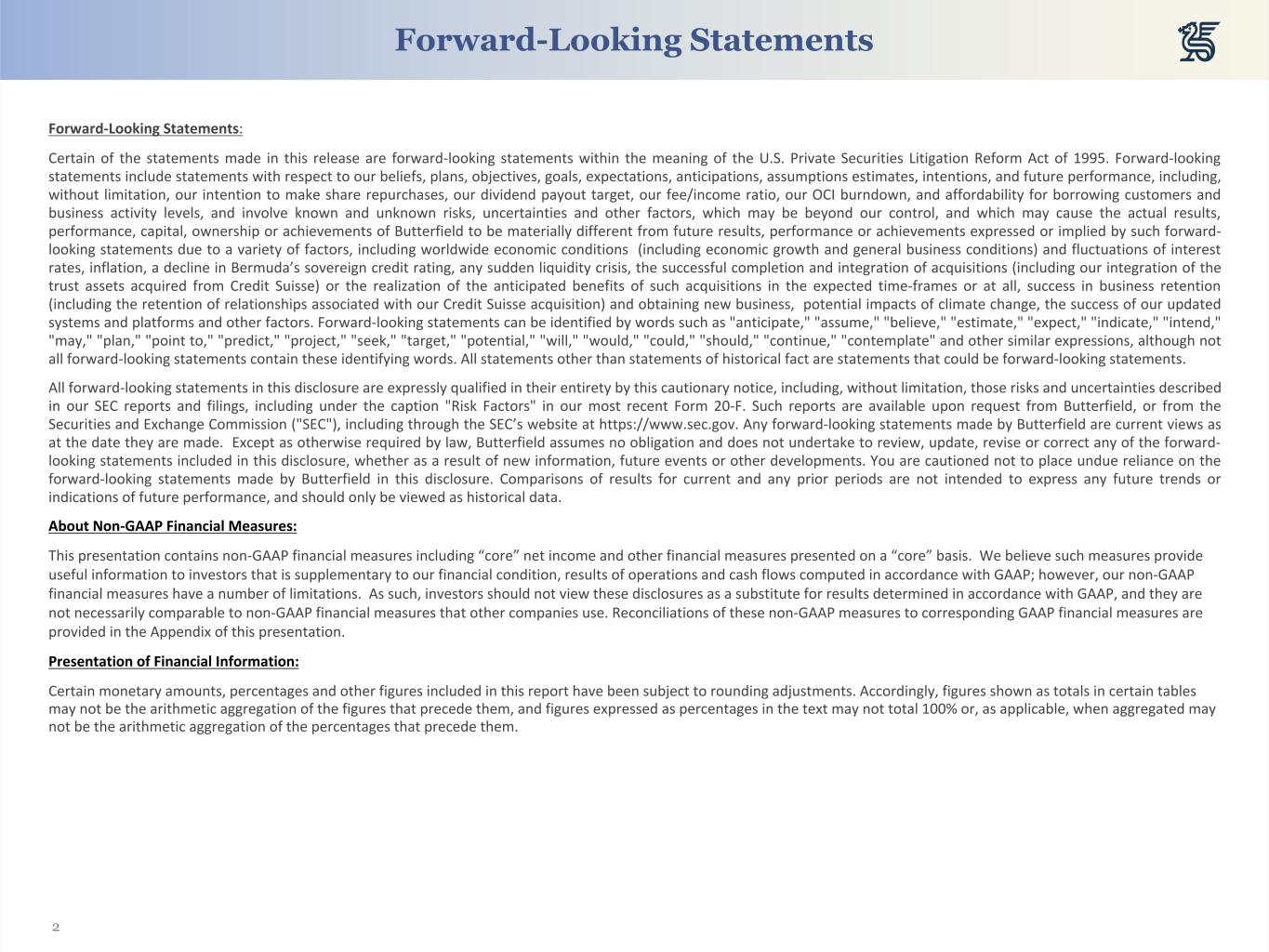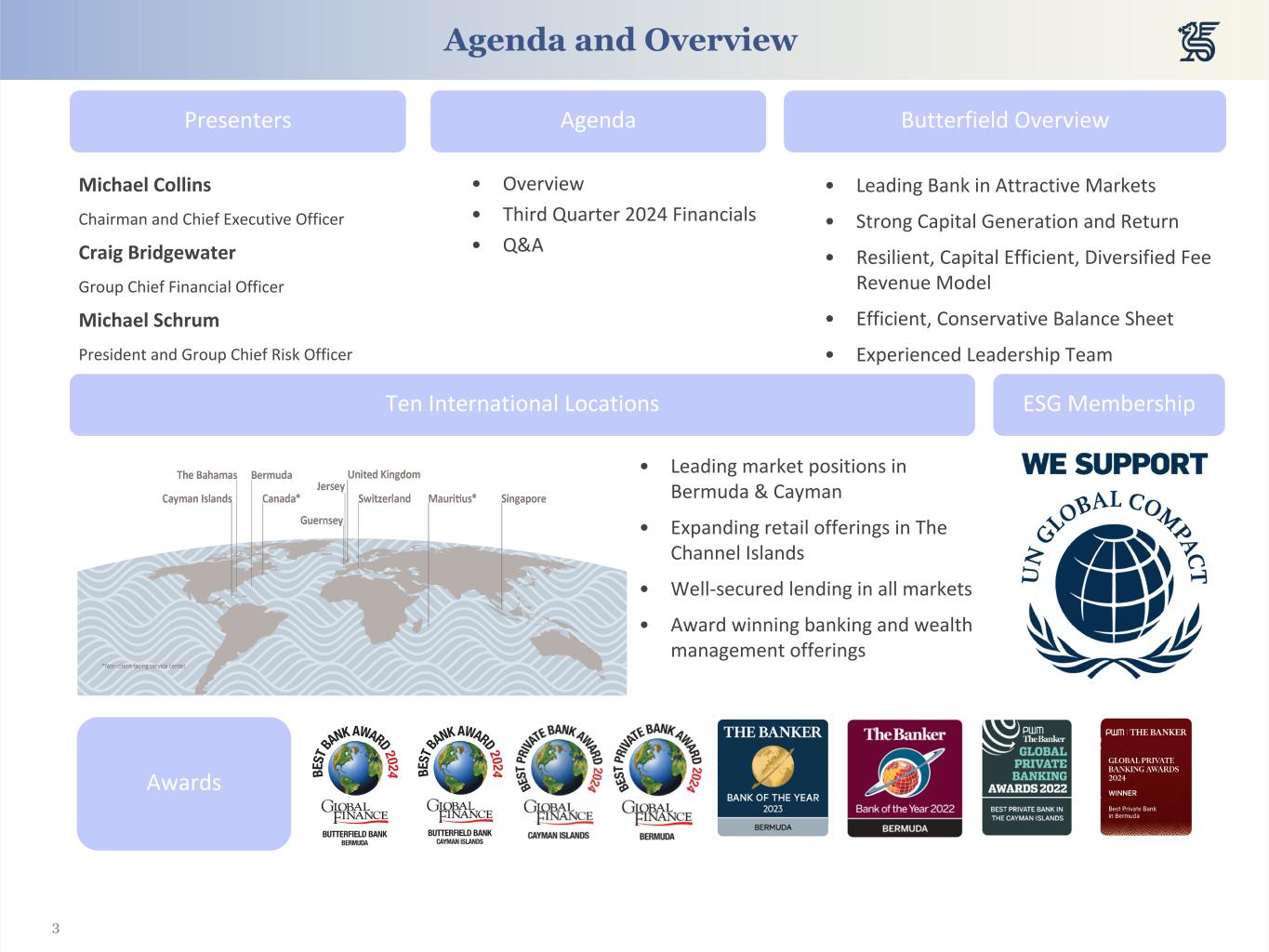 2 Forward-Looking Statements Forward-Looking Statements: Certain of the statements made in this release are forward-looking statements within the meaning of the U.S. Private Securities Litigation Reform Act of 1995. Forward-looking statements include statements with respect to our beliefs, plans, objectives, goals, expectations, anticipations, assumptions estimates, intentions, and future performance, including, without limitation, our intention to make share repurchases, our dividend payout target, our fee/income ratio, our OCI burndown, and affordability for borrowing customers and business activity levels, and involve known and unknown risks, uncertainties and other factors, which may be beyond our control, and which may cause the actual results, performance, capital, ownership or achievements of Butterfield to be materially different from future results, performance or achievements expressed or implied by such forward- looking statements due to a variety of factors, including worldwide economic conditions (including economic growth and general business conditions) and fluctuations of interest rates, inflation, a decline in Bermuda’s sovereign credit rating, any sudden liquidity crisis, the successful completion and integration of acquisitions (including our integration of the trust assets acquired from Credit Suisse) or the realization of the anticipated benefits of such acquisitions in the expected time-frames or at all, success in business retention (including the retention of relationships associated with our Credit Suisse acquisition) and obtaining new business, potential impacts of climate change, the success of our updated systems and platforms and other factors. Forward-looking statements can be identified by words such as "anticipate," "assume," "believe," "estimate," "expect," "indicate," "intend," "may," "plan," "point to," "predict," "project," "seek," "target," "potential," "will," "would," "could," "should," "continue," "contemplate" and other similar expressions, although not all forward-looking statements contain these identifying words. All statements other than statements of historical fact are statements that could be forward-looking statements. All forward-looking statements in this disclosure are expressly qualified in their entirety by this cautionary notice, including, without limitation, those risks and uncertainties described in our SEC reports and filings, including under the caption "Risk Factors" in our most recent Form 20-F. Such reports are available upon request from Butterfield, or from the Securities and Exchange Commission ("SEC"), including through the SEC’s website at https://www.sec.gov. Any forward-looking statements made by Butterfield are current views as at the date they are made. Except as otherwise required by law, Butterfield assumes no obligation and does not undertake to review, update, revise or correct any of the forward- looking statements included in this disclosure, whether as a result of new information, future events or other developments. You are cautioned not to place undue reliance on the forward-looking statements made by Butterfield in this disclosure. Comparisons of results for current and any prior periods are not intended to express any future trends or indications of future performance, and should only be viewed as historical data. About Non-GAAP Financial Measures: This presentation contains non-GAAP financial measures including “core” net income and other financial measures presented on a “core” basis. We believe such measures provide useful information to investors that is supplementary to our financial condition, results of operations and cash flows computed in accordance with GAAP; however, our non-GAAP financial measures have a number of limitations. As such, investors should not view these disclosures as a substitute for results determined in accordance with GAAP, and they are not necessarily comparable to non-GAAP financial measures that other companies use. Reconciliations of these non-GAAP measures to corresponding GAAP financial measures are provided in the Appendix of this presentation. Presentation of Financial Information: Certain monetary amounts, percentages and other figures included in this report have been subject to rounding adjustments. Accordingly, figures shown as totals in certain tables may not be the arithmetic aggregation of the figures that precede them, and figures expressed as percentages in the text may not total 100% or, as applicable, when aggregated may not be the arithmetic aggregation of the percentages that precede them.