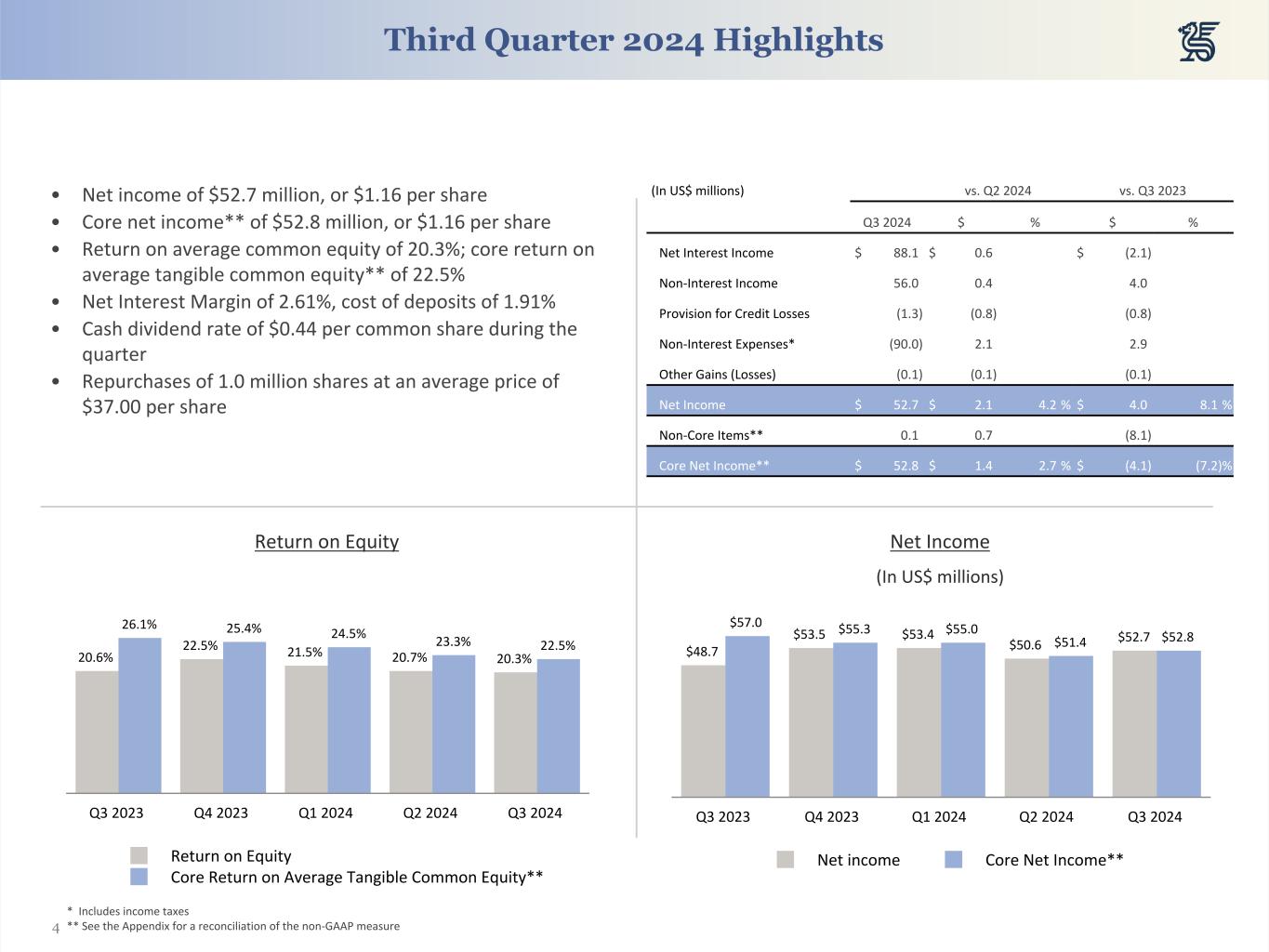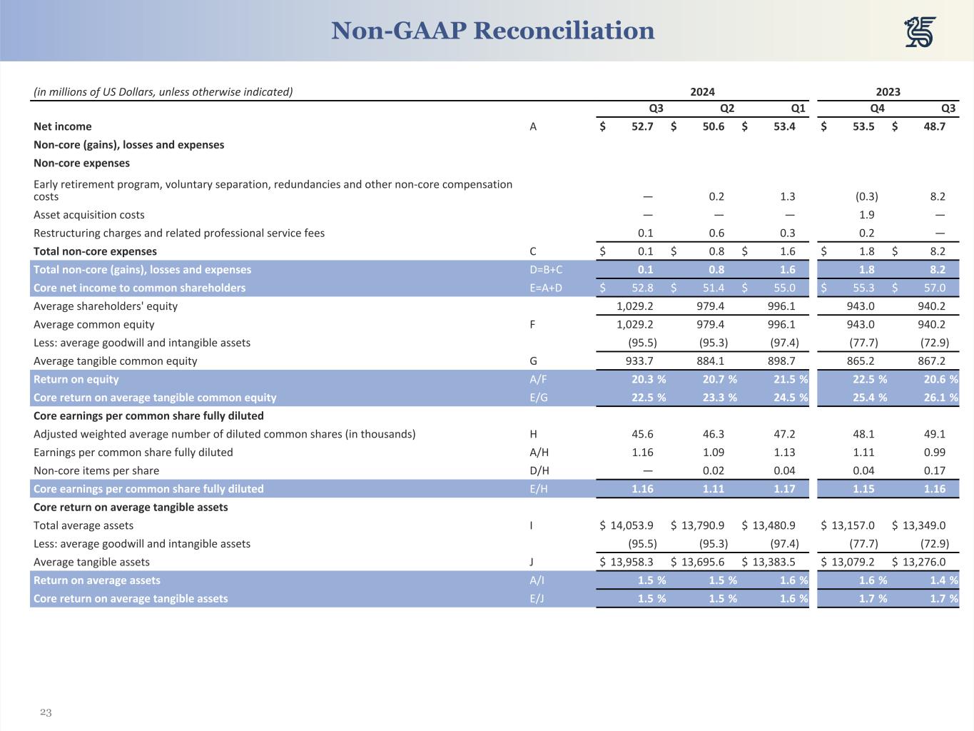 23 (in millions of US Dollars, unless otherwise indicated) 2024 2023 Q3 Q2 Q1 Q4 Q3 Net income A $ 52.7 $ 50.6 $ 53.4 $ 53.5 $ 48.7 Non-core (gains), losses and expenses Non-core expenses Early retirement program, voluntary separation, redundancies and other non-core compensation costs — 0.2 1.3 (0.3) 8.2 Asset acquisition costs — — — 1.9 — Restructuring charges and related professional service fees 0.1 0.6 0.3 0.2 — Total non-core expenses C $ 0.1 $ 0.8 $ 1.6 $ 1.8 $ 8.2 Total non-core (gains), losses and expenses D=B+C 0.1 0.8 1.6 1.8 8.2 Core net income to common shareholders E=A+D $ 52.8 $ 51.4 $ 55.0 $ 55.3 $ 57.0 Average shareholders' equity 1,029.2 979.4 996.1 943.0 940.2 Average common equity F 1,029.2 979.4 996.1 943.0 940.2 Less: average goodwill and intangible assets (95.5) (95.3) (97.4) (77.7) (72.9) Average tangible common equity G 933.7 884.1 898.7 865.2 867.2 Return on equity A/F 20.3 % 20.7 % 21.5 % 22.5 % 20.6 % Core return on average tangible common equity E/G 22.5 % 23.3 % 24.5 % 25.4 % 26.1 % Core earnings per common share fully diluted Adjusted weighted average number of diluted common shares (in thousands) H 45.6 46.3 47.2 48.1 49.1 Earnings per common share fully diluted A/H 1.16 1.09 1.13 1.11 0.99 Non-core items per share D/H — 0.02 0.04 0.04 0.17 Core earnings per common share fully diluted E/H 1.16 1.11 1.17 1.15 1.16 Core return on average tangible assets Total average assets I $ 14,053.9 $ 13,790.9 $ 13,480.9 $ 13,157.0 $ 13,349.0 Less: average goodwill and intangible assets (95.5) (95.3) (97.4) (77.7) (72.9) Average tangible assets J $ 13,958.3 $ 13,695.6 $ 13,383.5 $ 13,079.2 $ 13,276.0 Return on average assets A/I 1.5 % 1.5 % 1.6 % 1.6 % 1.4 % Core return on average tangible assets E/J 1.5 % 1.5 % 1.6 % 1.7 % 1.7 % Non-GAAP Reconciliation