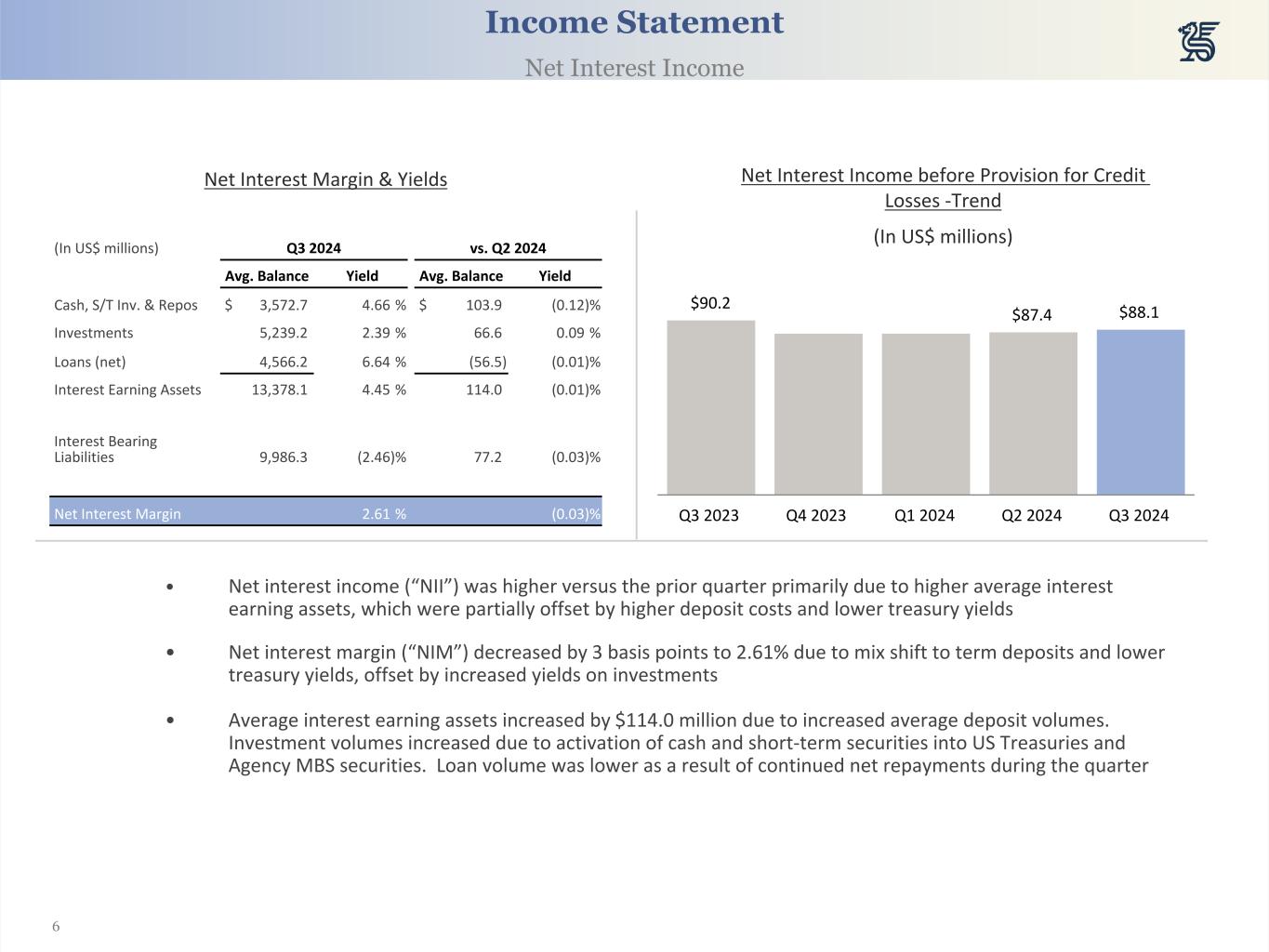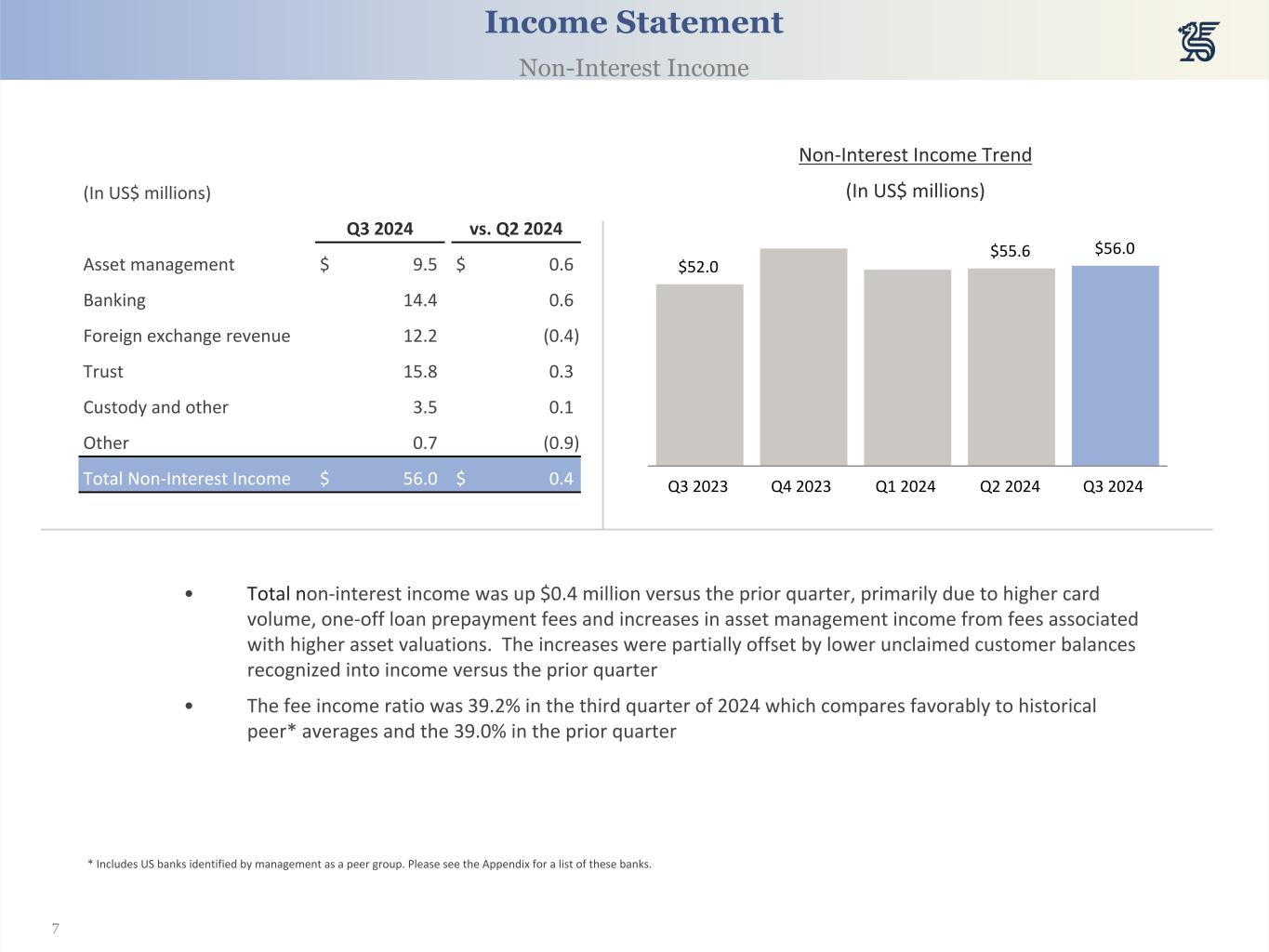 6 Net Interest Income before Provision for Credit Losses -Trend (In US$ millions) $90.2 $87.4 $88.1 Q3 2023 Q4 2023 Q1 2024 Q2 2024 Q3 2024 Net Interest Margin & Yields Income Statement Net Interest Income • Net interest income (“NII”) was higher versus the prior quarter primarily due to higher average interest earning assets, which were partially offset by higher deposit costs and lower treasury yields • Net interest margin (“NIM”) decreased by 3 basis points to 2.61% due to mix shift to term deposits and lower treasury yields, offset by increased yields on investments • Average interest earning assets increased by $114.0 million due to increased average deposit volumes. Investment volumes increased due to activation of cash and short-term securities into US Treasuries and Agency MBS securities. Loan volume was lower as a result of continued net repayments during the quarter (In US$ millions) Q3 2024 vs. Q2 2024 Avg. Balance Yield Avg. Balance Yield Cash, S/T Inv. & Repos $ 3,572.7 4.66 % $ 103.9 (0.12) % Investments 5,239.2 2.39 % 66.6 0.09 % Loans (net) 4,566.2 6.64 % (56.5) (0.01) % Interest Earning Assets 13,378.1 4.45 % 114.0 (0.01) % Interest Bearing Liabilities 9,986.3 (2.46) % 77.2 (0.03) % Net Interest Margin 2.61 % (0.03) %