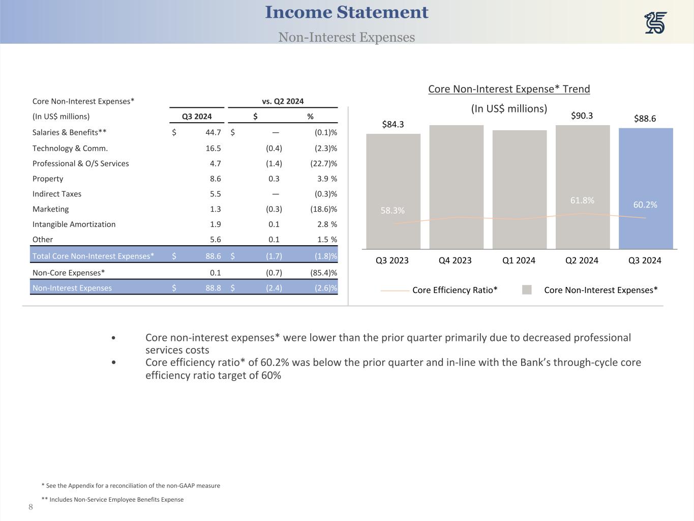 7 Non-Interest Income Trend (In US$ millions)(In US$ millions) Q3 2024 vs. Q2 2024 Asset management $ 9.5 $ 0.6 Banking 14.4 0.6 Foreign exchange revenue 12.2 (0.4) Trust 15.8 0.3 Custody and other 3.5 0.1 Other 0.7 (0.9) Total Non-Interest Income $ 56.0 $ 0.4 $52.0 $55.6 $56.0 Q3 2023 Q4 2023 Q1 2024 Q2 2024 Q3 2024 • Total non-interest income was up $0.4 million versus the prior quarter, primarily due to higher card volume, one-off loan prepayment fees and increases in asset management income from fees associated with higher asset valuations. The increases were partially offset by lower unclaimed customer balances recognized into income versus the prior quarter • The fee income ratio was 39.2% in the third quarter of 2024 which compares favorably to historical peer* averages and the 39.0% in the prior quarter Income Statement Non-Interest Income * Includes US banks identified by management as a peer group. Please see the Appendix for a list of these banks.